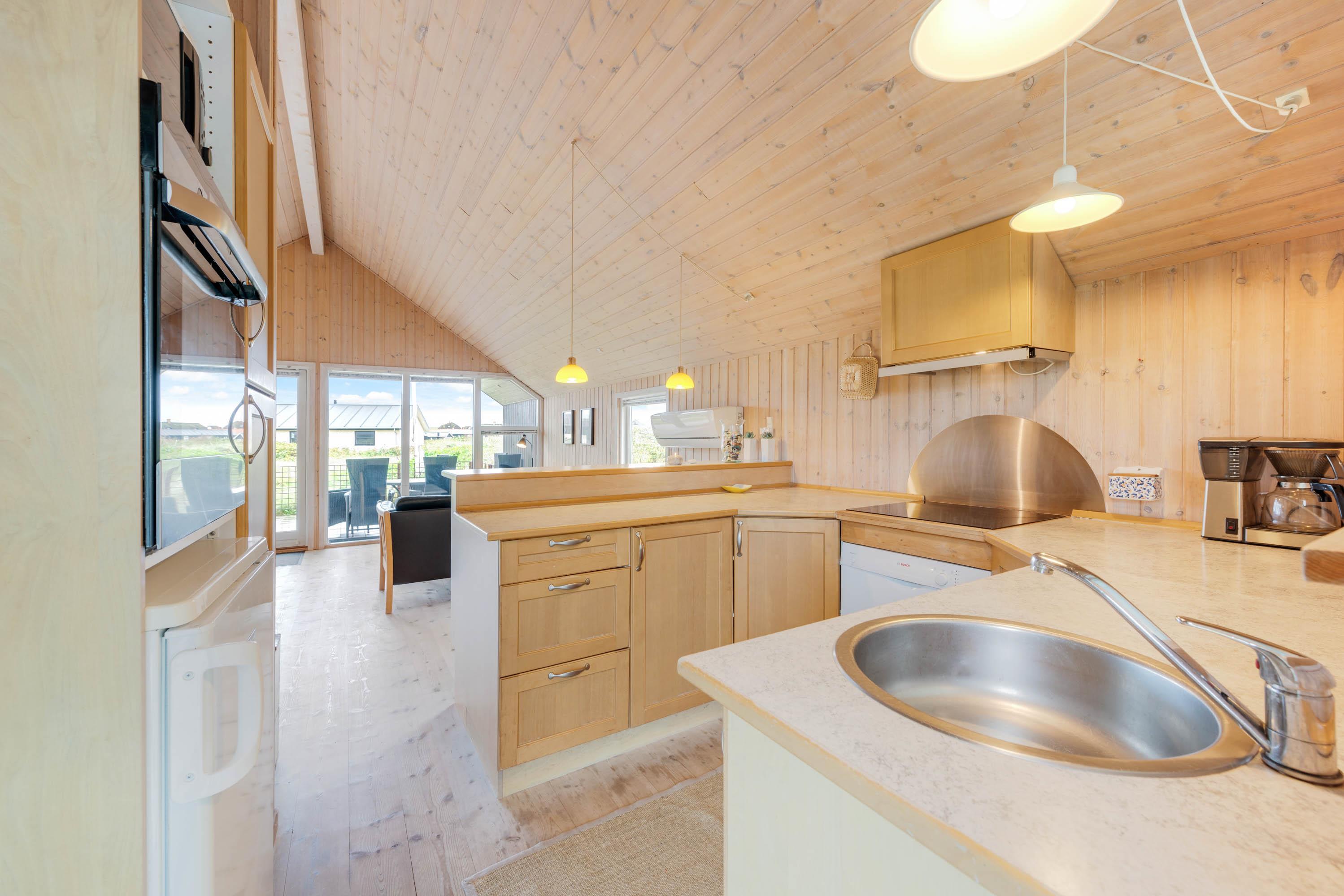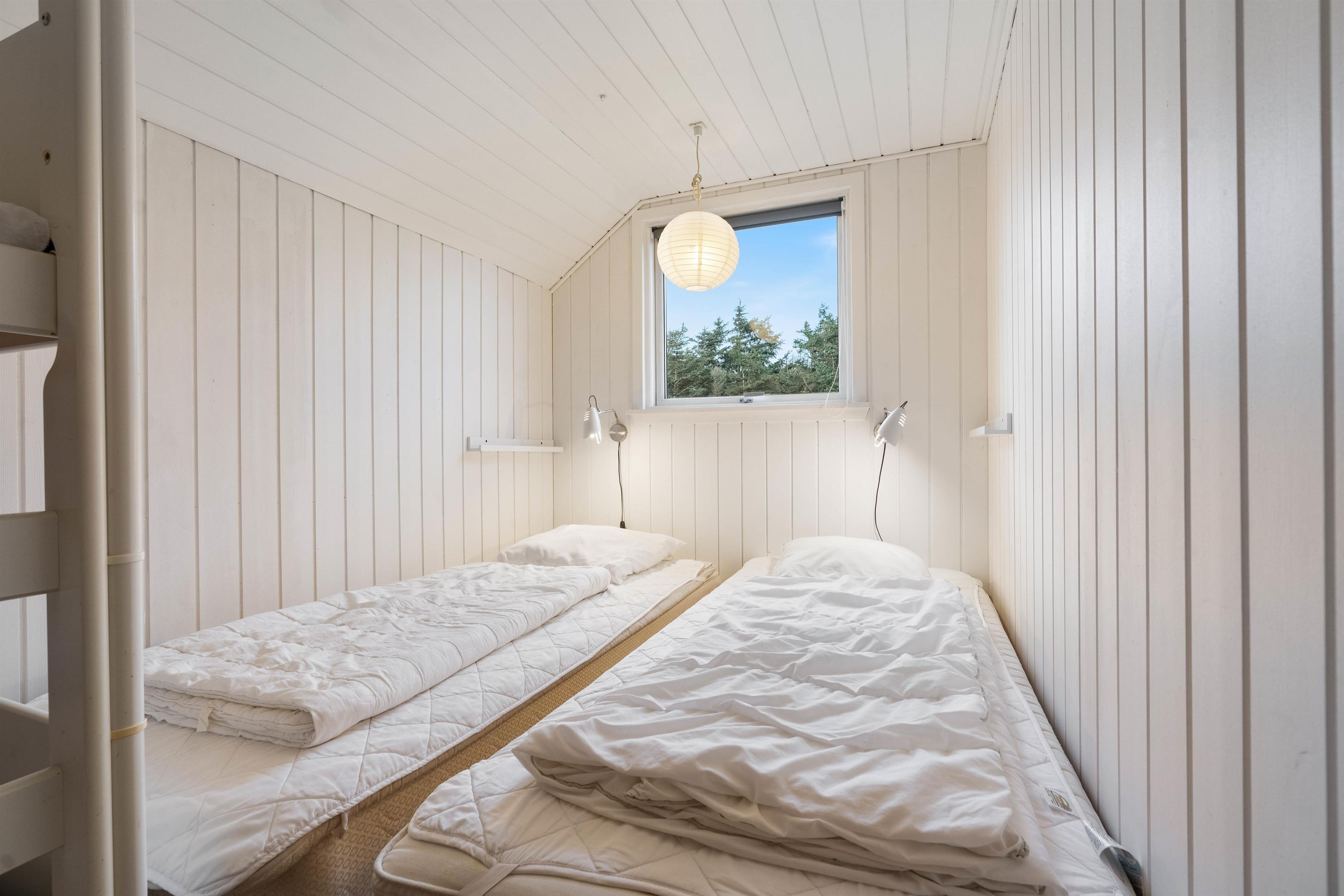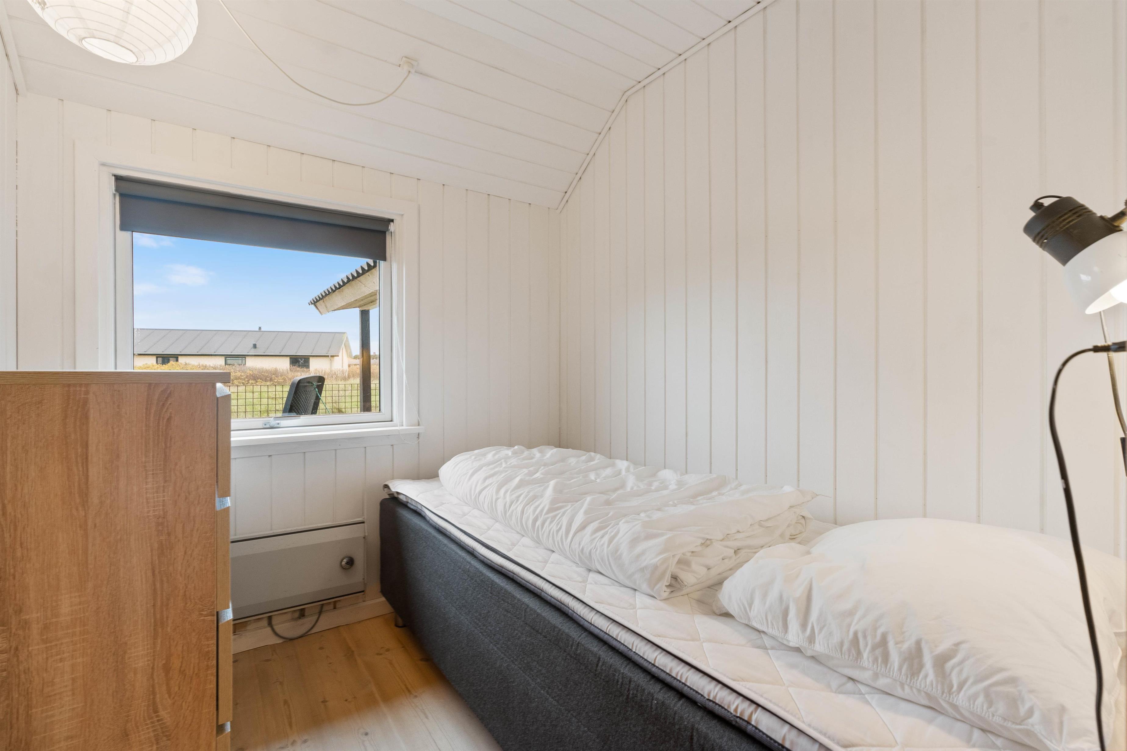Et godt og hyggeligt sommerhus i Søndervig bygget i træ og med loft til kip, samt en god indretning. Der er tre soveværelser i sommerhuset, det ene værelse har en enkelt seng, derudover er der et værelse med to senge og endelig et værelse med to senge og to køjesenge i.
