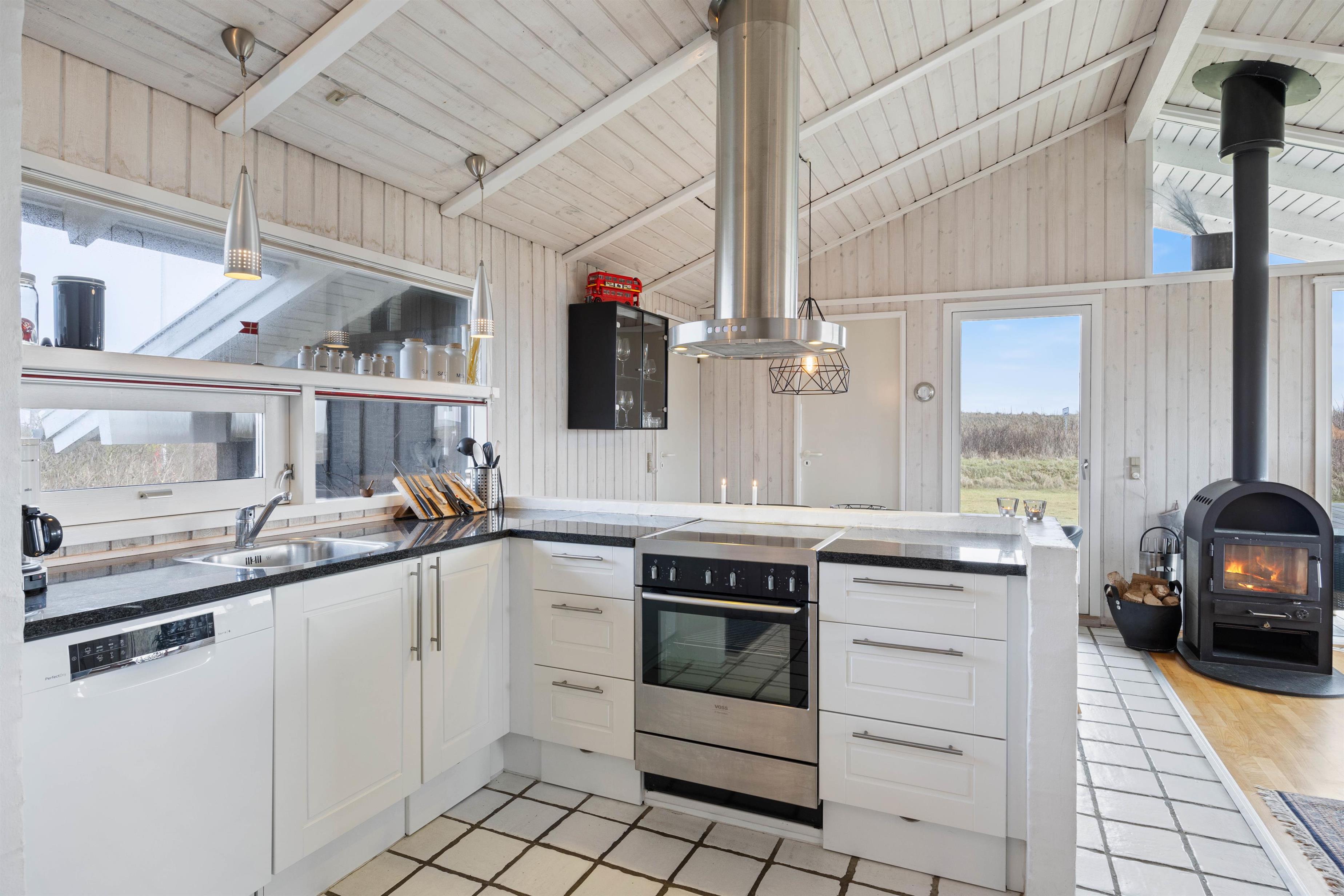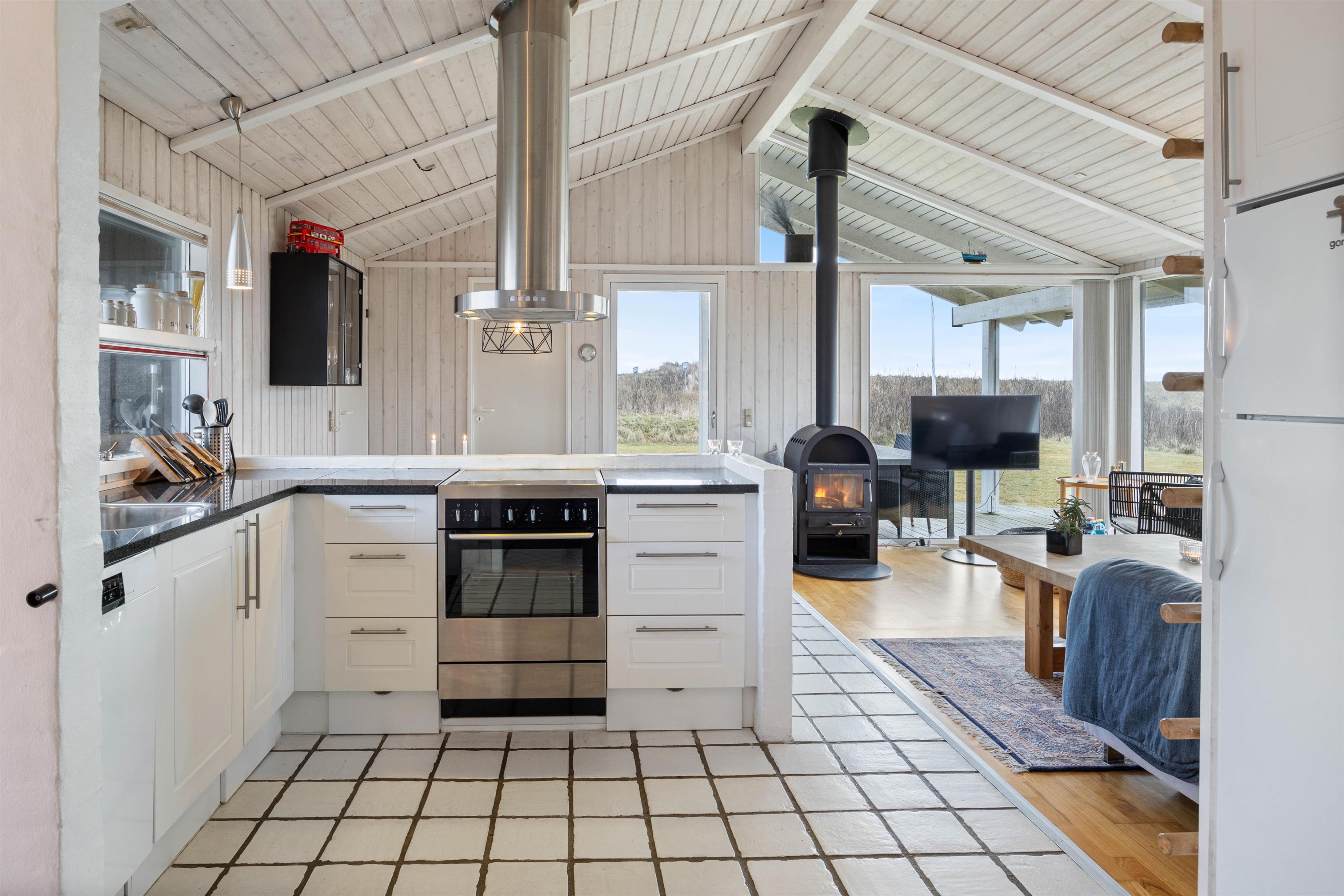 Jeres samlingspunkt på ferien bliver uden tvivl det store og lyse alrum, hvor køkken med opvaskemaskine, spisestue og stue er forenet. Mange hyggelige feriestunder med mad, spil og film vil med garanti finde sted her. I alrummet er der også en hems, som bliver et sikkert hit hos feriens yngste gæster. Brændeovnen sætter prikken over i’et for sommerhusstemningen.