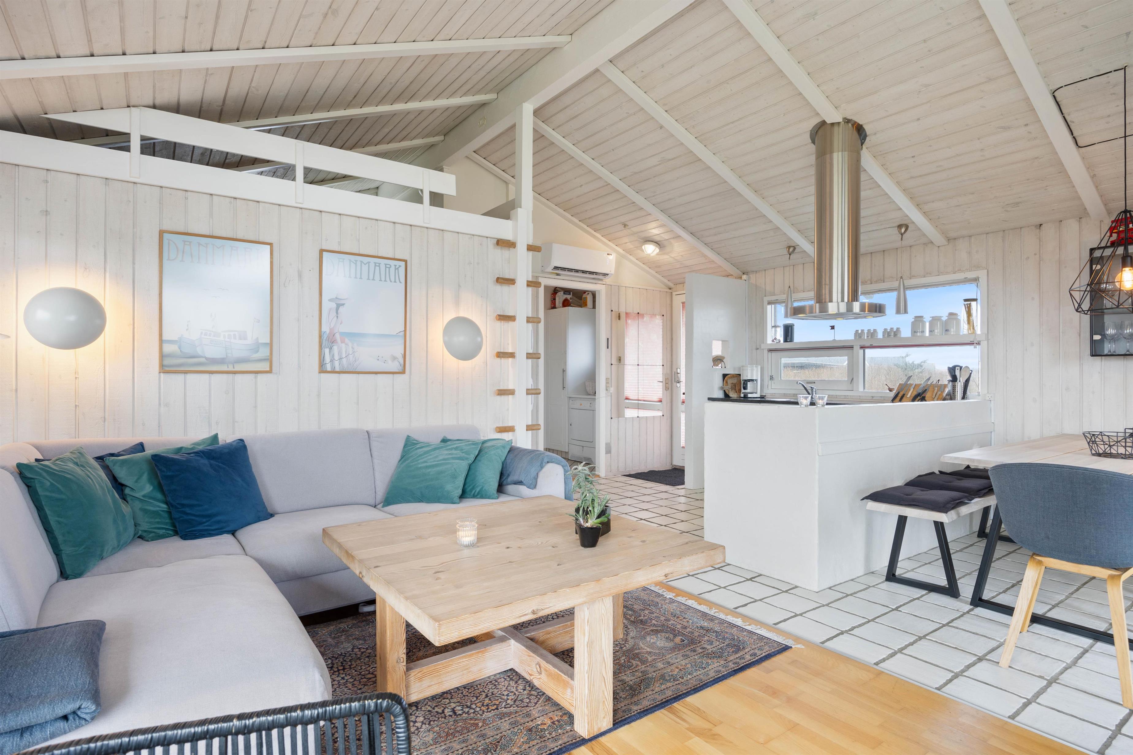 Gennem hele sommerhuset vil I møde en lys og moderne indretning, hvor de lyse trævægge, loft til kip og det store lysindfald danner rammerne for en hyggelige ferieatmosfære – I vil straks føle jer hjemme i disse dejlige omgivelser.