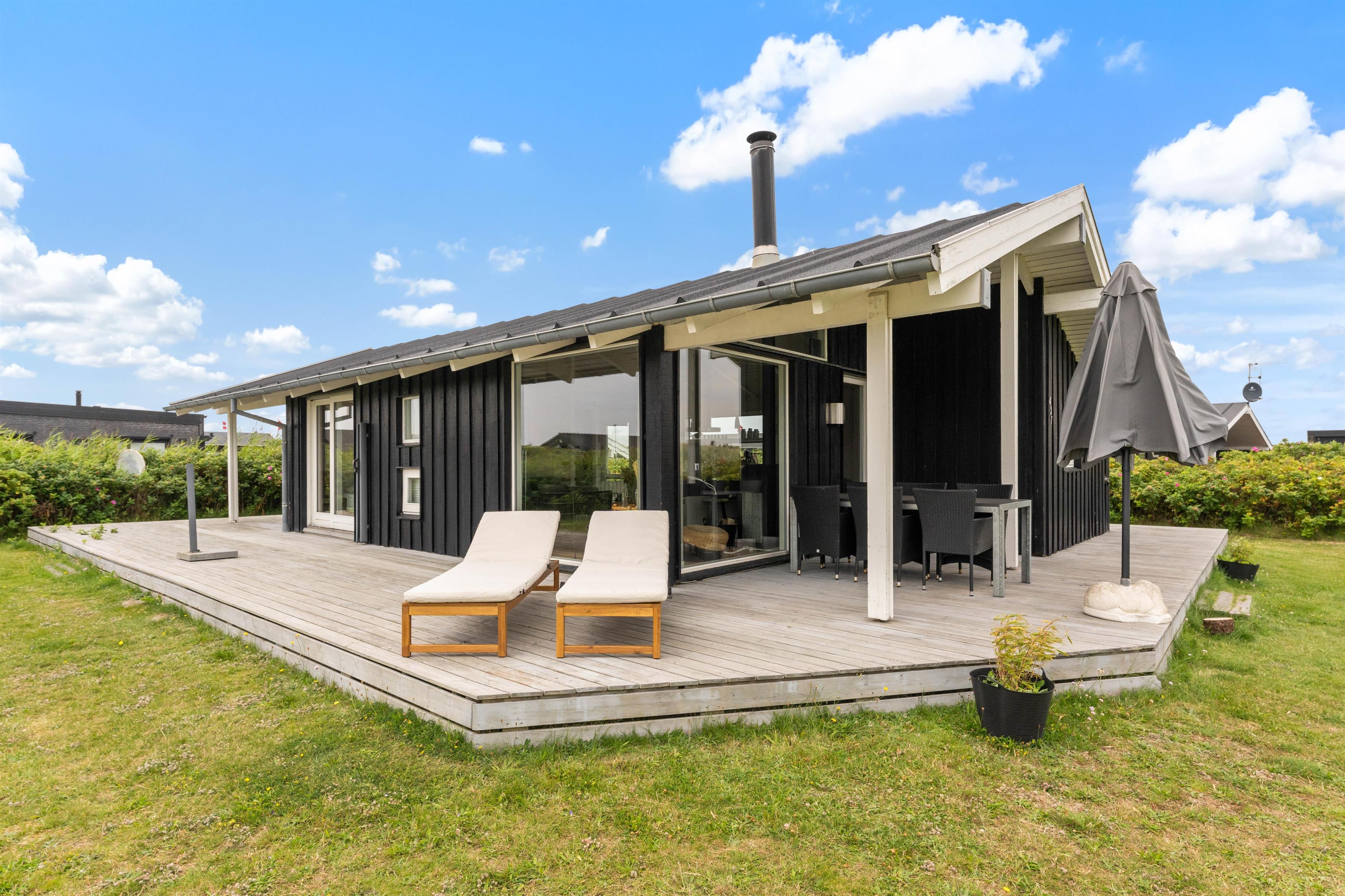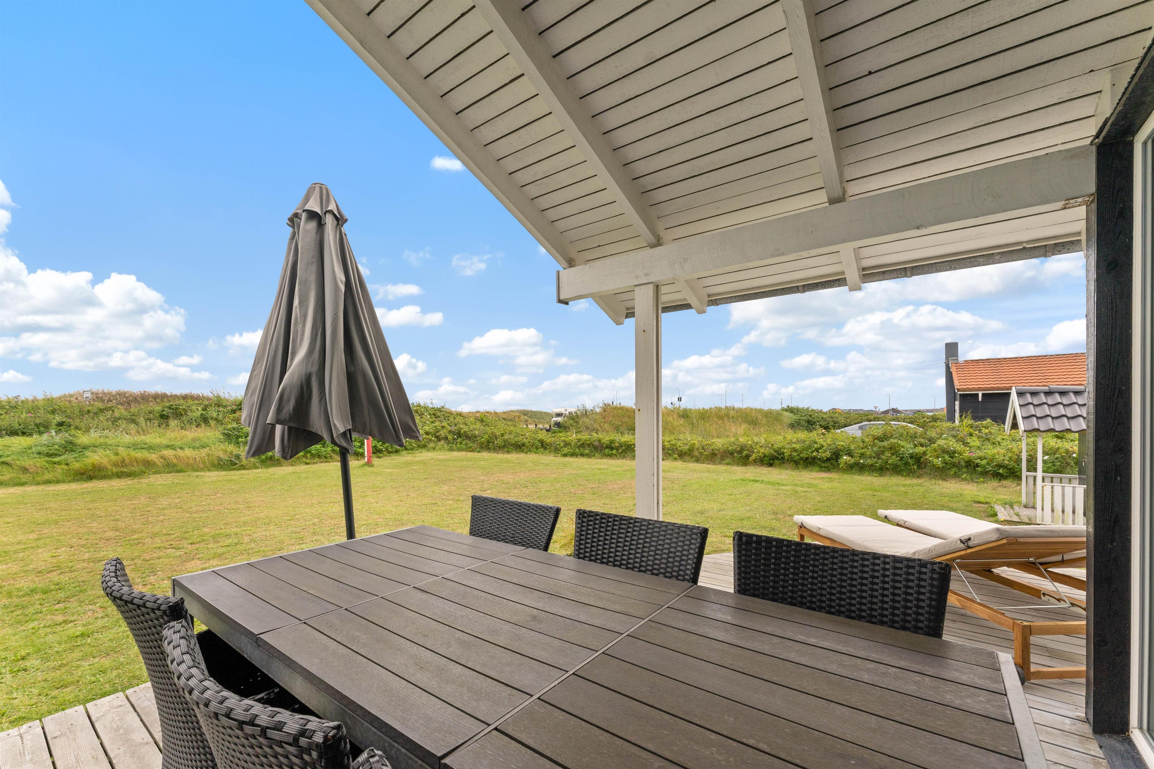 Rundt om sommerhuset løber en stor delvist overdækket terrasse. Her vil I hele dagen lang kunne finde jer en god plads i solen, hvor I kan gøre jeg tilpas i havemøbler og liggestole. Trænger I til en stund i skyggen, kan I rykke ind under den overdækkede del af terrassen.