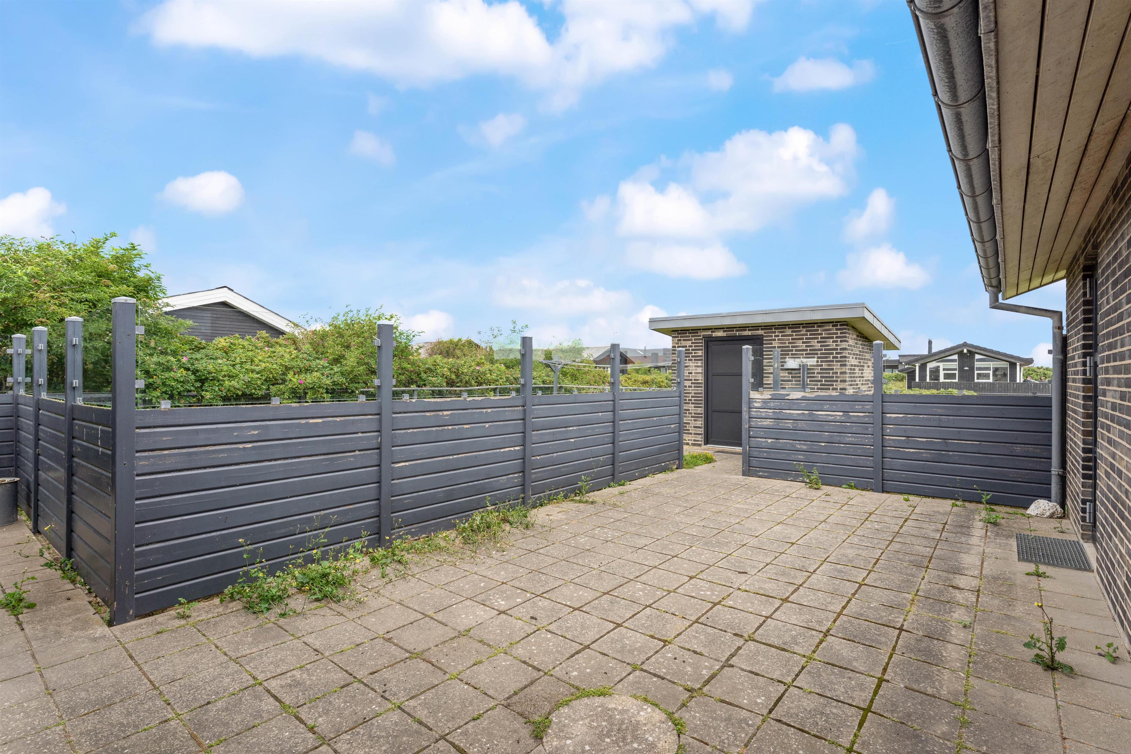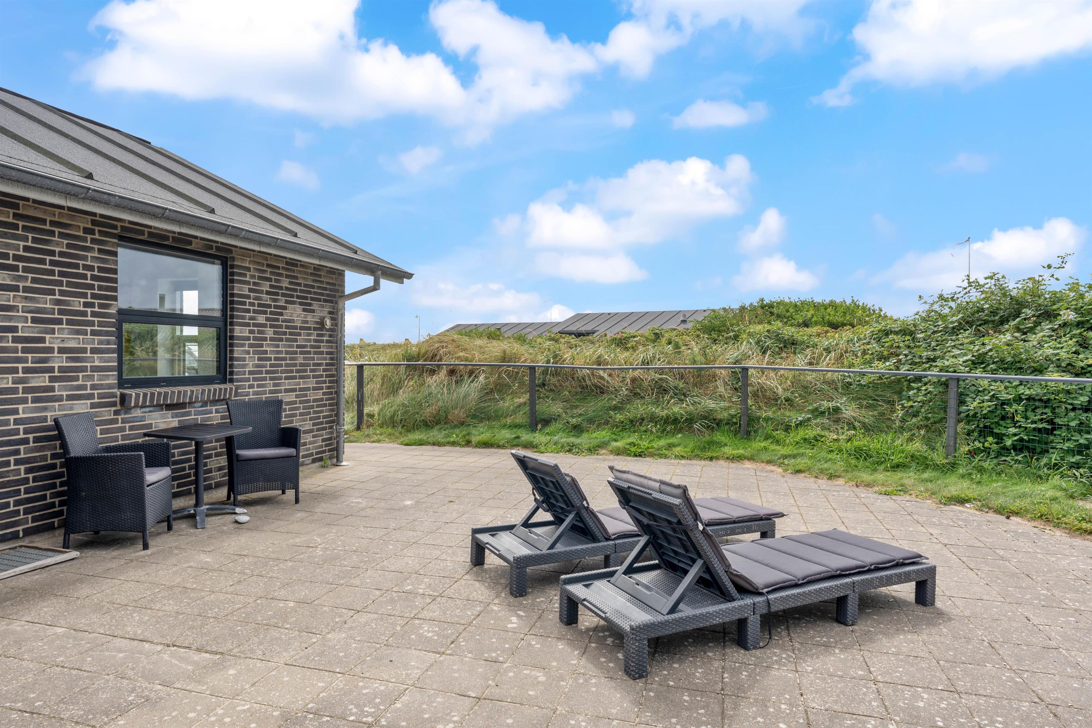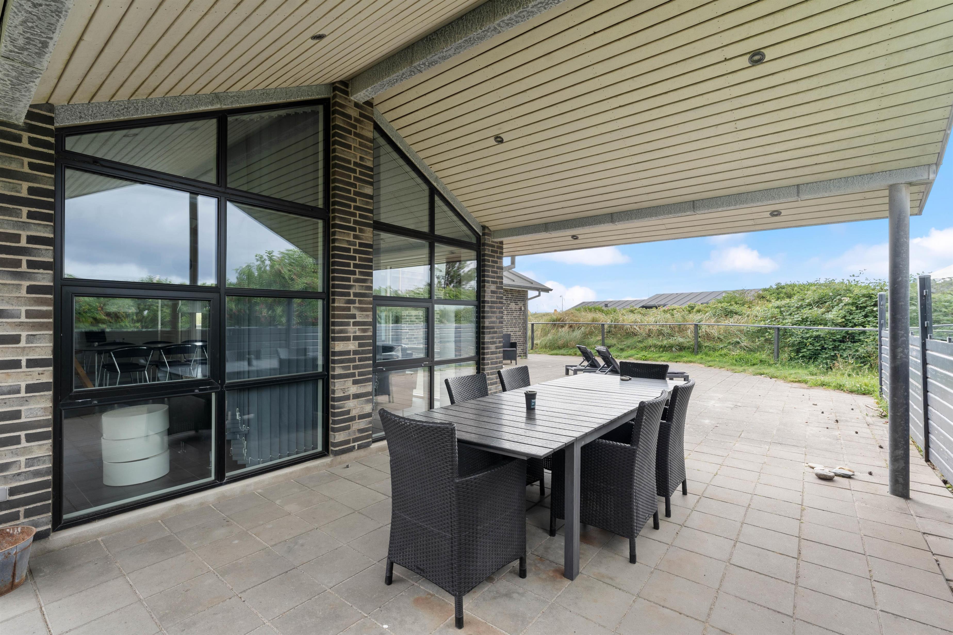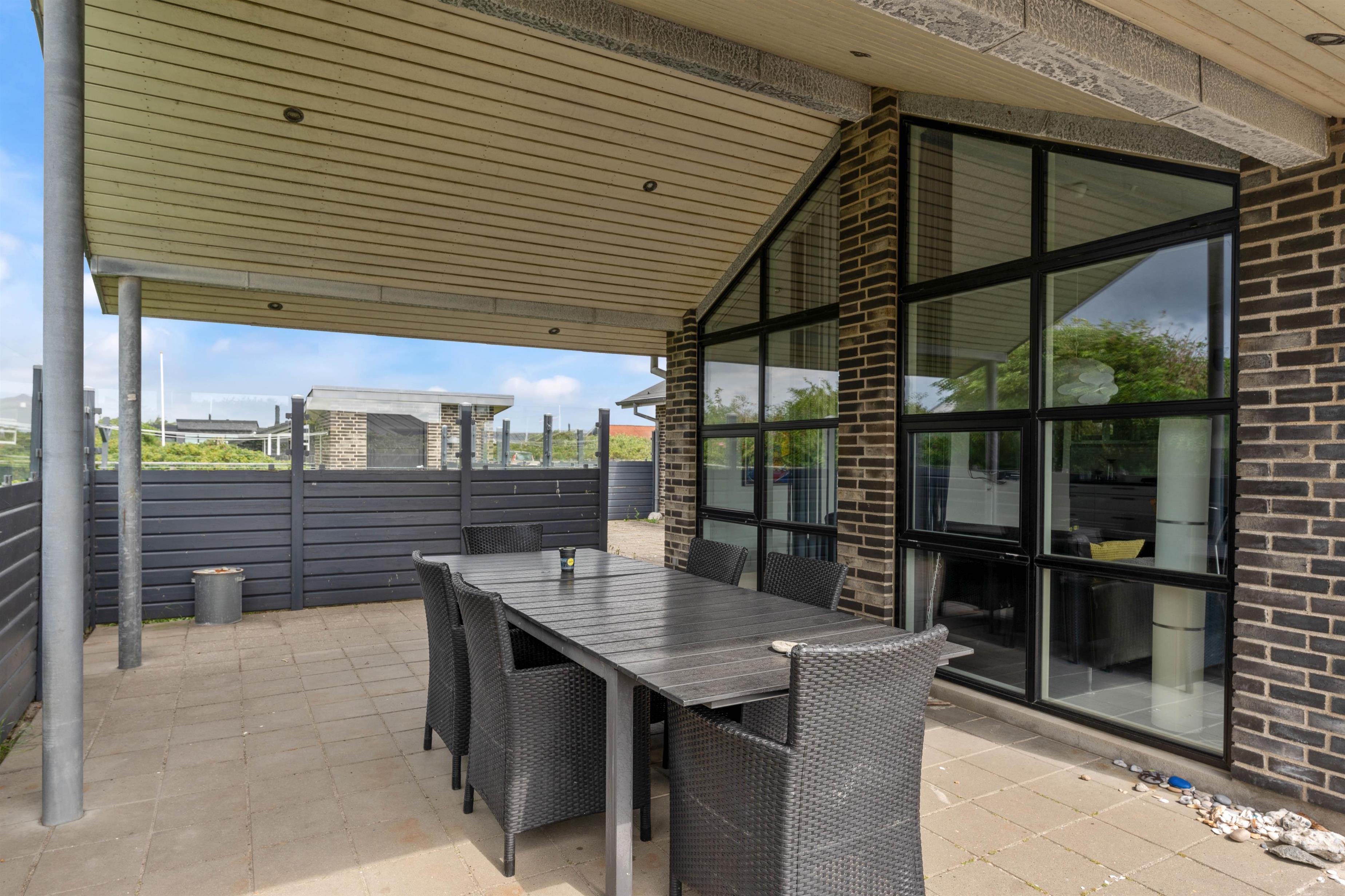 Om sommeren er husets terrasse en forlængelse af stuen. Her kan I sidde afskærmet og nyde solen, den salte luft og roen. Terrassen er oplagt til hyggelige middage, afslapning på langs og leg. En del af terrassen er overdækket. Her er der skabt en hyggelig oase, som skærmer for regn og dug, og som holder på varmen på en skøn sommeraften. Det betyder, at terrassen kan benyttes allerede fra det tidlige forår og langt ud i efteråret. Havemøblerne bliver ikke våde, og der kan grilles langt ud på sæsonen. Den indhegnede grund er ideel for børnefamilier og dyreejere, da det er tilladt i huset at tage op til to husdyr med