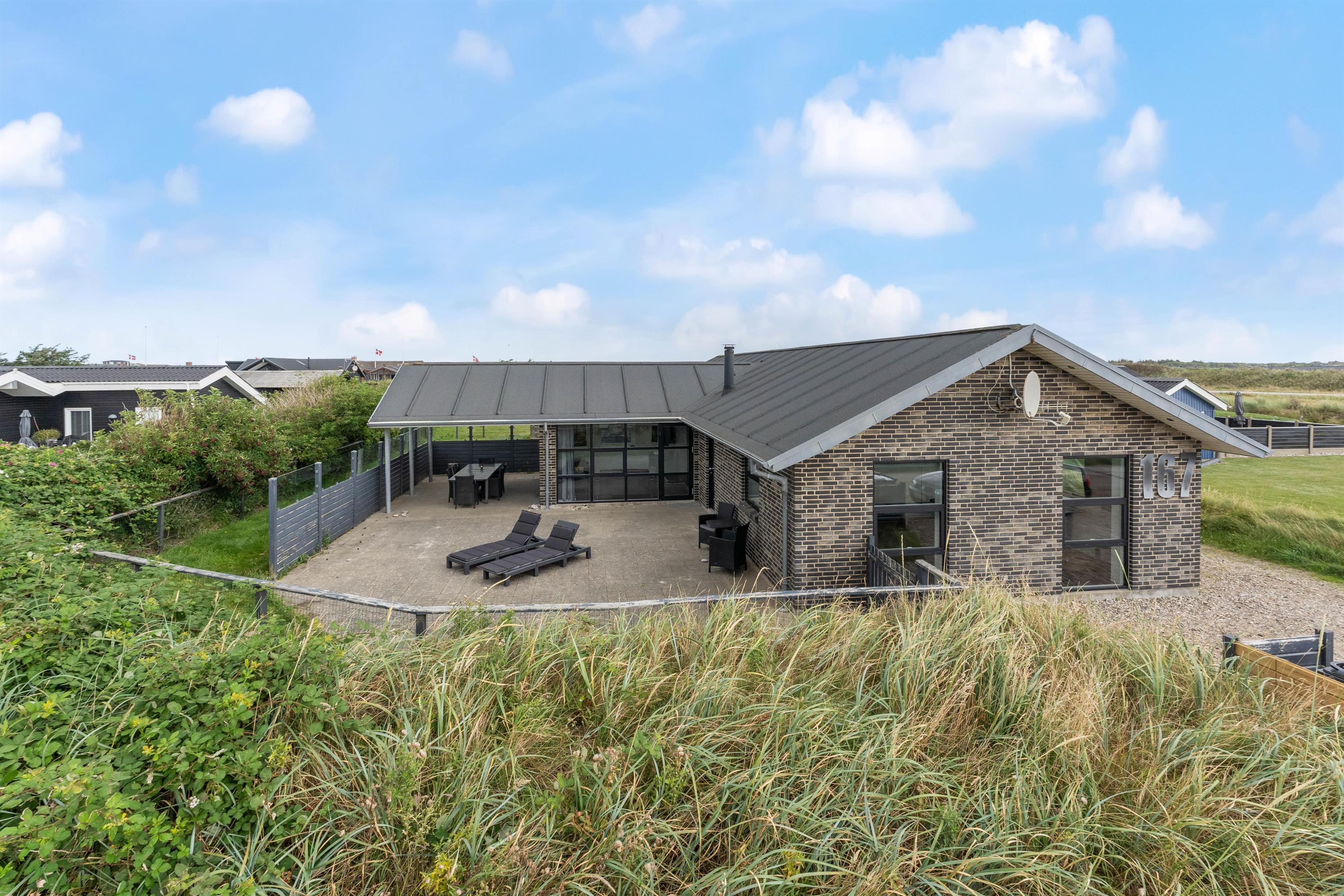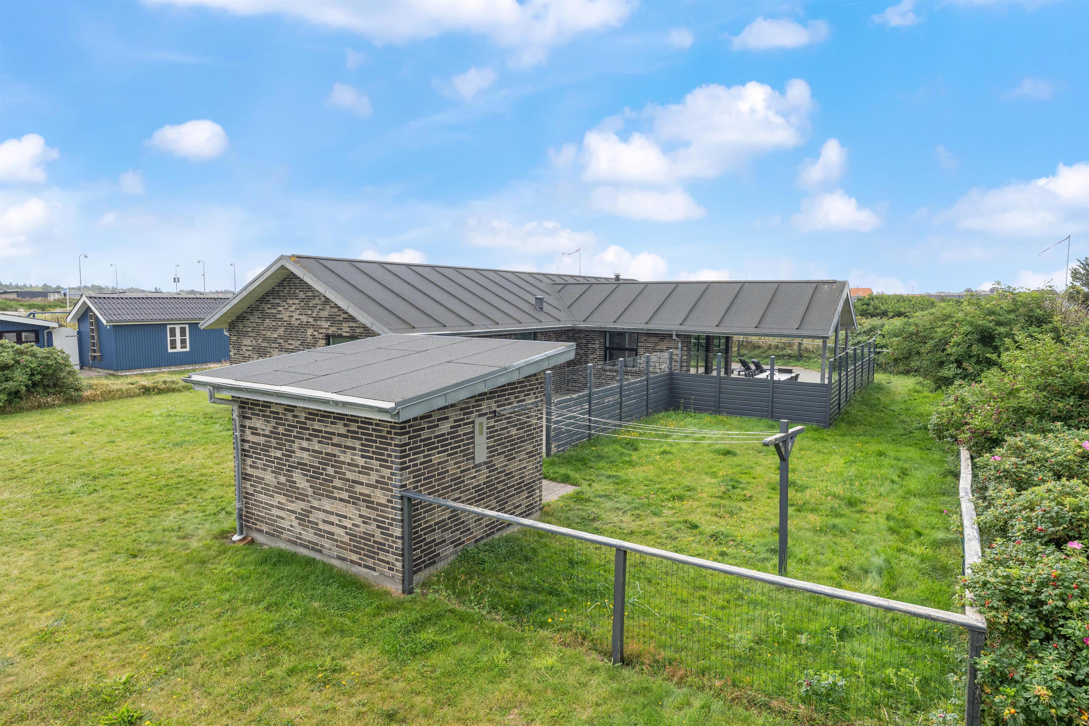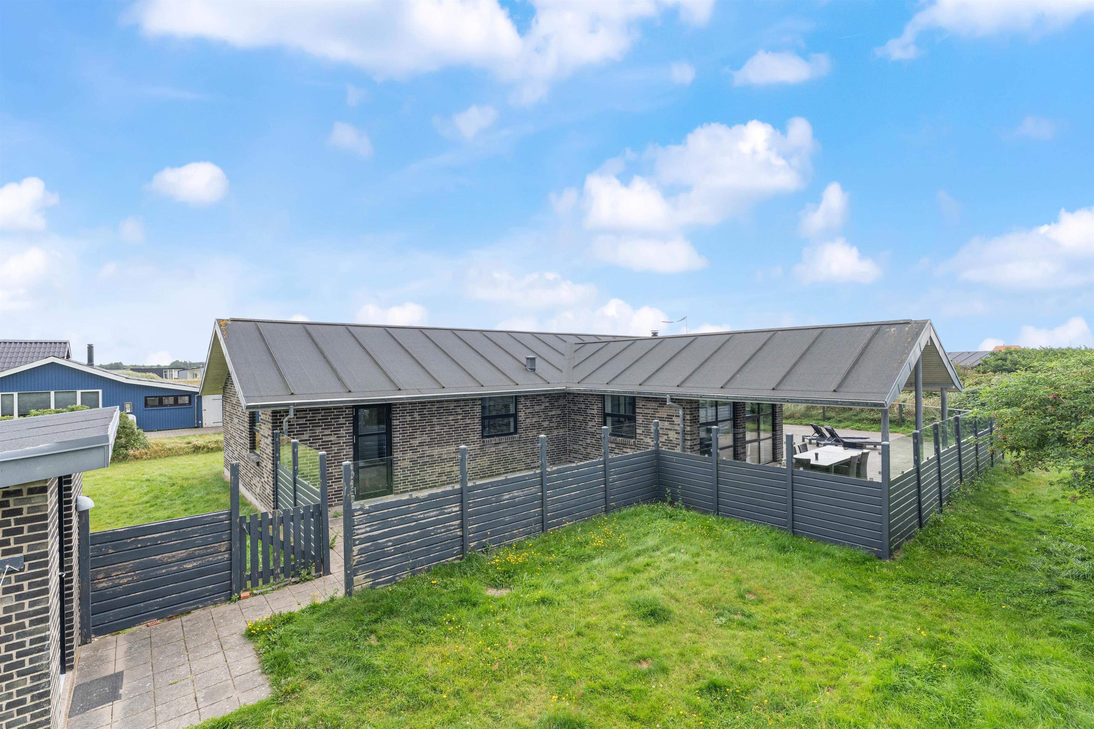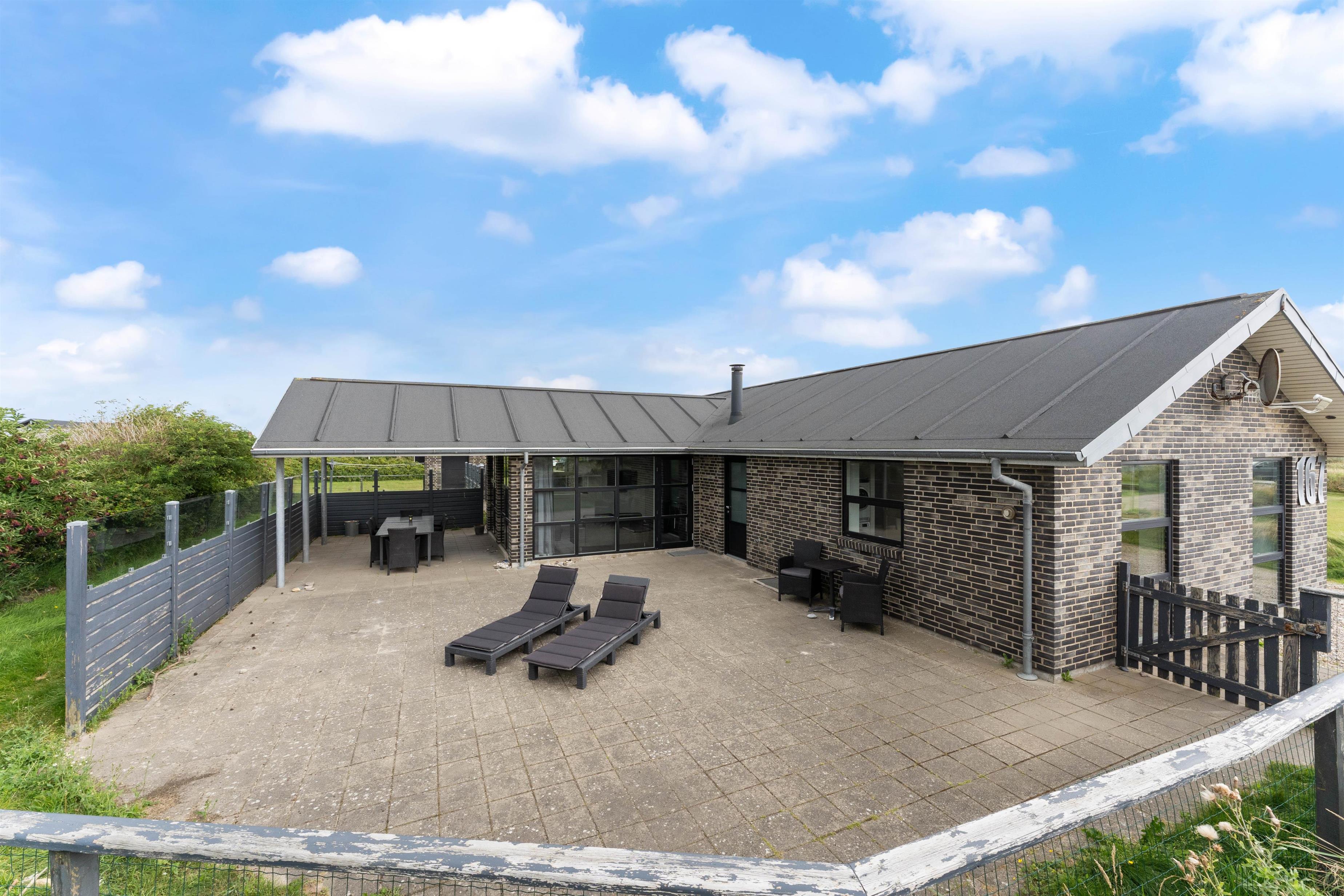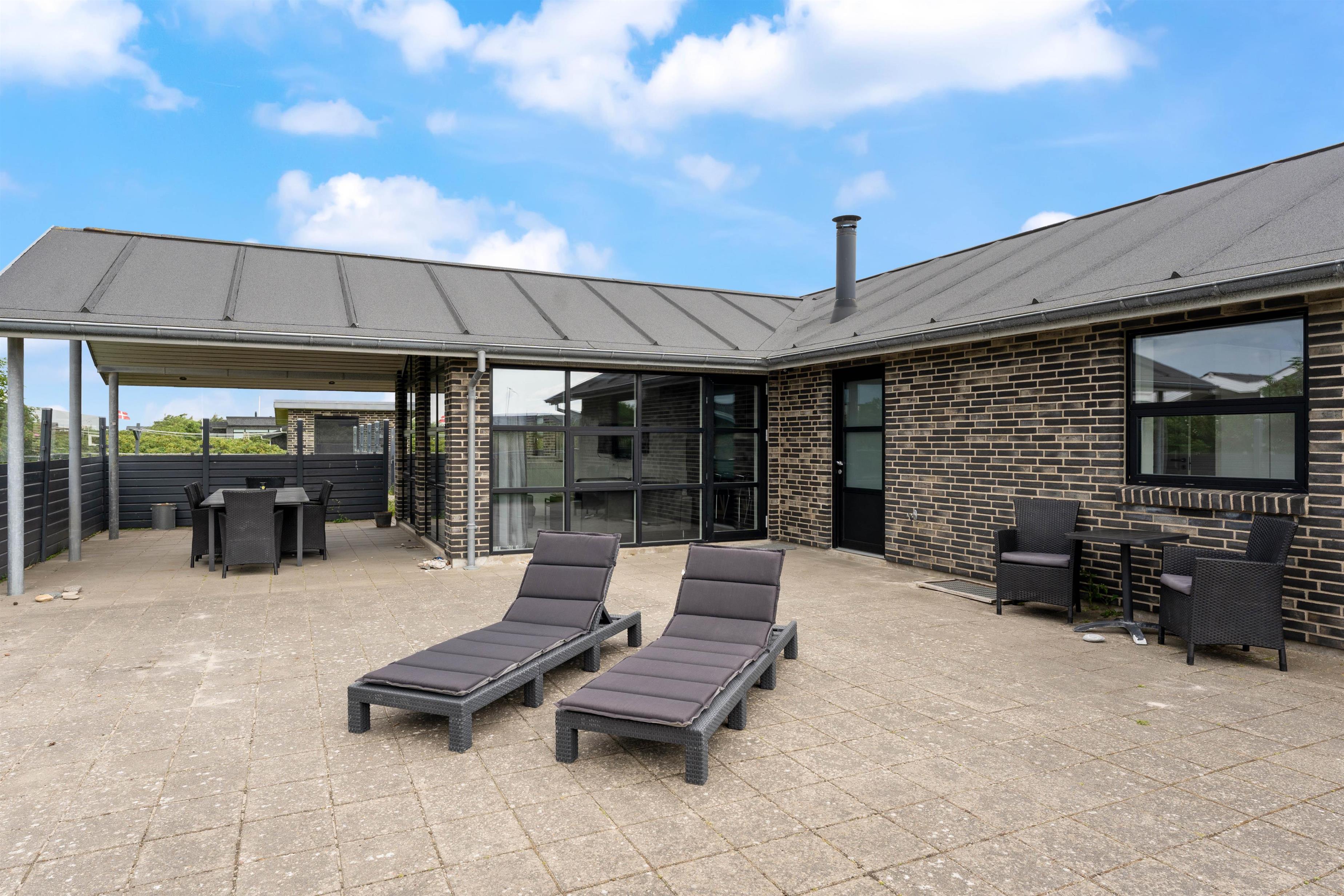 Om sommeren er husets terrasse en forlængelse af stuen. Her kan I sidde afskærmet og nyde solen, den salte luft og roen. Terrassen er oplagt til hyggelige middage, afslapning på langs og leg. En del af terrassen er overdækket. Her er der skabt en hyggelig oase, som skærmer for regn og dug, og som holder på varmen på en skøn sommeraften. Det betyder, at terrassen kan benyttes allerede fra det tidlige forår og langt ud i efteråret. Havemøblerne bliver ikke våde, og der kan grilles langt ud på sæsonen. Den indhegnede grund er ideel for børnefamilier og dyreejere, da det er tilladt i huset at tage op til to husdyr med