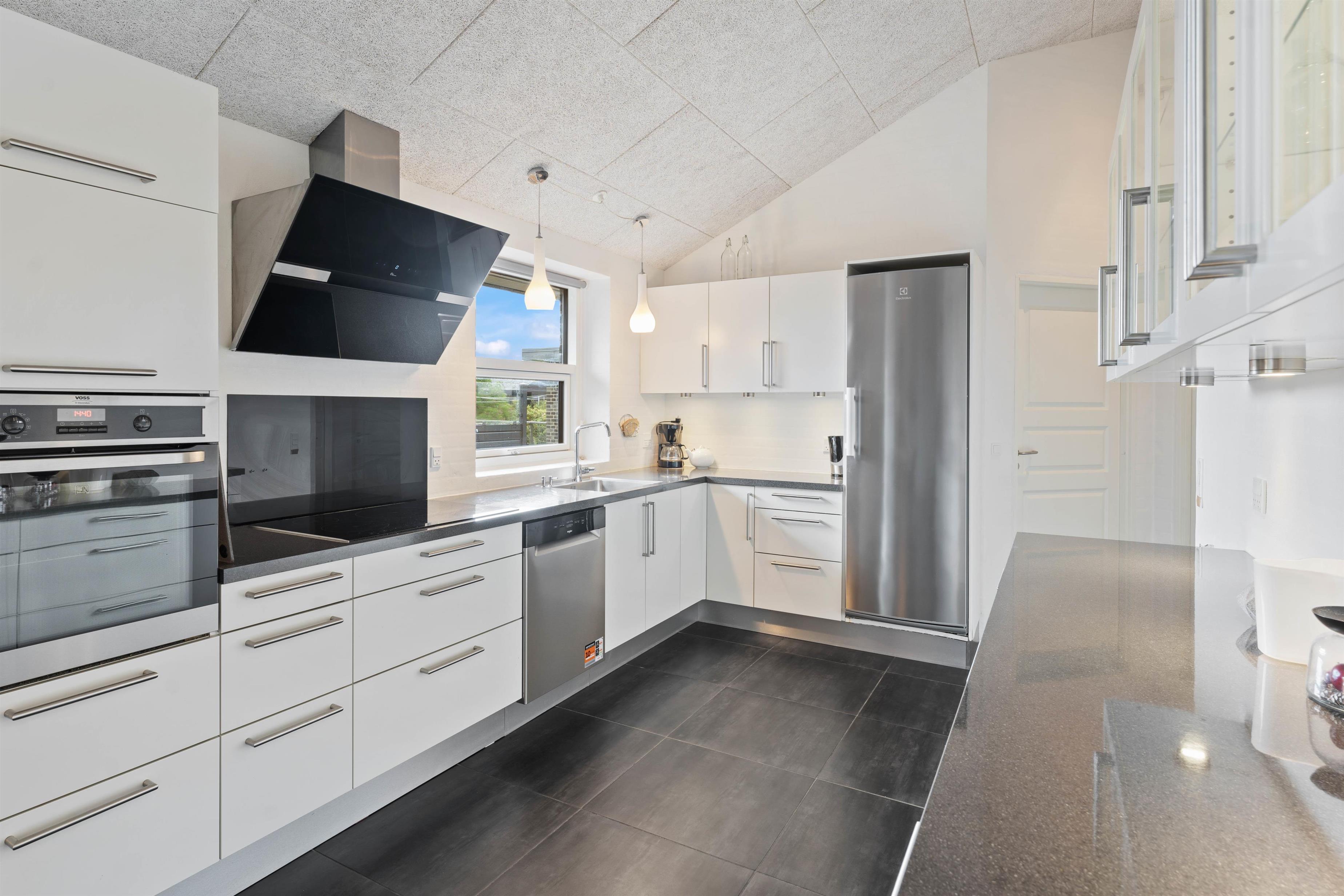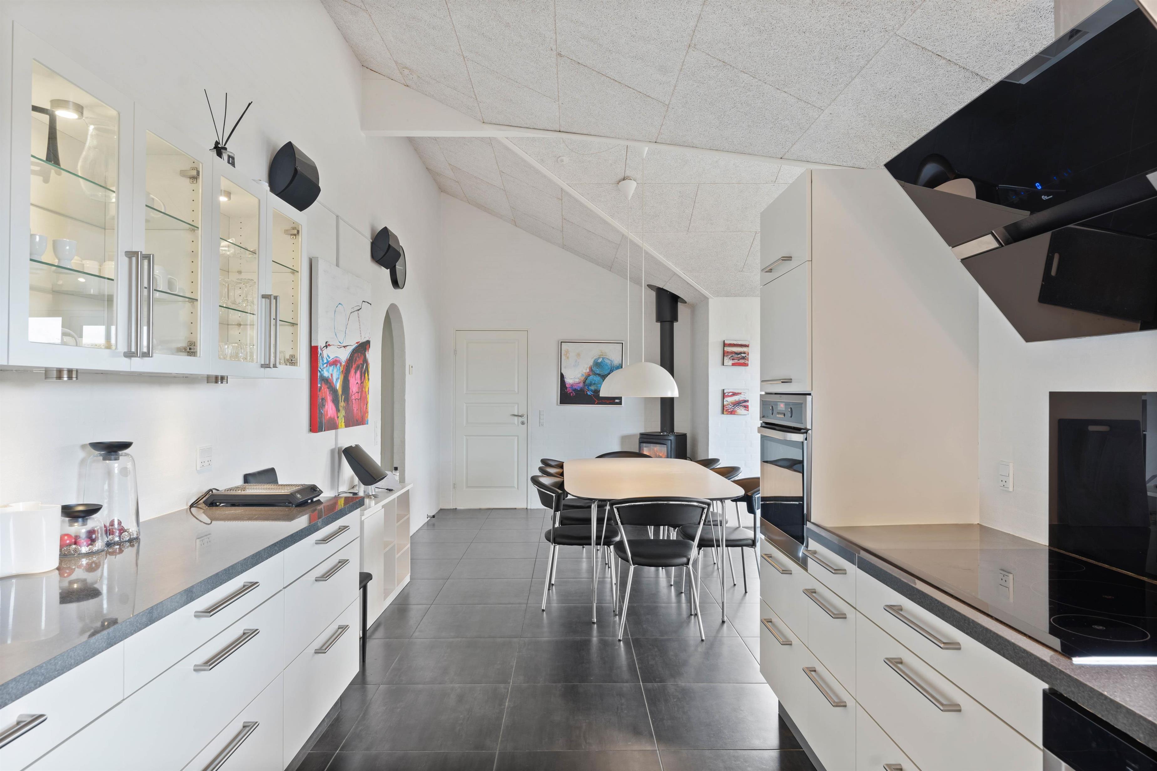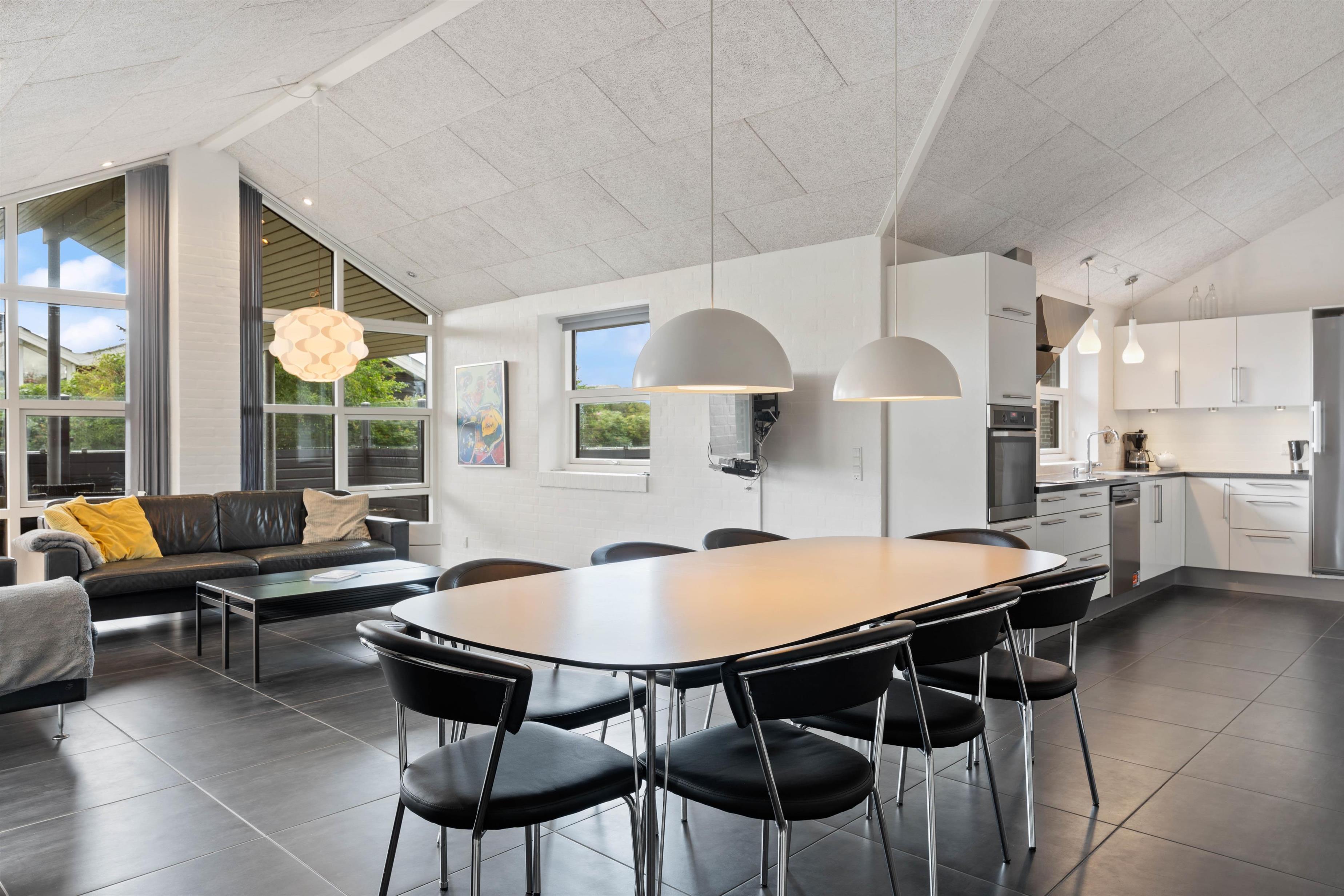 Indretningen i det 154 m2 store sommerhus er stilrent og rummeligt. Her er der højt til loftet og masser af plads til alle. De mange store vinduespartier i huset lukker lyset og de flotte omgivelser indenfor – selv på regnvejrsdage. Det store køkken, som ligger i åben forbindelse med stuen, er husets samlingspunkt. Her har du alt, hvad du forventer af et moderne køkken. Her begynder dagen med morgenkaffe og avislæsning og her kan I samles i løbet af dagen og snakke, mens maden tilberedes. I forlængelse af køkkenet er spisestuen med plads til 8 personer. De praktiske klinker i køkken og stue er desuden med gulvvarme.
