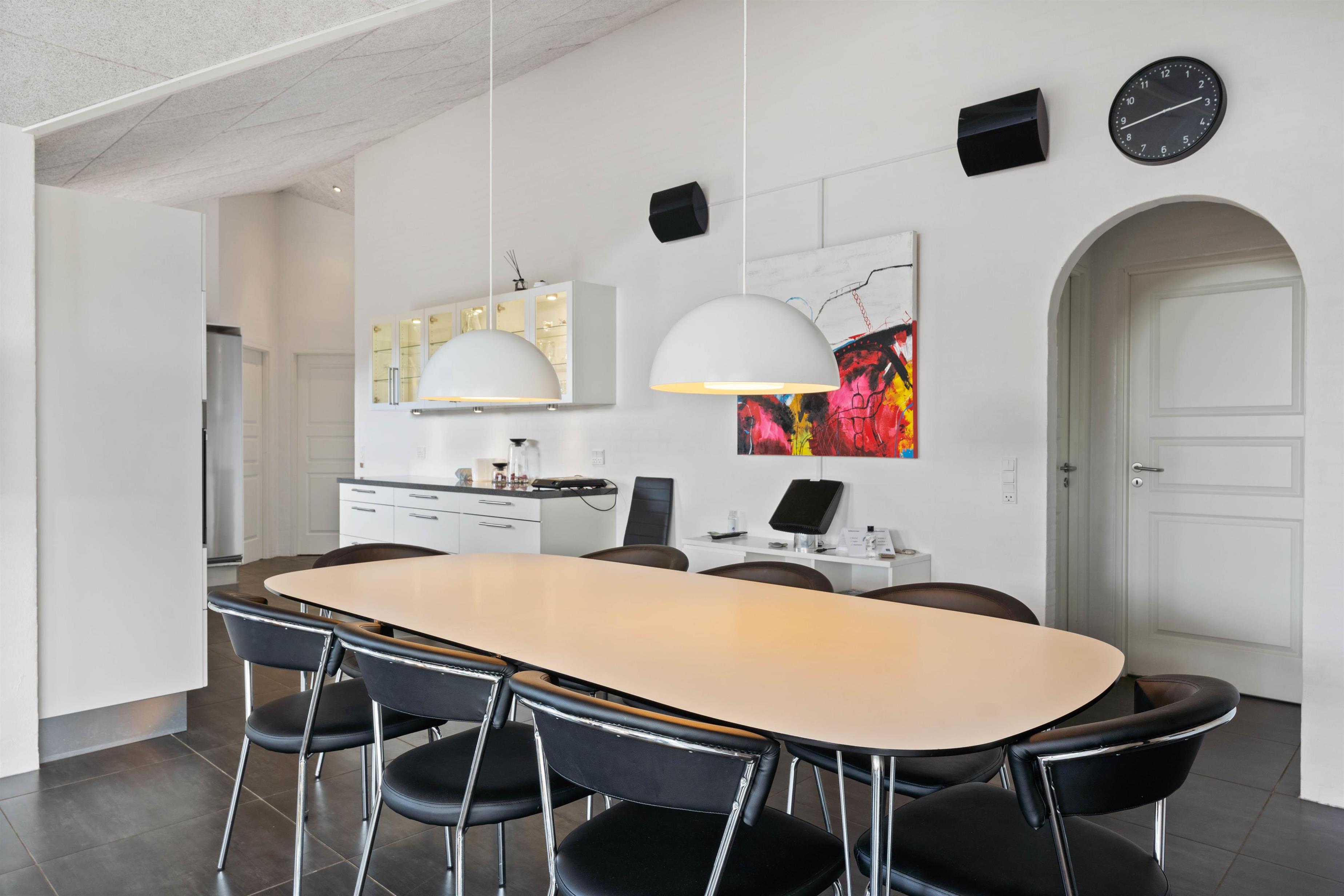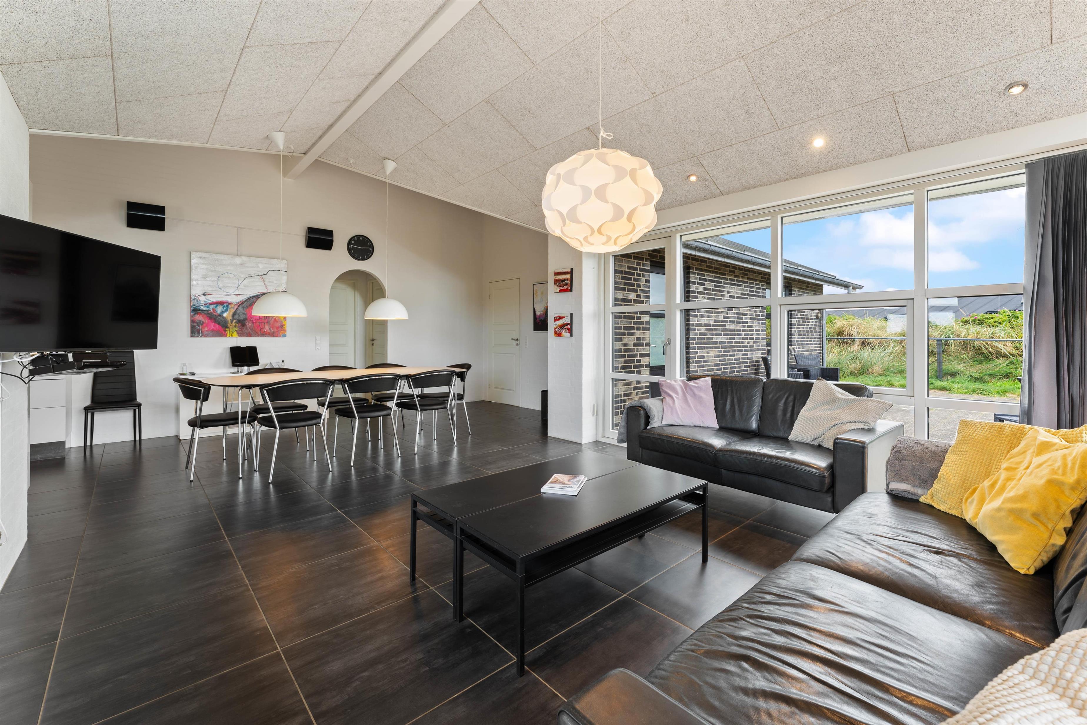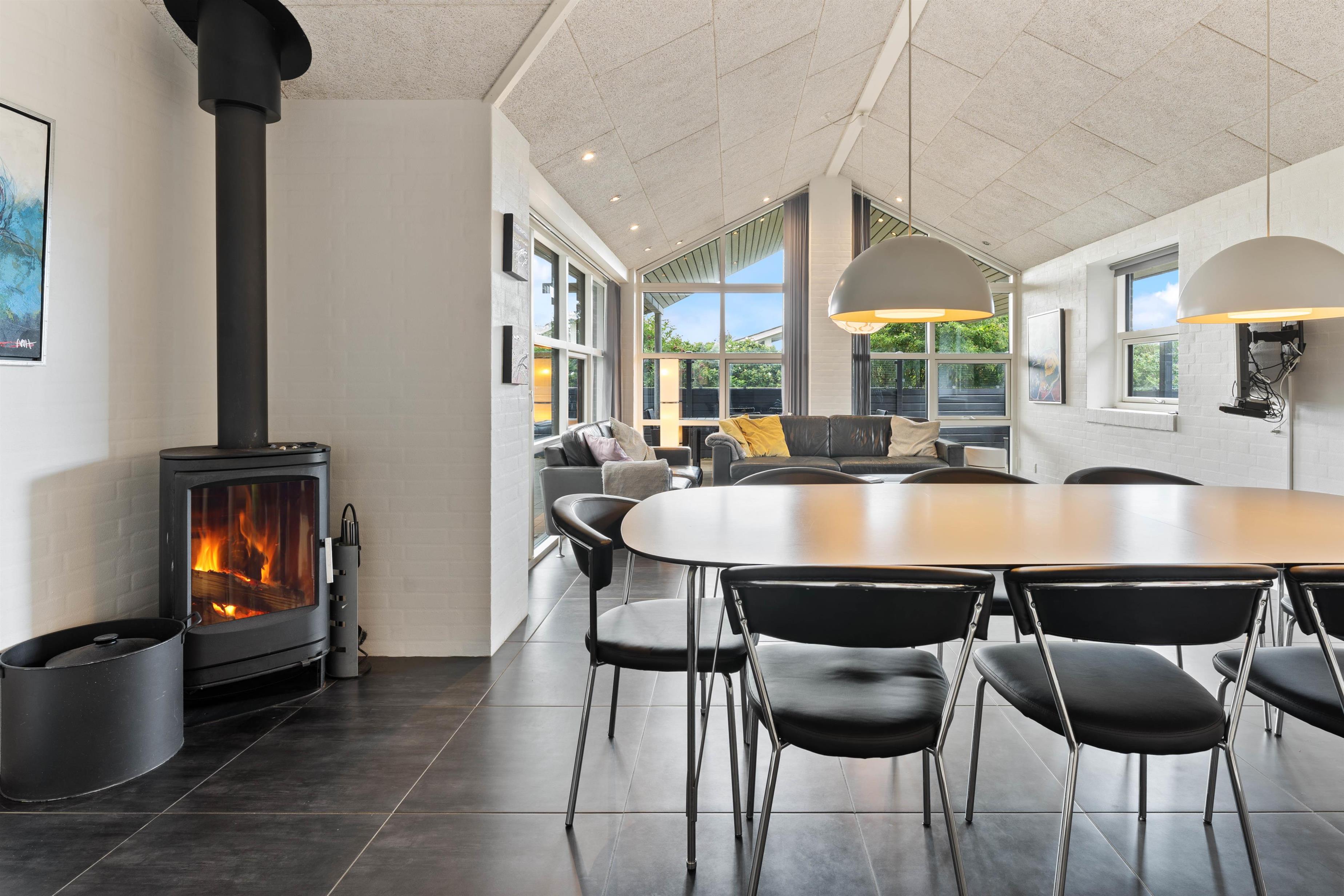 Indretningen i det 154 m2 store sommerhus er stilrent og rummeligt. Her er der højt til loftet og masser af plads til alle. De mange store vinduespartier i huset lukker lyset og de flotte omgivelser indenfor – selv på regnvejrsdage. Det store køkken, som ligger i åben forbindelse med stuen, er husets samlingspunkt. Her har du alt, hvad du forventer af et moderne køkken. Her begynder dagen med morgenkaffe og avislæsning og her kan I samles i løbet af dagen og snakke, mens maden tilberedes. I forlængelse af køkkenet er spisestuen med plads til 8 personer. De praktiske klinker i køkken og stue er desuden med gulvvarme.