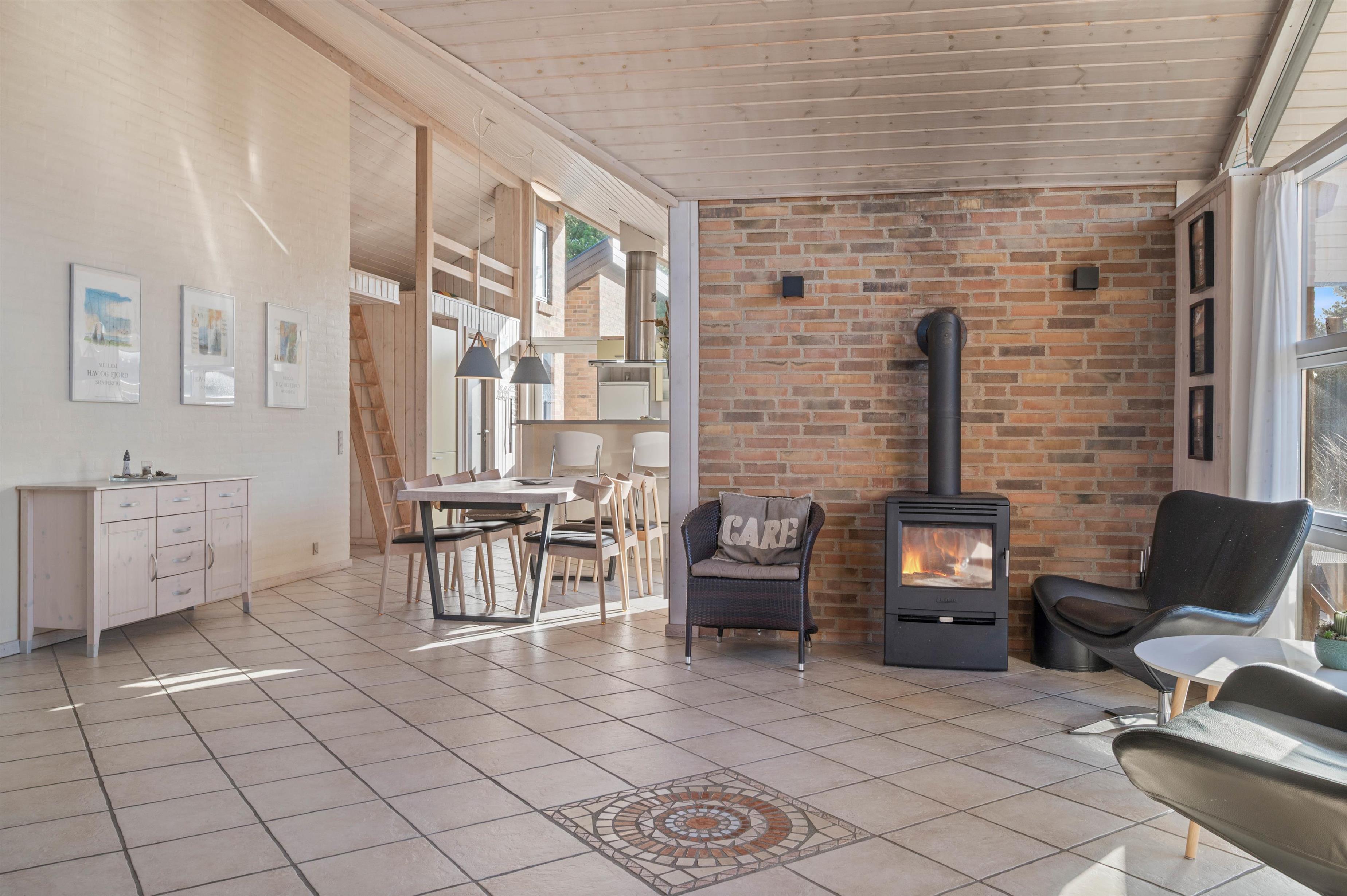Sommerhusets store og veludstyrede køkken ligger i åben forbindelse med spisestue og stue, hvor I utvivlsomt vil komme til at tilbringe mange hyggelige og dejlige feriestunder. Her sørger brændeovnen desuden for at sætte prikken over i’et for feriestemningen. Derudover sørger den installerede luft-luft varmepumpe for et behageligt indeklima i sommerhuset.