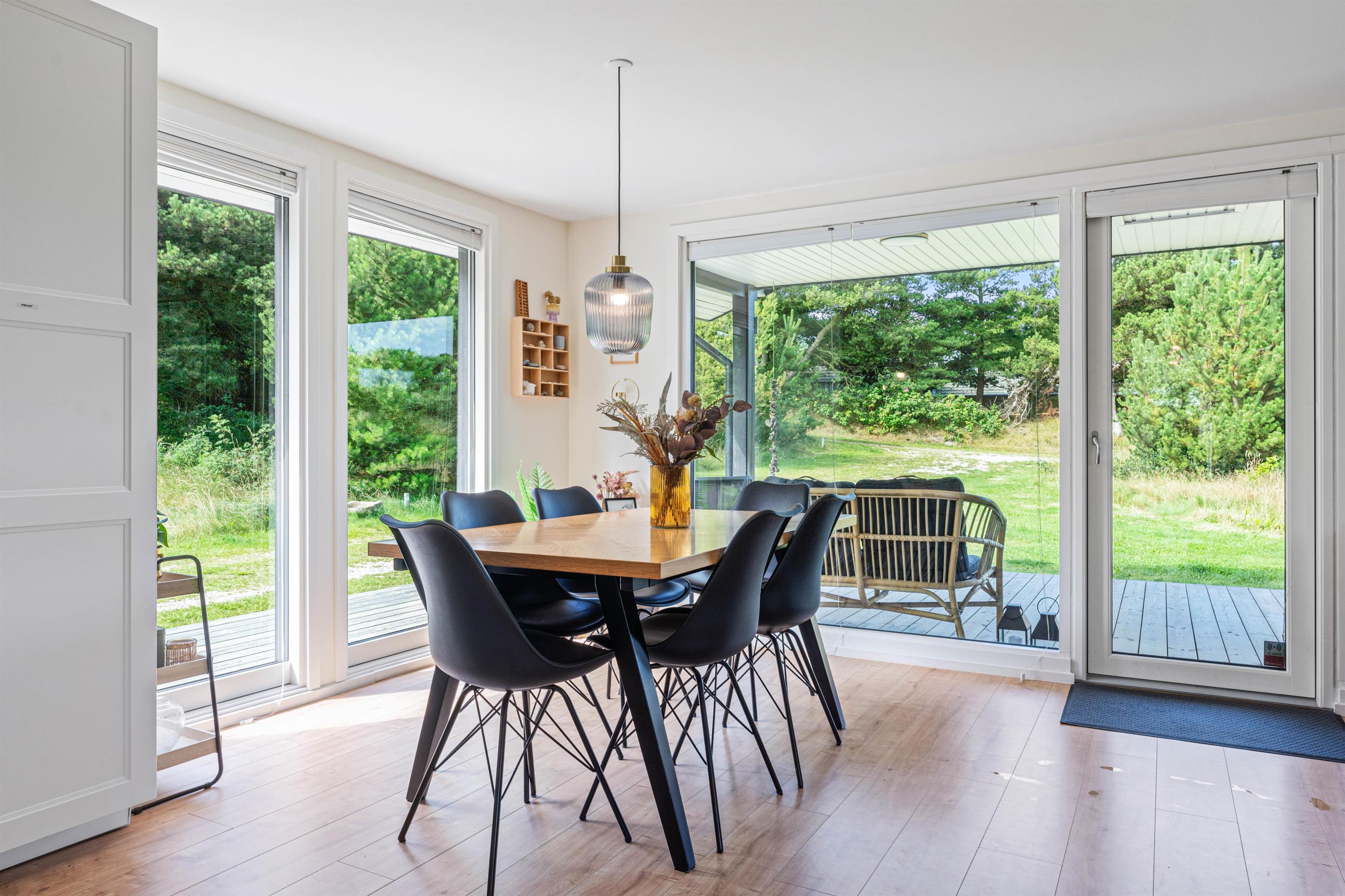 Fra alrummet kan I også nyde udsigten til sommerhusets have og den omkringliggende natur gennem de store vinduespartier, der samtidig giver et godt lysindfald i rummet.