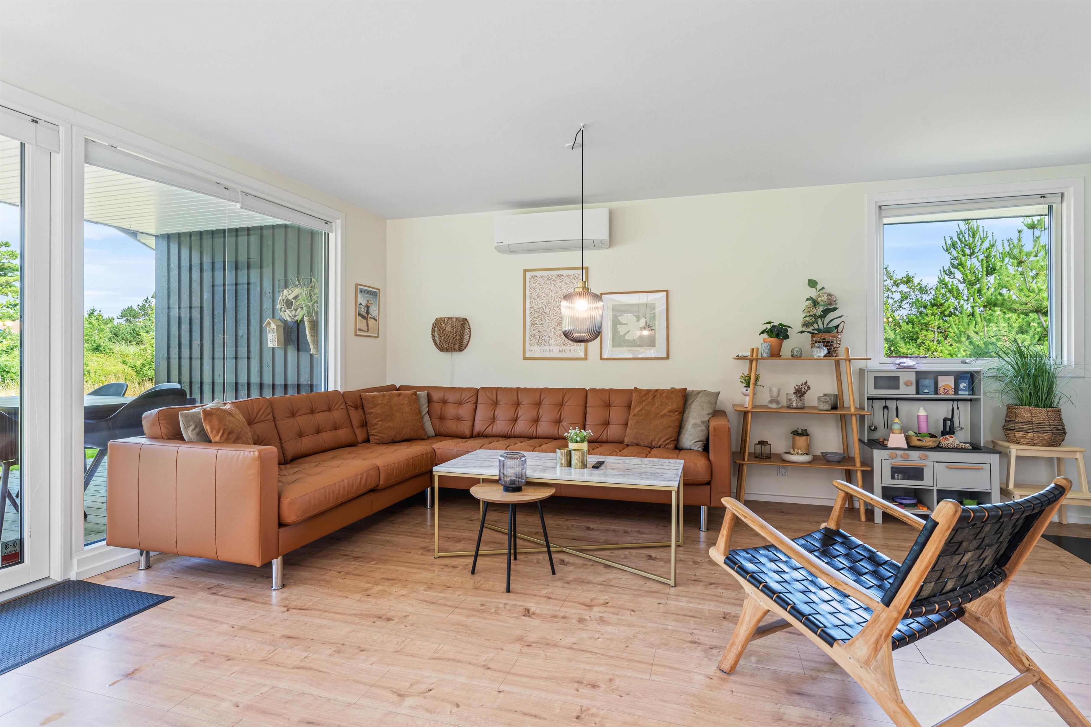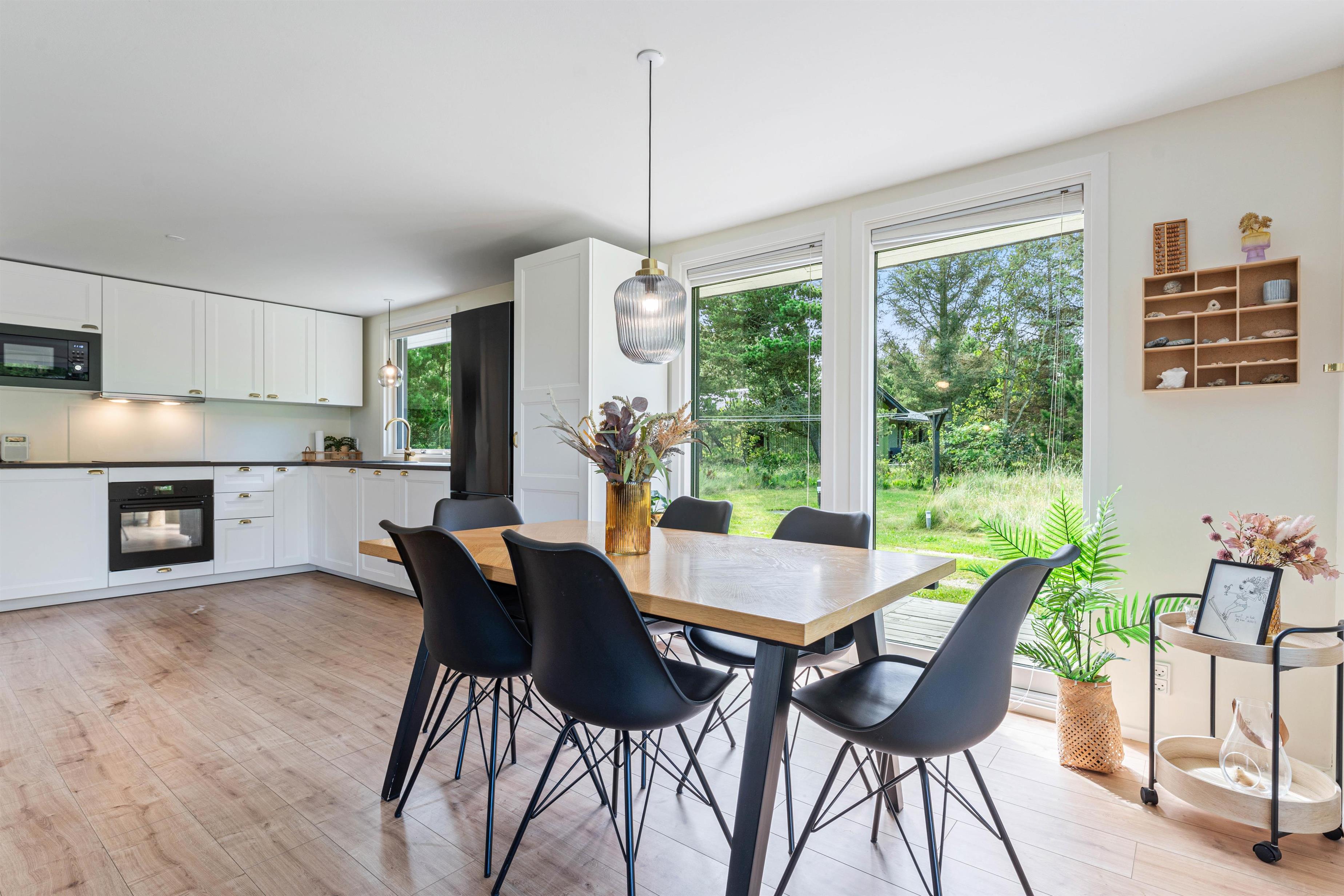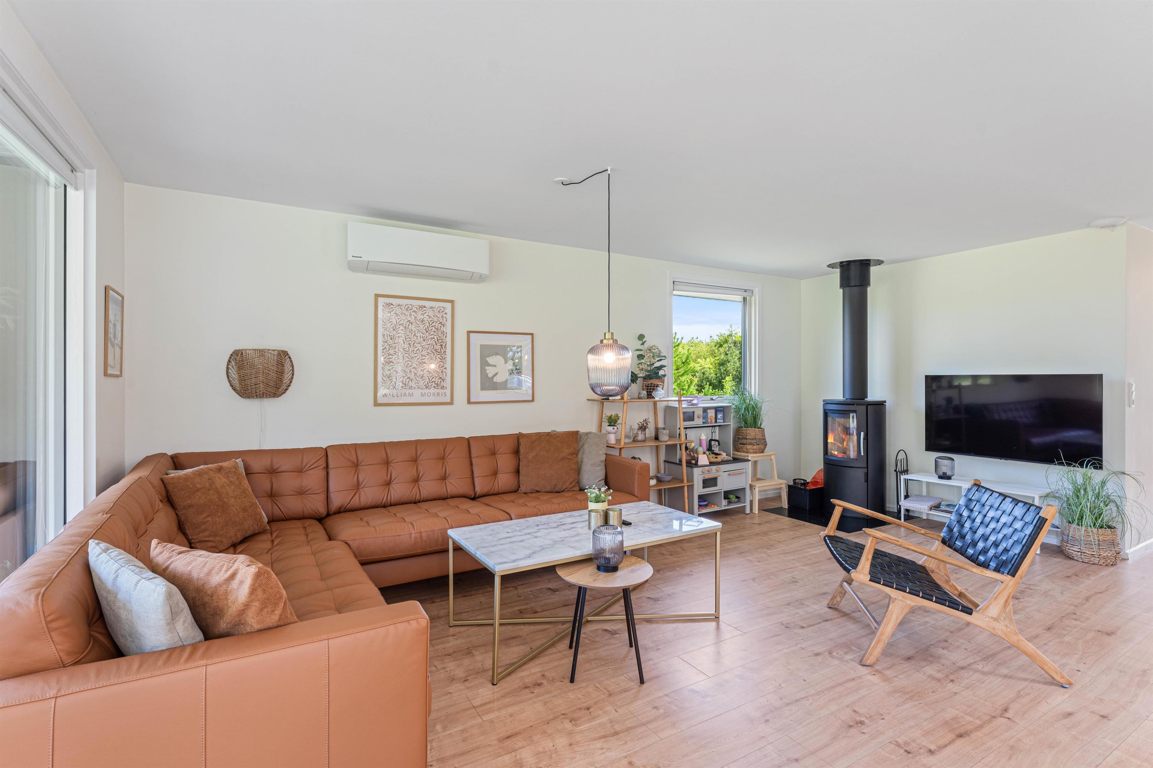 Det hyggelige alrum udgør hjertet i det 72 kvadratmeter store sommerhus. Her kan I samles til hyggelig madlavning i køkkenet, sjove stunder med spil omkring bordet og meget mere. I alrummet har I også en brændeovn, der knitrer i baggrunden og fuldender feriestemningen.