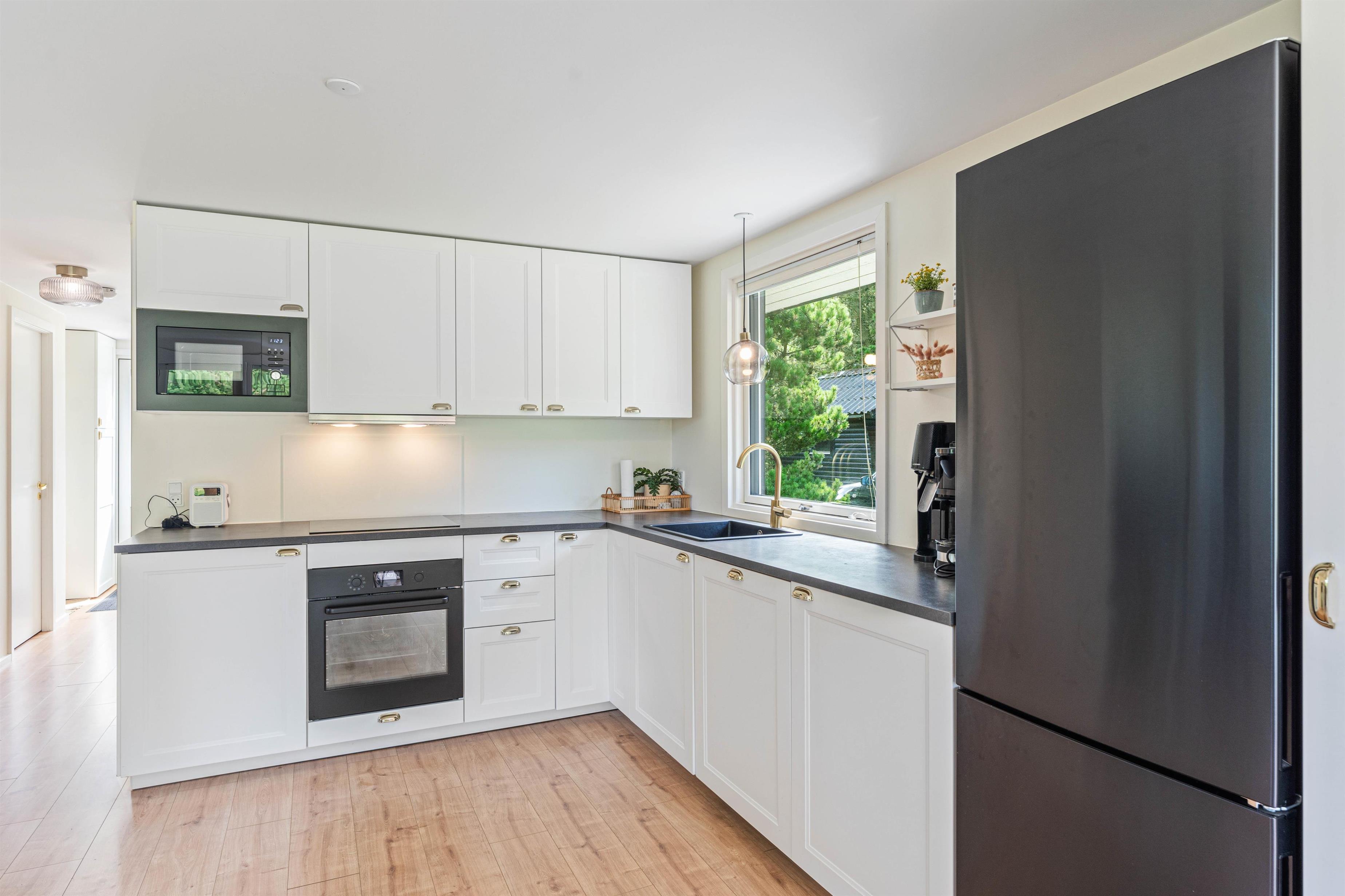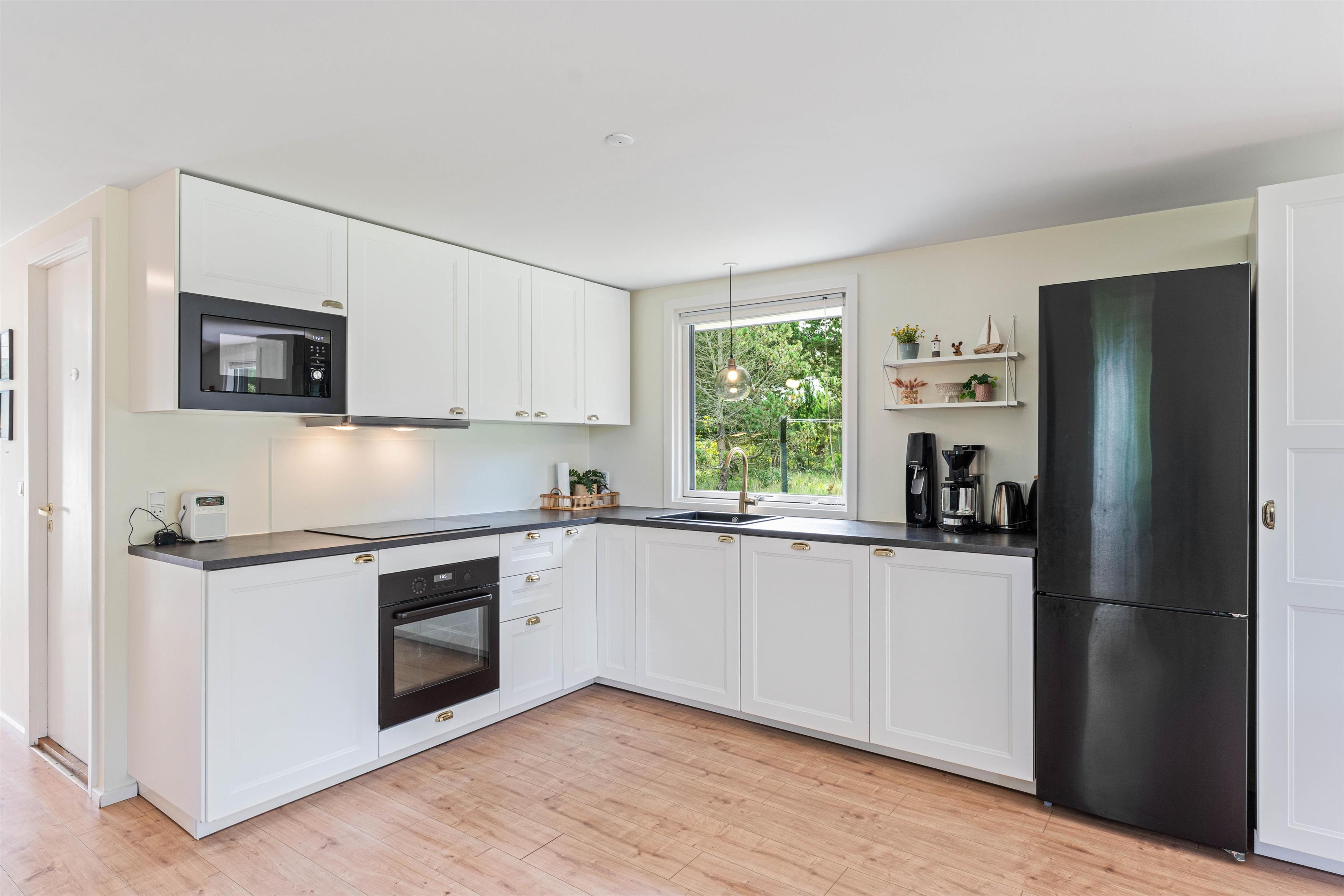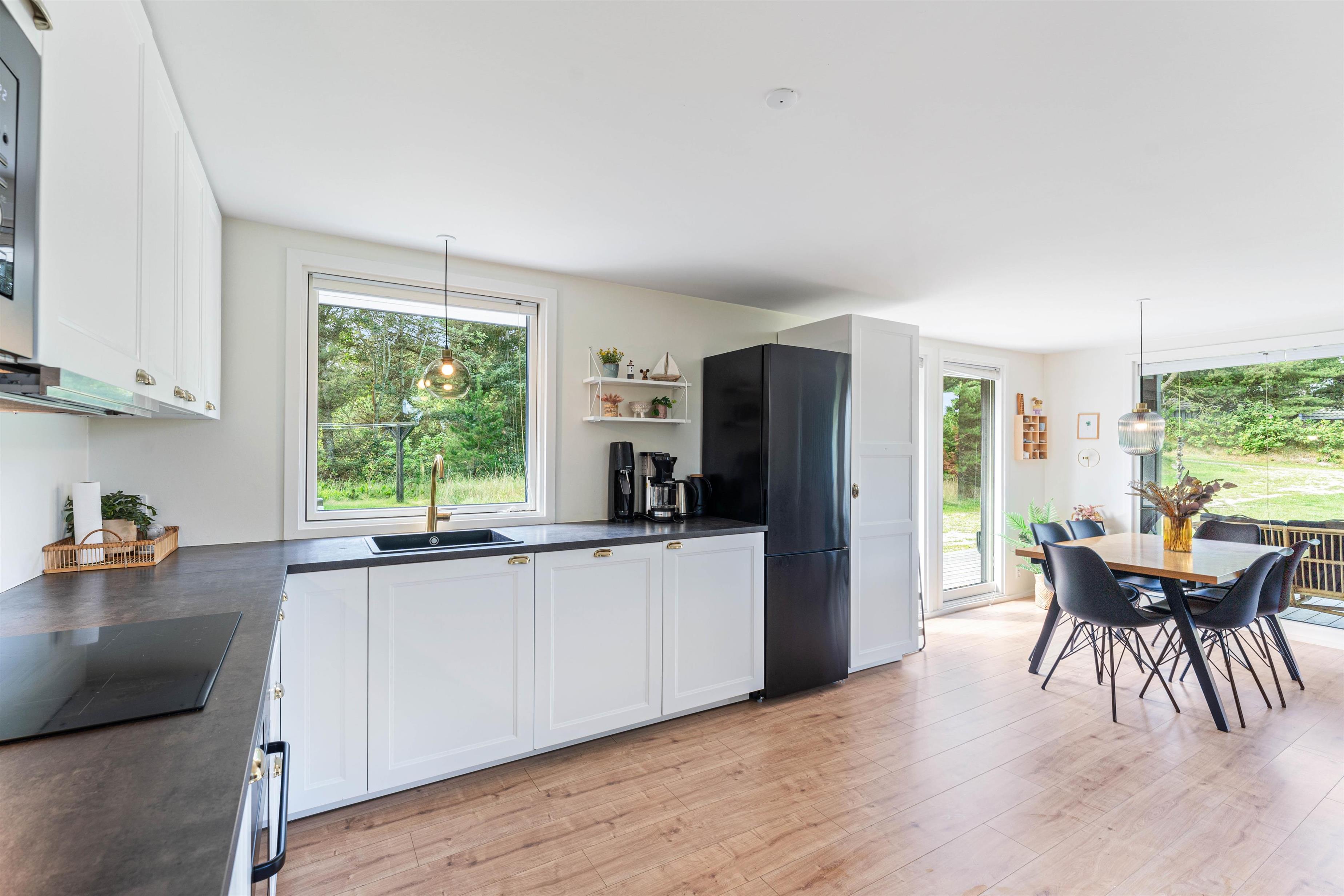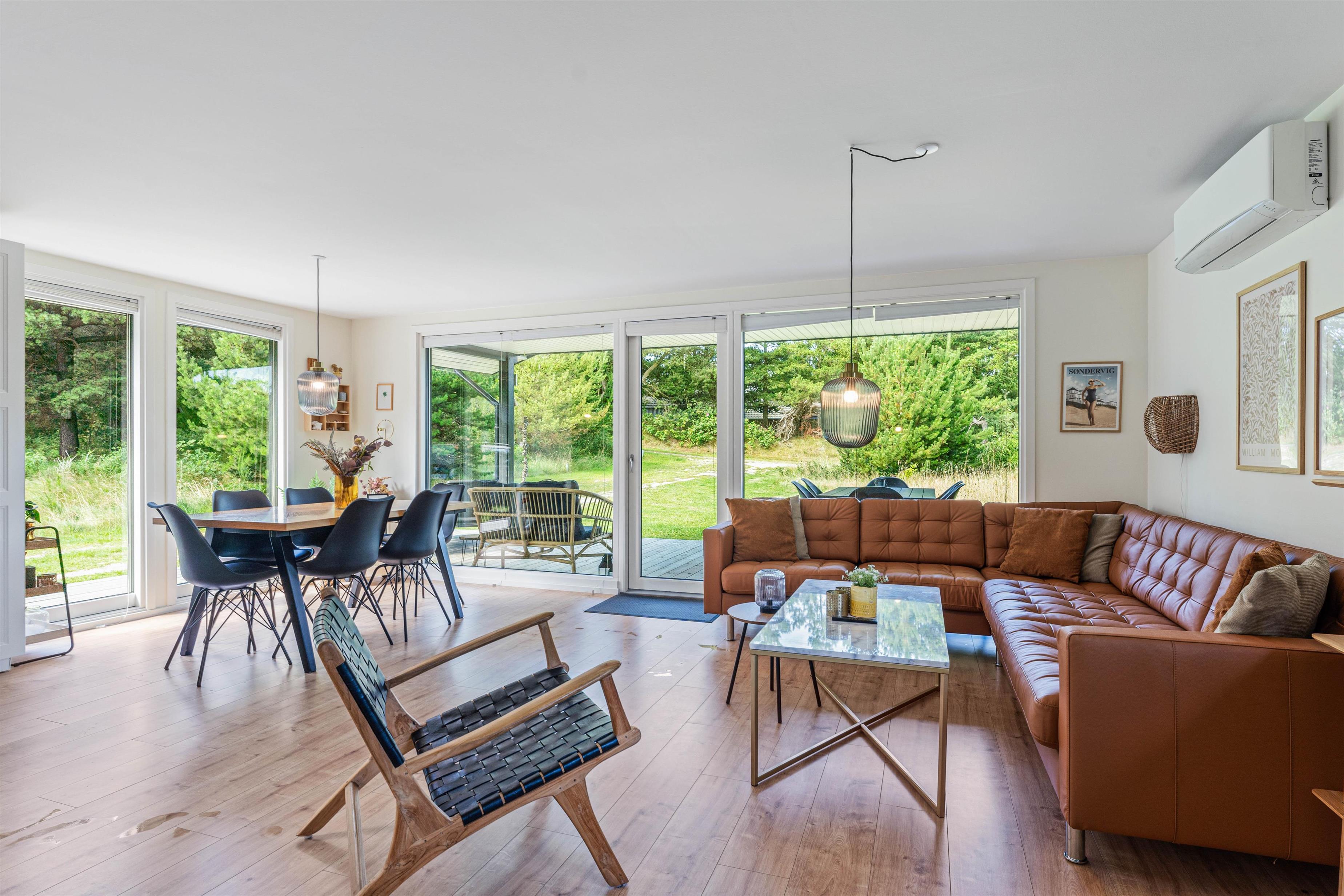 Det hyggelige alrum udgør hjertet i det 72 kvadratmeter store sommerhus. Her kan I samles til hyggelig madlavning i køkkenet, sjove stunder med spil omkring bordet og meget mere. I alrummet har I også en brændeovn, der knitrer i baggrunden og fuldender feriestemningen.