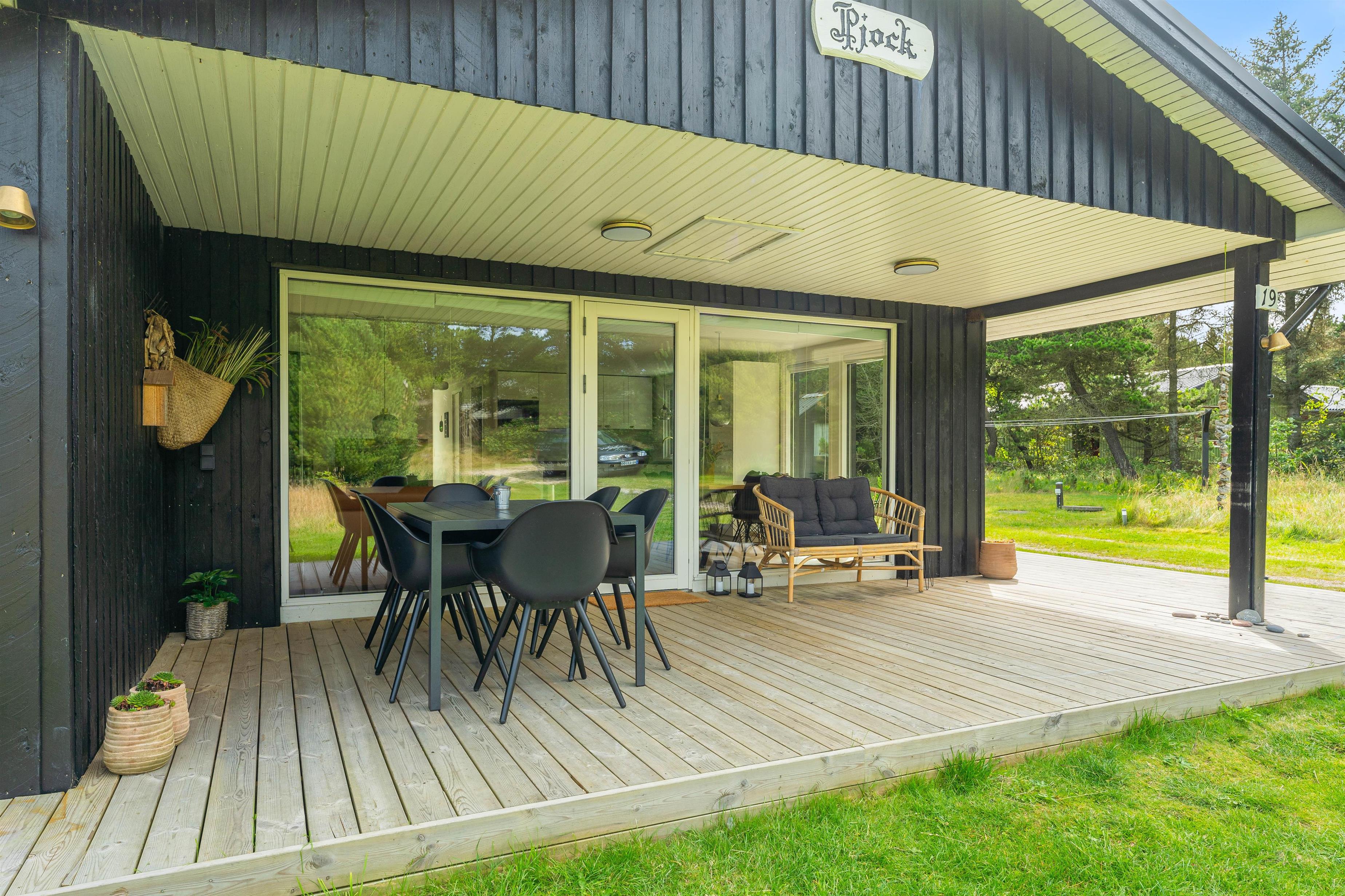 Fra sommerhusets alrum kan I træde ud på den store terrasse. I den vestlige ende af sommerhuset er terrassen afskærmet og overdækket, så her kan I nyde nogle gode stunder i skyggen. I kan også følge terrassen til sommerhusets østlige ende, hvor terrassen er åben. Her kan I nyde dagens første kop kaffe, mens solen står op.