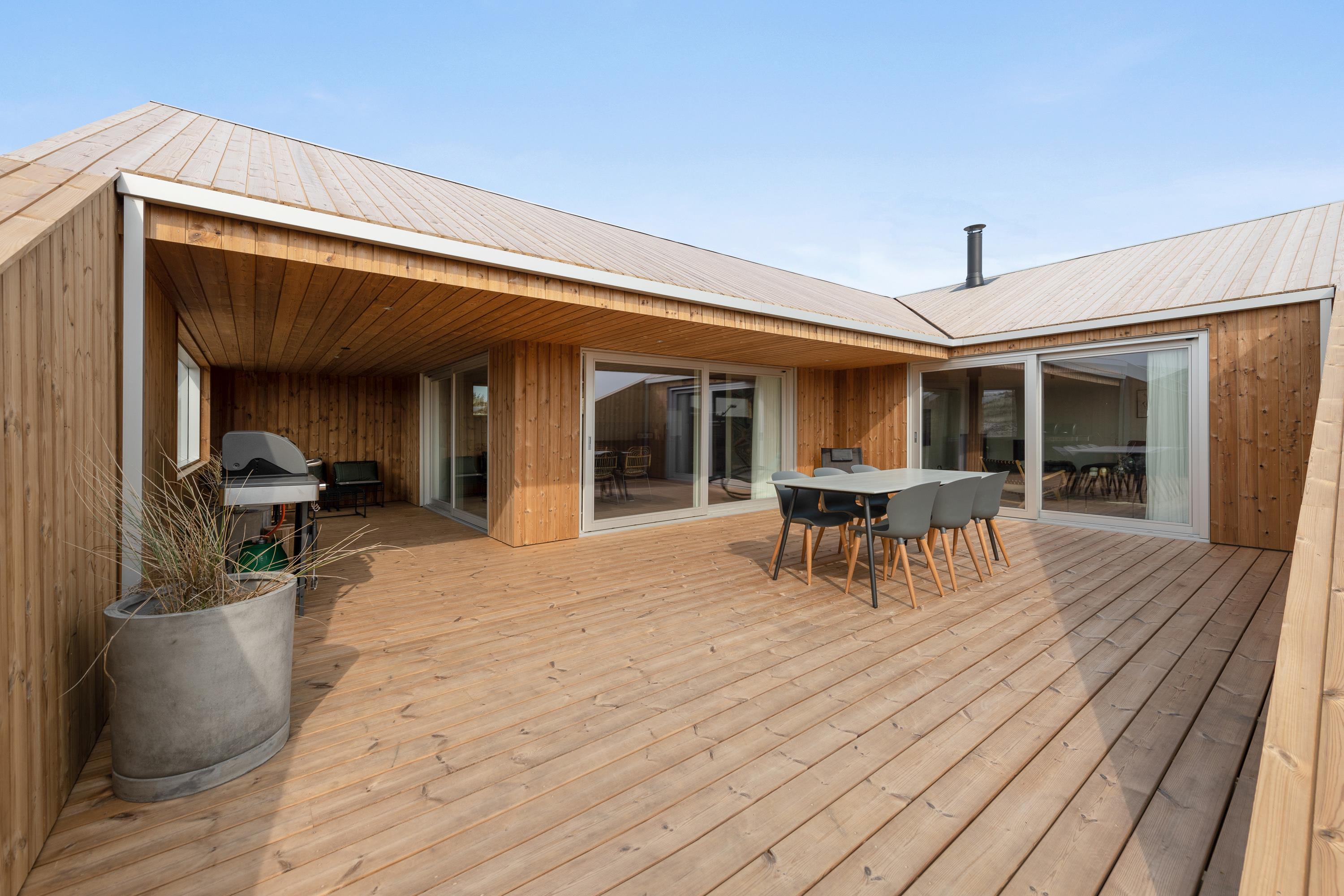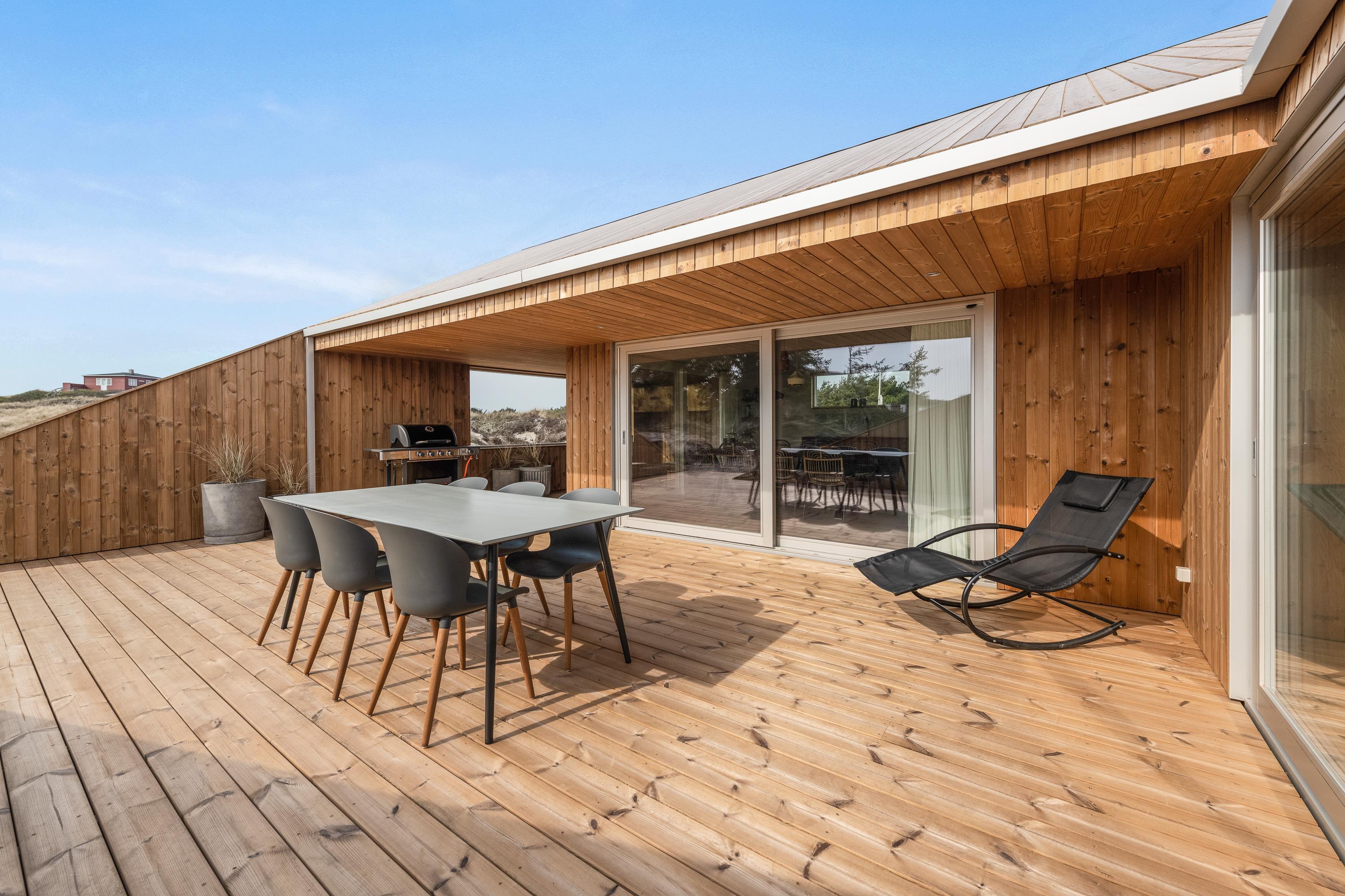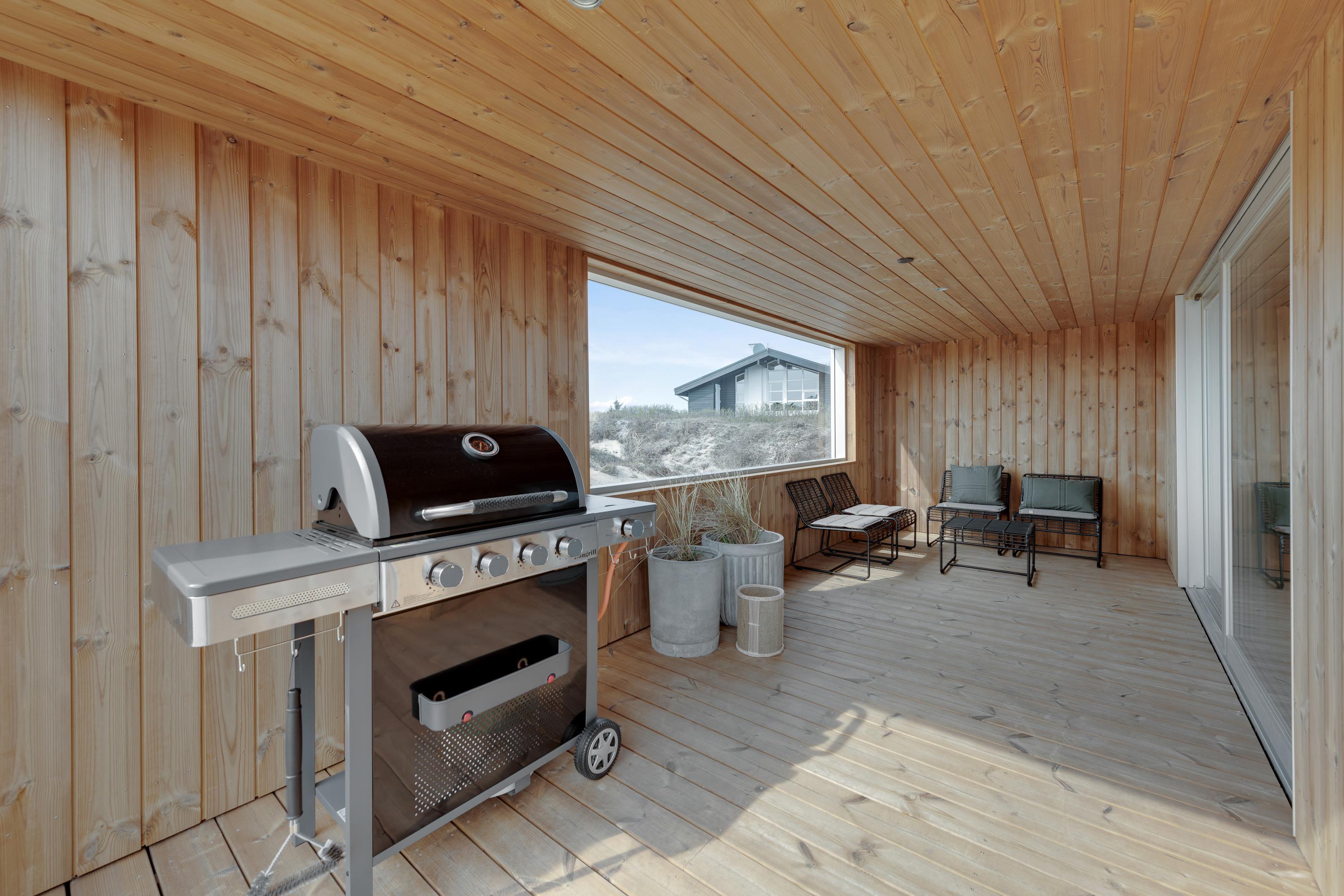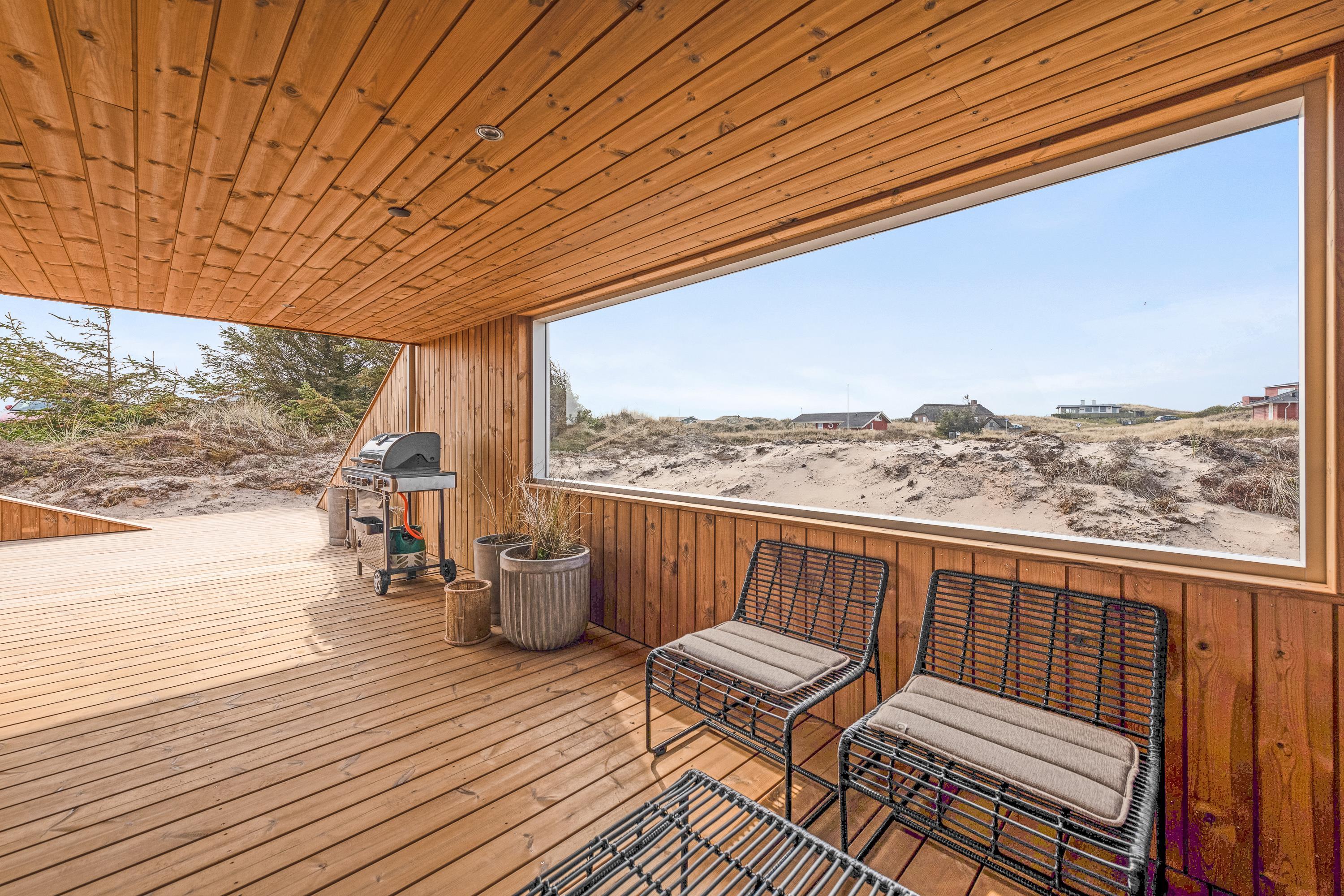 Med 130 m2 terrasse, hvoraf hele 65 m2 er overdækket, er der skabt optimale muligheder for at nyde ferietiden udendørs. Nyd duften og lyden af Vesterhavet og udsigten på det omkringliggende klitlandskab imens I slapper af og solbader eller nyder aftenstilheden med lidt lækkert grillmad og en flaske god rødvin.