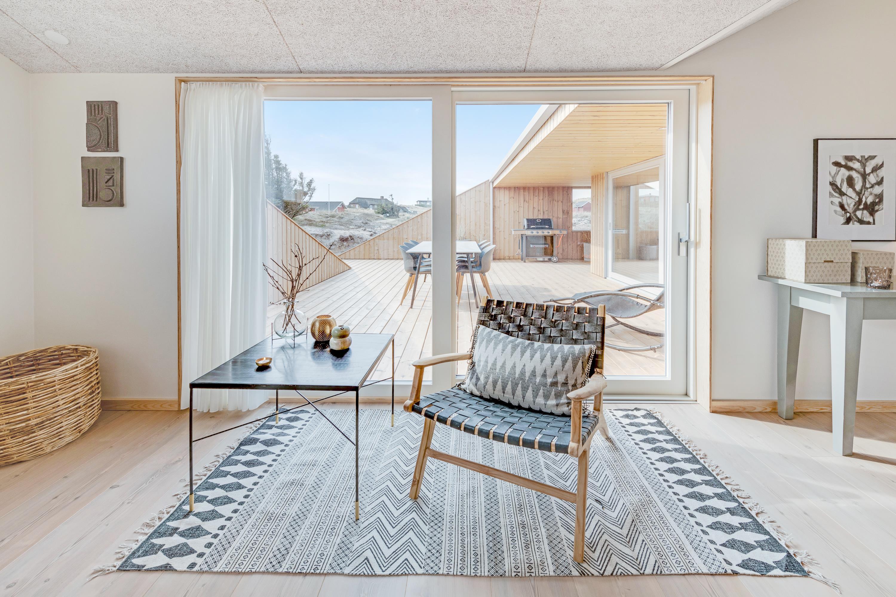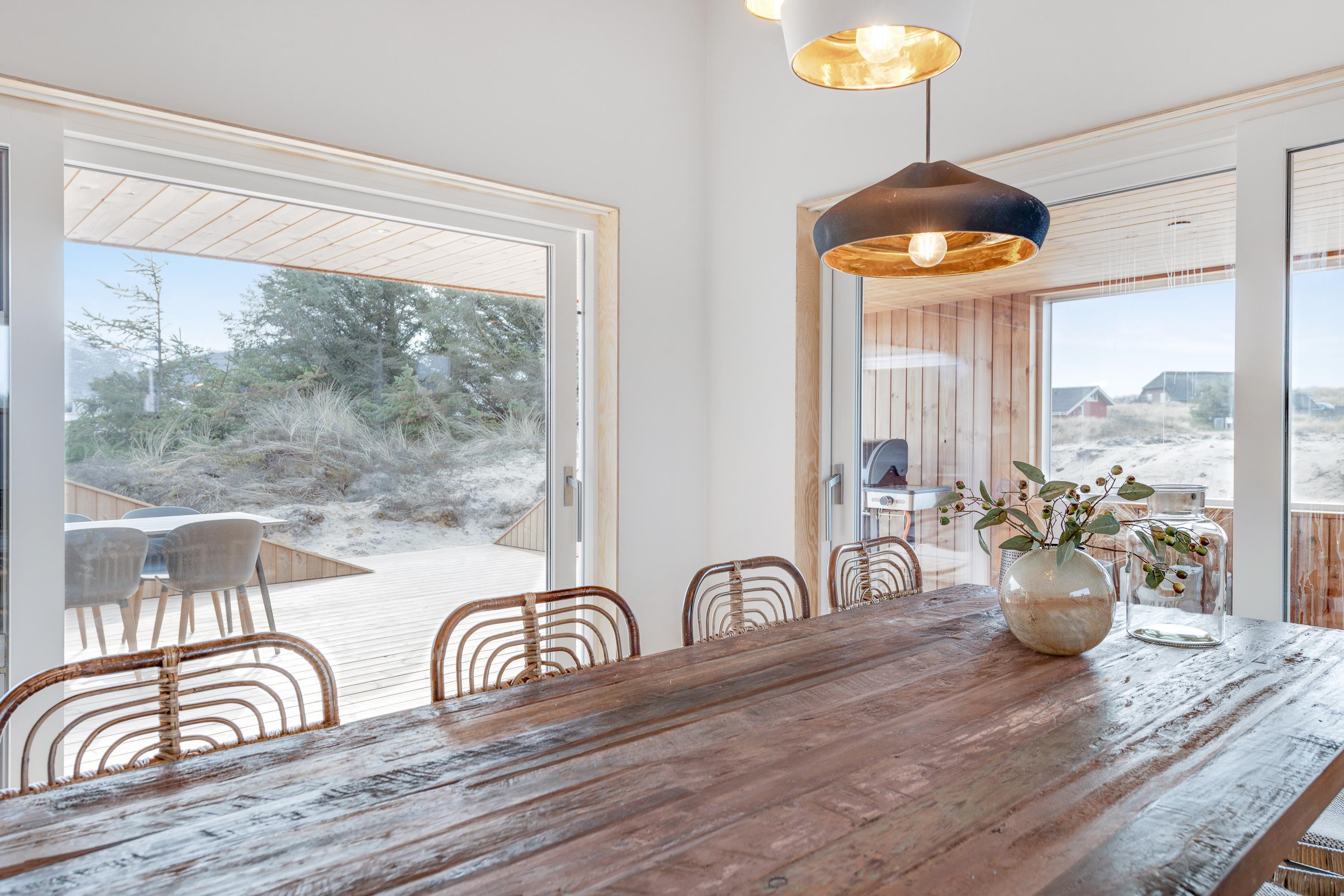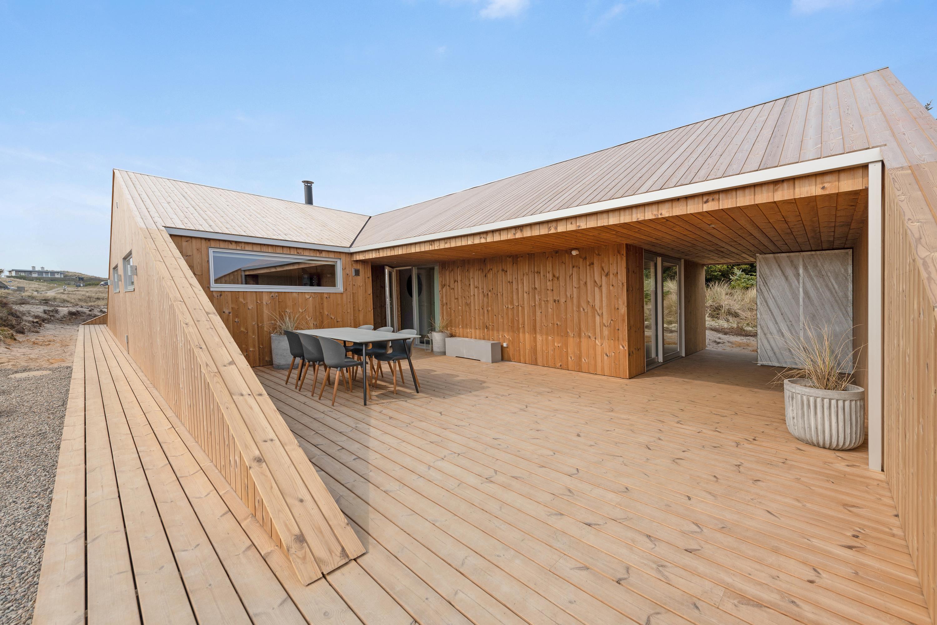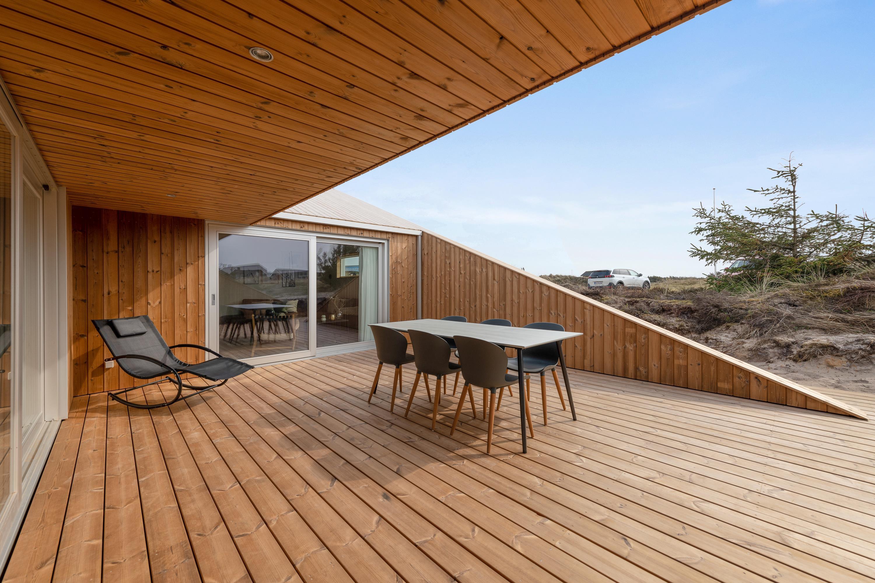 Med 130 m2 terrasse, hvoraf hele 65 m2 er overdækket, er der skabt optimale muligheder for at nyde ferietiden udendørs. Nyd duften og lyden af Vesterhavet og udsigten på det omkringliggende klitlandskab imens I slapper af og solbader eller nyder aftenstilheden med lidt lækkert grillmad og en flaske god rødvin.