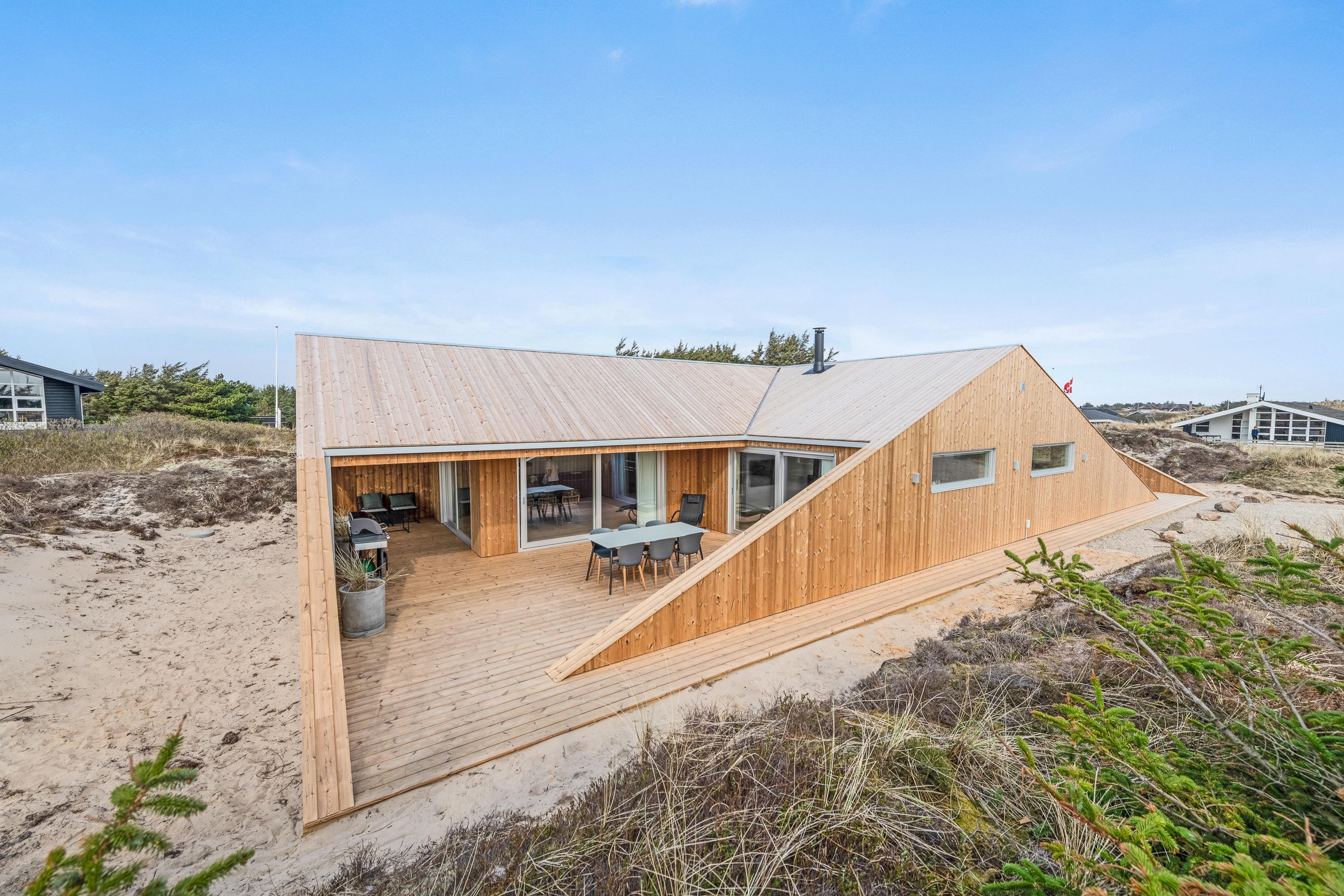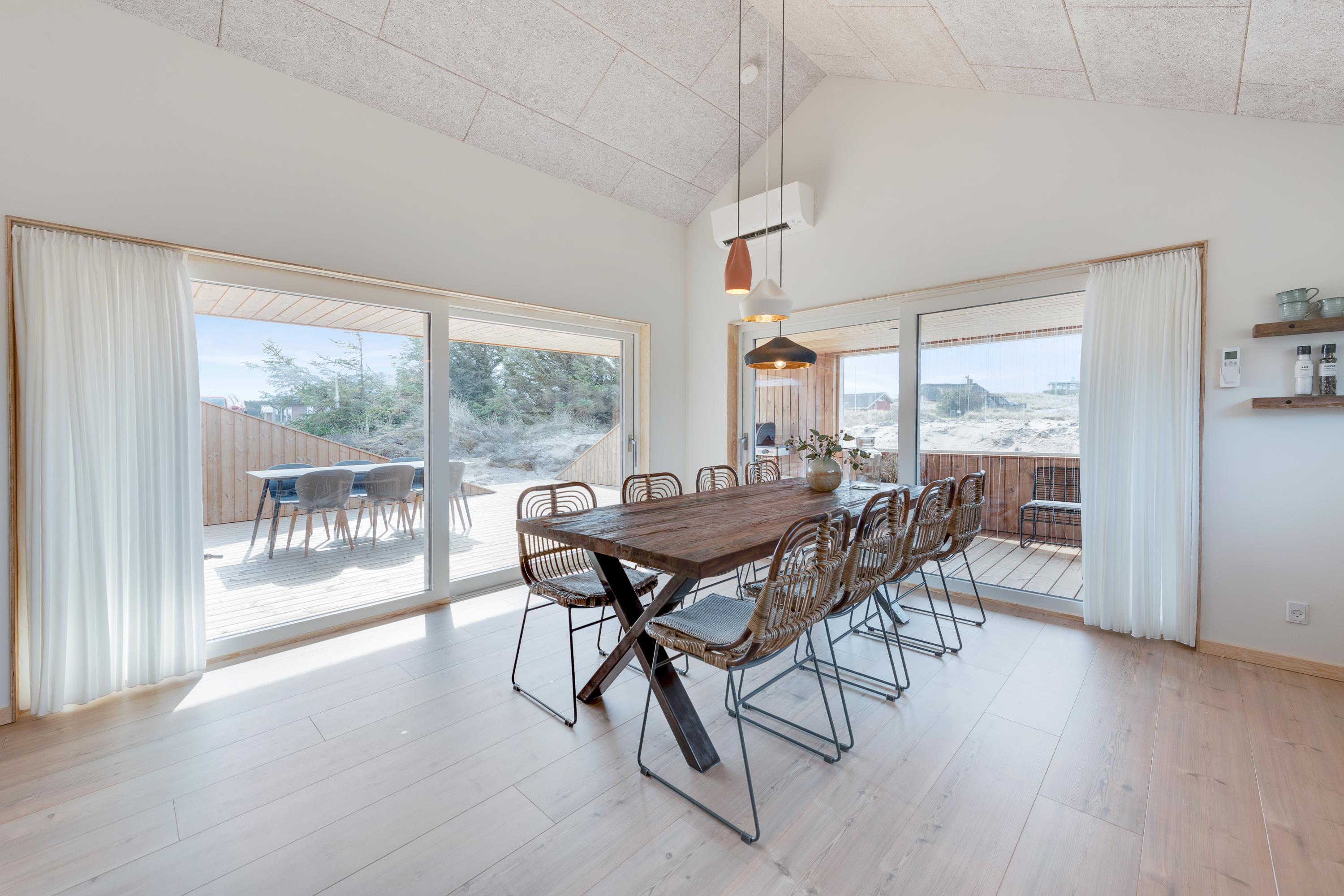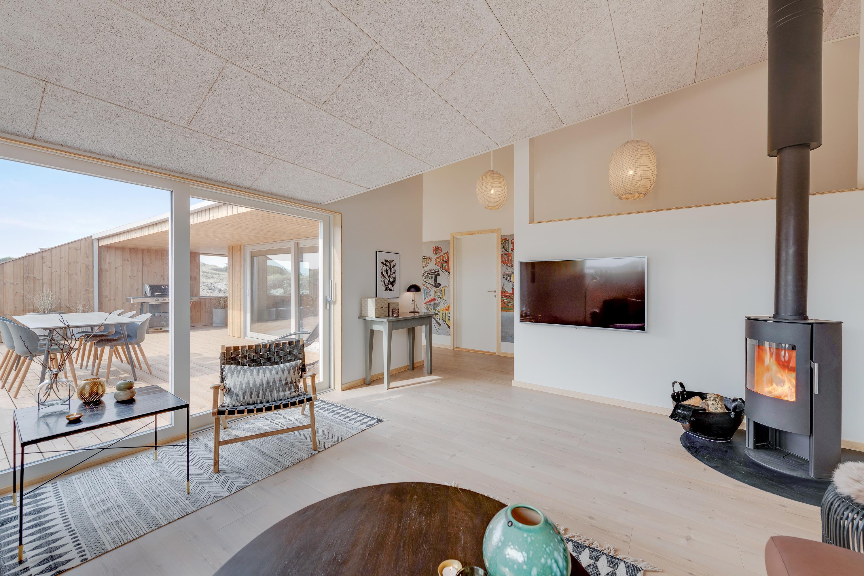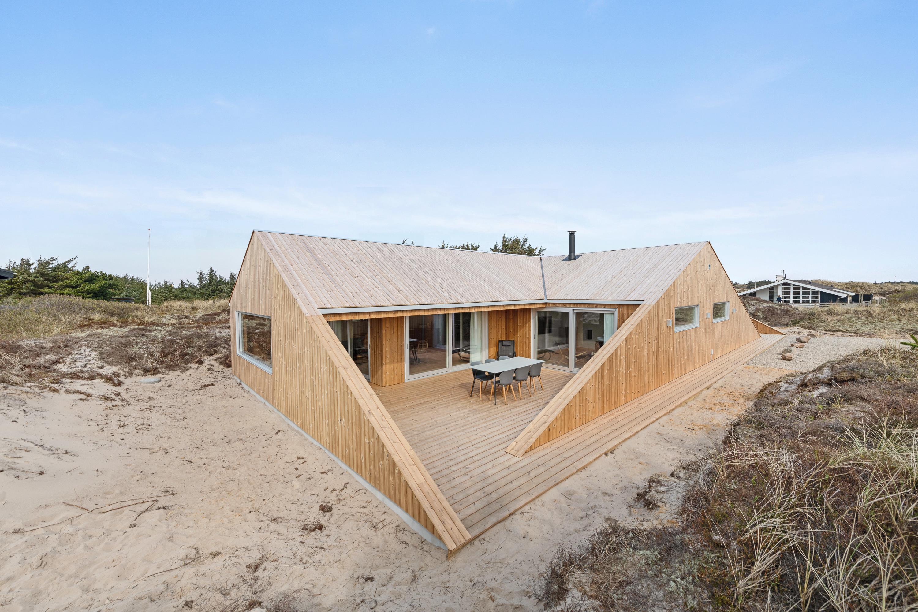 Med 130 m2 terrasse, hvoraf hele 65 m2 er overdækket, er der skabt optimale muligheder for at nyde ferietiden udendørs. Nyd duften og lyden af Vesterhavet og udsigten på det omkringliggende klitlandskab imens I slapper af og solbader eller nyder aftenstilheden med lidt lækkert grillmad og en flaske god rødvin.