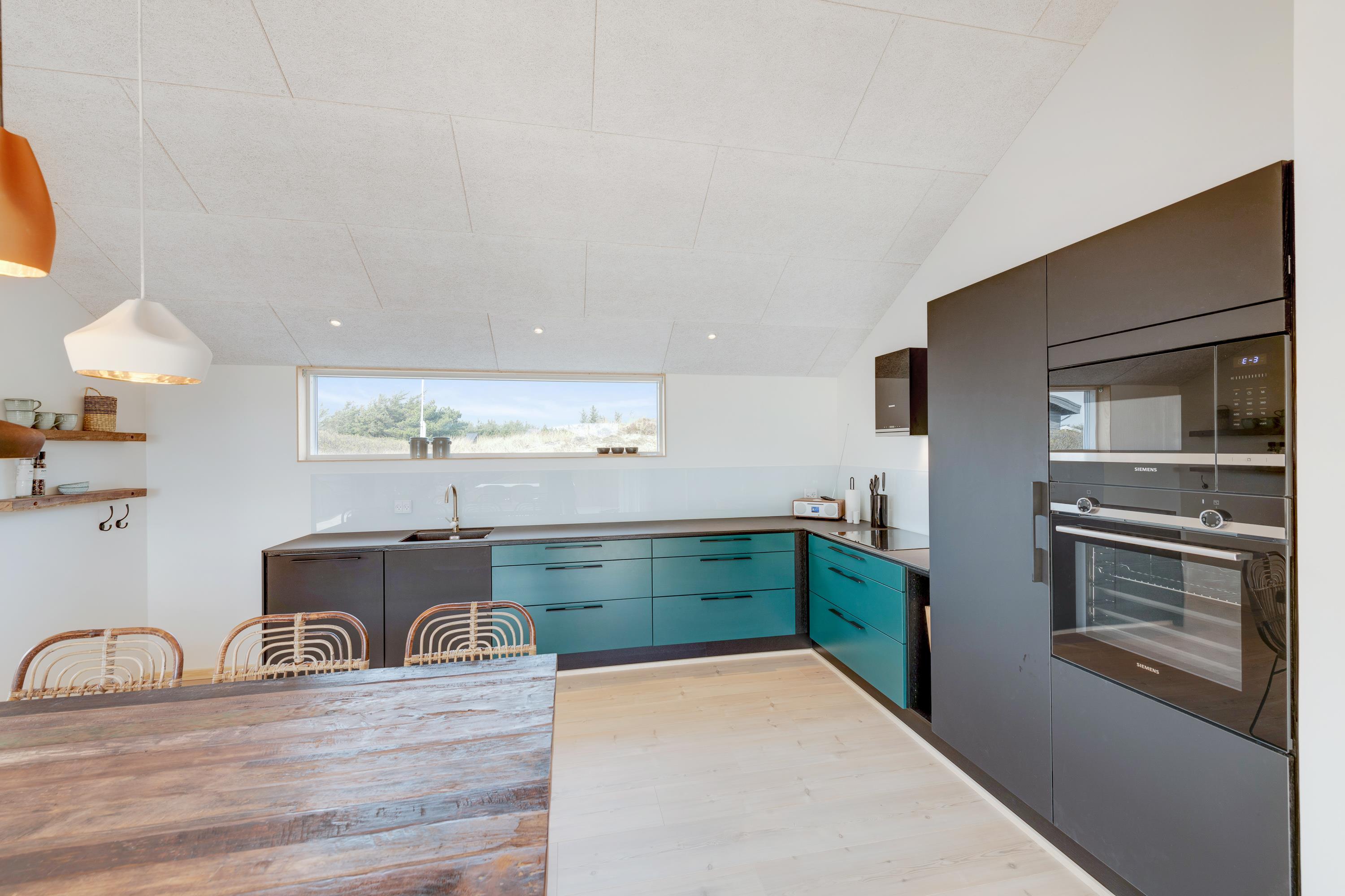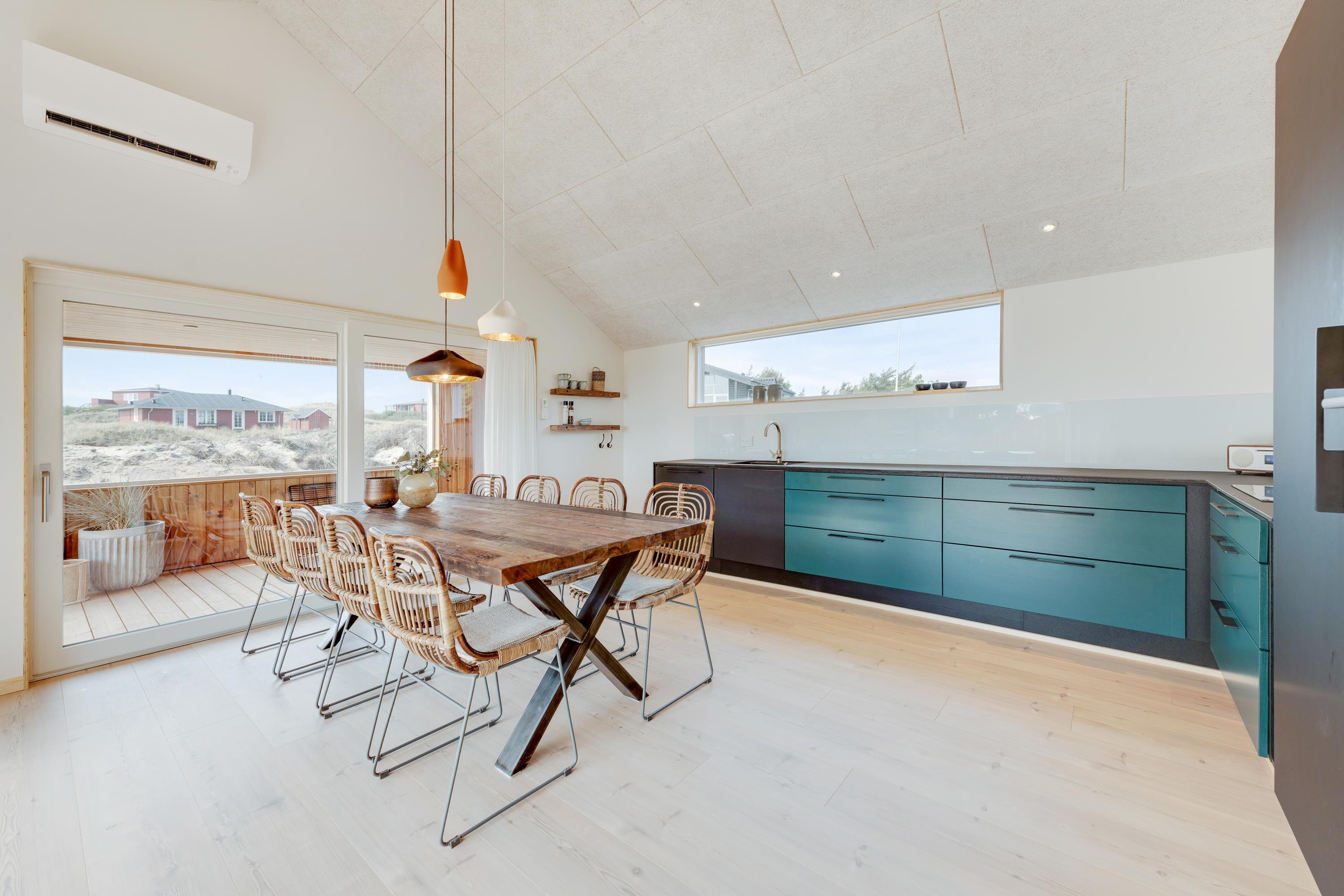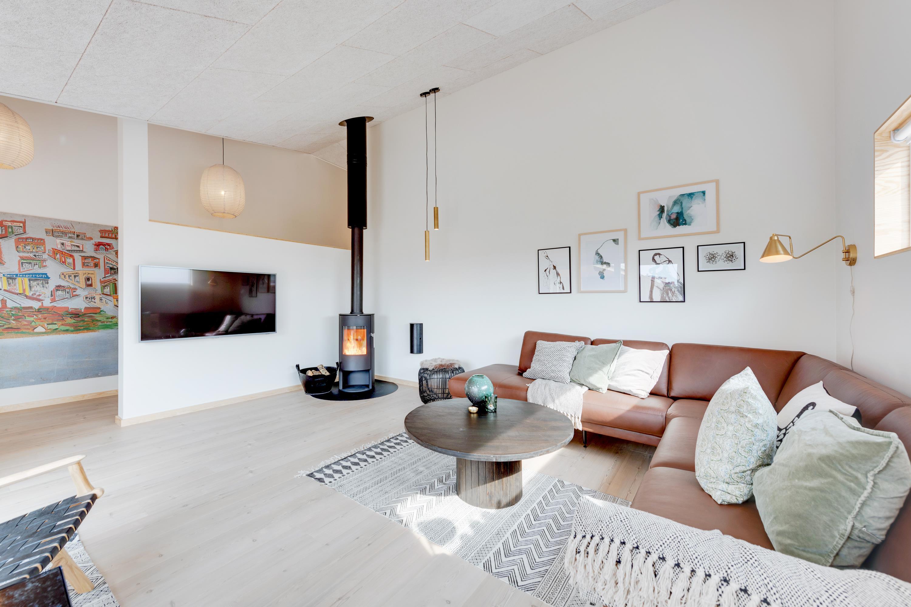Stuen og køkkenet ligger i åben forbindelse med hinanden, og her sørger store vinduespartier for lys og udsyn til den flotte natur. Her er der også rig mulighed for at bruge ferietiden sammen.