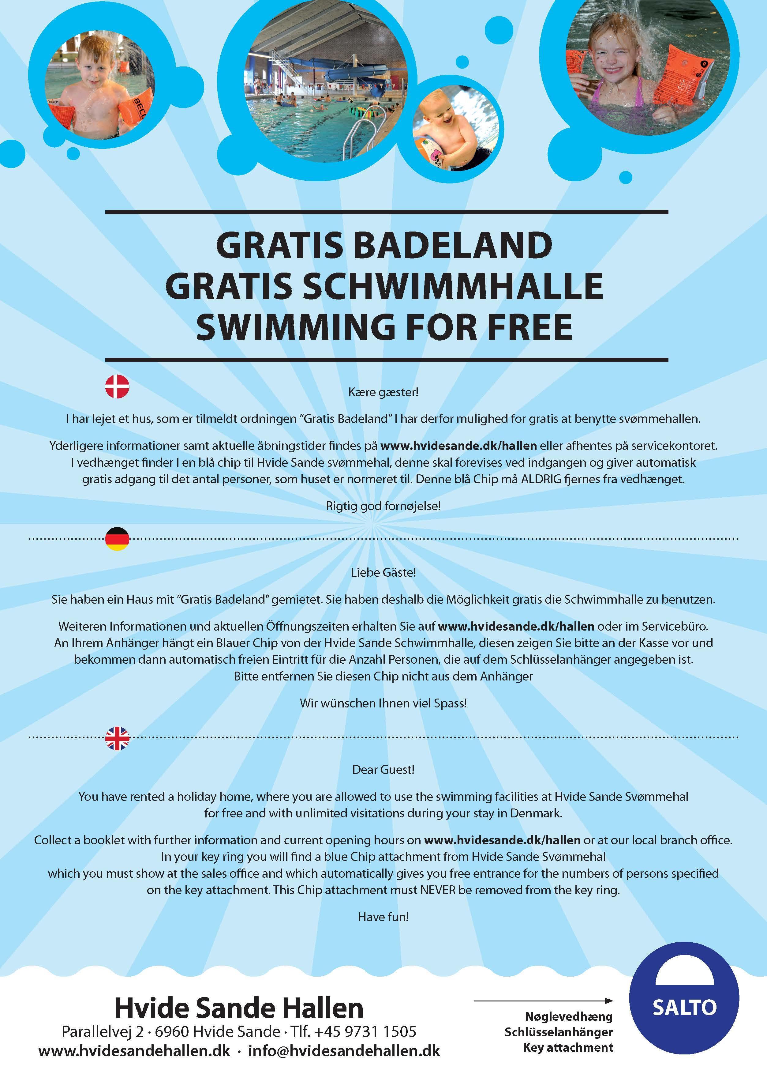 Der er desuden gratis adgang til Svømmehallen I Hvide Sande, som ligger 14 kilometer derfra, så hele familien kan tage i svømmehal.