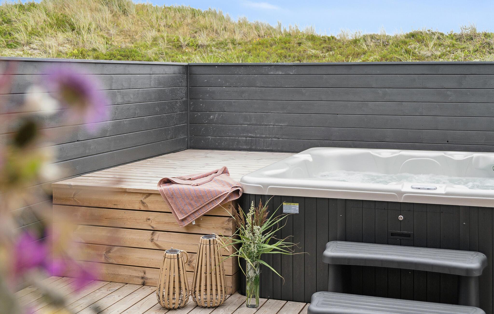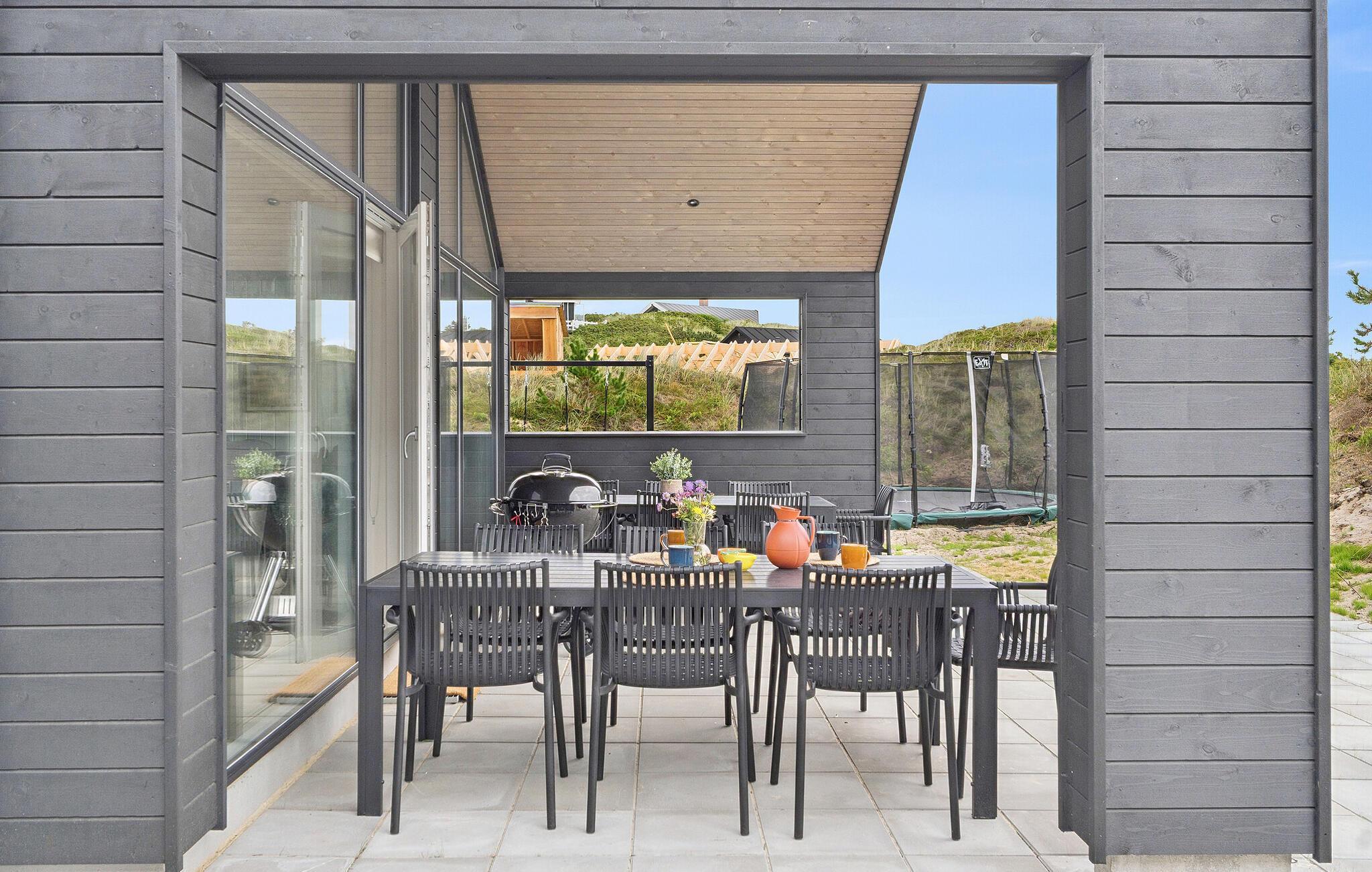 Slap af i det overdækkede udendørsområde med flere siddeområder og liggestole. Brug det udendørs spabad eller nyd middagen i den friske luft på den overdækkede terrasse. Børnene vil nyde trampolinen, gyngen og masser af plads til at lege og boltre sig, mens I nyder udsigten over de omkringliggende klitter.