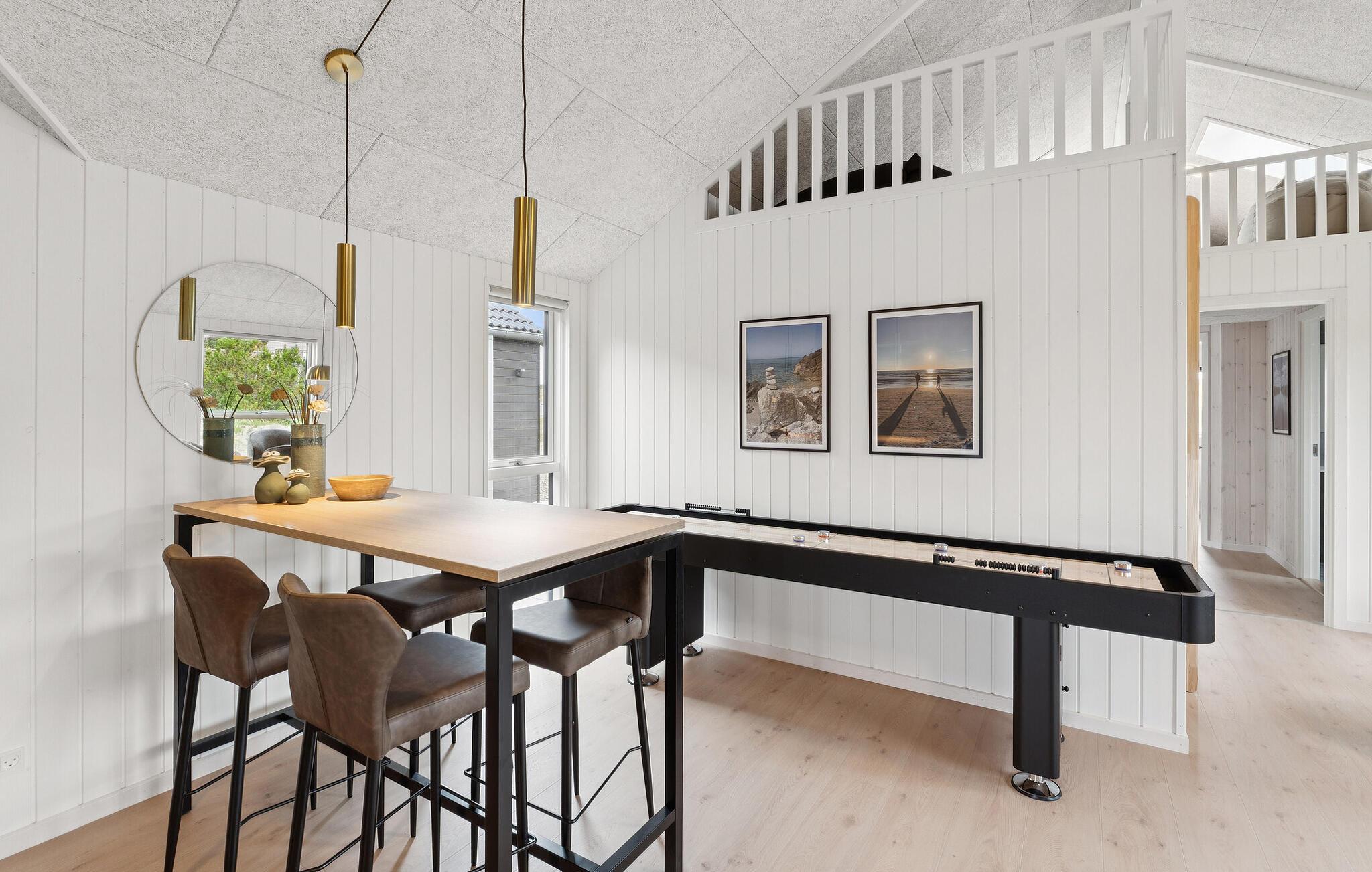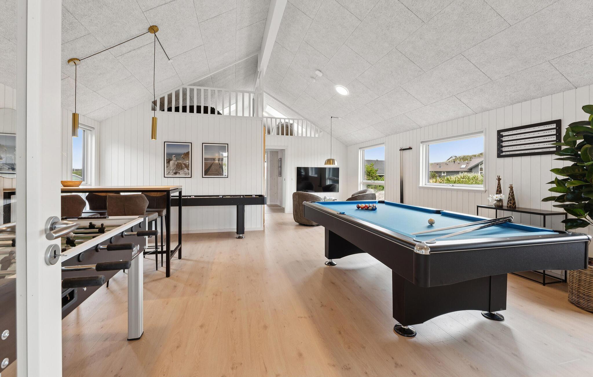 Den lyse opholdsstue kan fremvise højt til loftet og store panoramavinduer. Slap af i de komfortable sofaer eller nyd måltider sammen ved det lange spisebord med plads til alle jeres feriegæster. Lav mad i det moderne køkken med en rummelig køkkenø, apparater af høj kvalitet og masser af opbevaringsplads. Nyd sociale aftener i aktivitetsrummet med billard, bordfodbold og shuffleboard. Poolområdet med rutsjebane, volleyballnet og modstrømssystem sørger for sjov svømning, mens saunaen tilbyder ekstra afslapning.