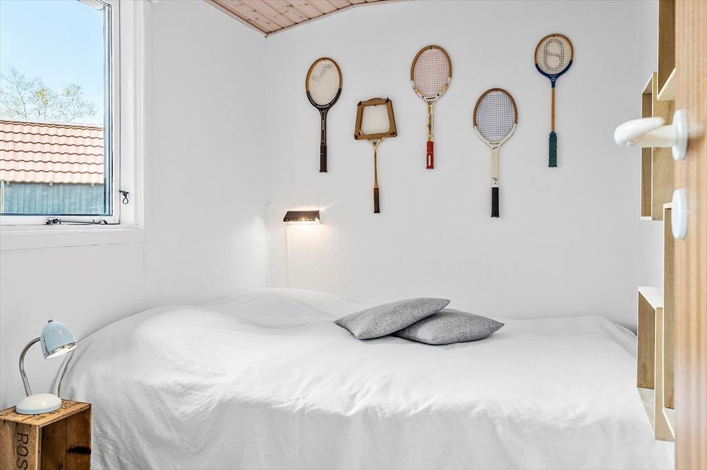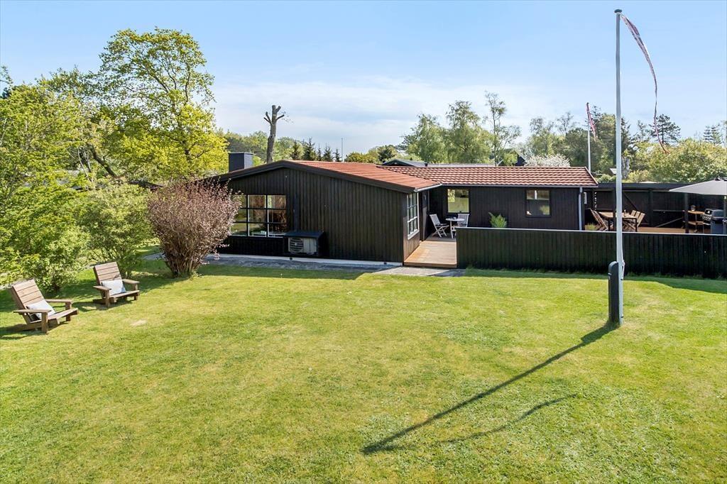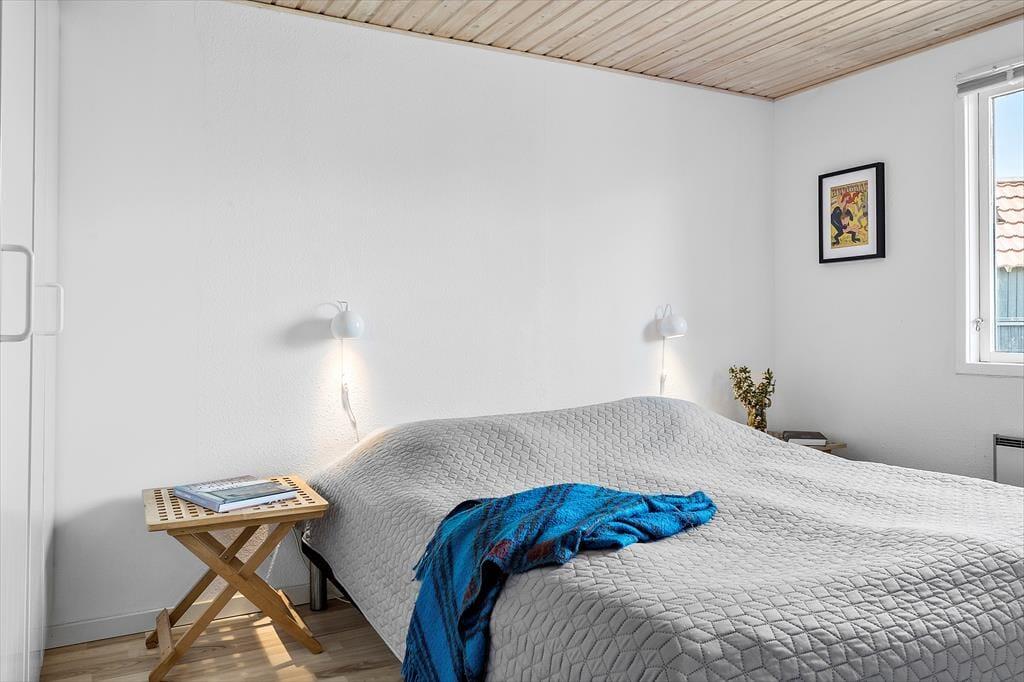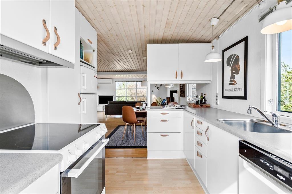 Brændeovnen varmer nemt den hyggelige stue og det åbne køkken, i direkte forbindelse, op. Sommerhuset har desuden varmepumpe med køl. Køkkenet har induktionskomfur samt opvaskemaskine, og fra køkkenet er der udgang mod øst til haven. Feriehuset har fra fordelingsgang adgang til tre gode soverum med dobbeltsenge.