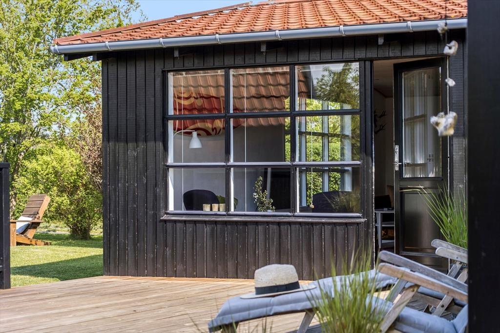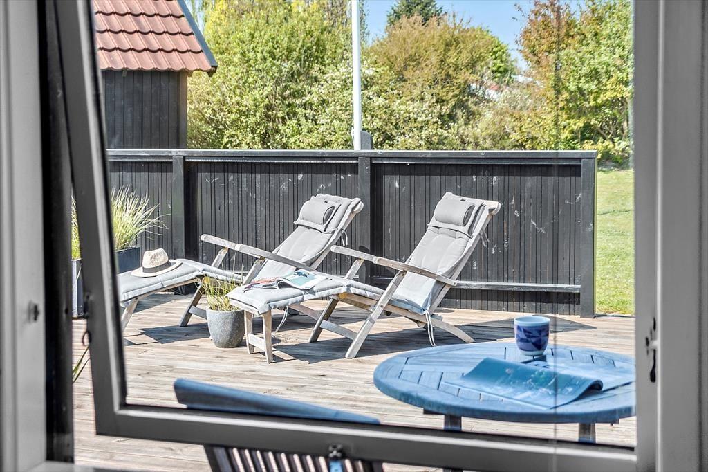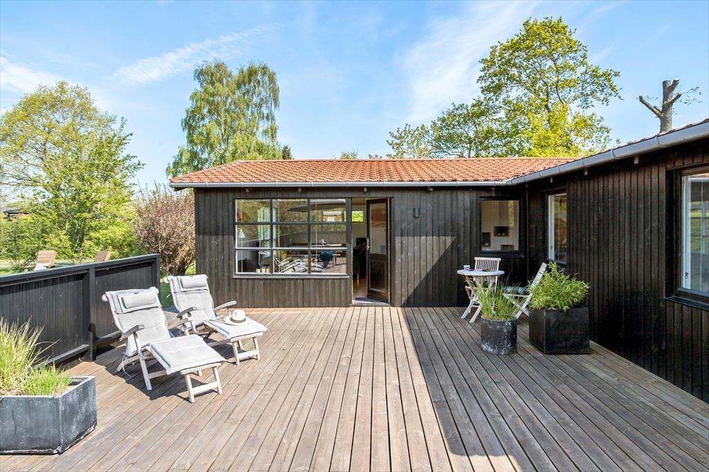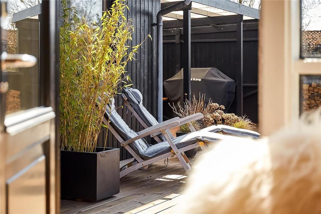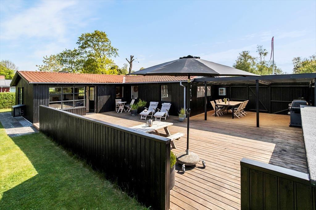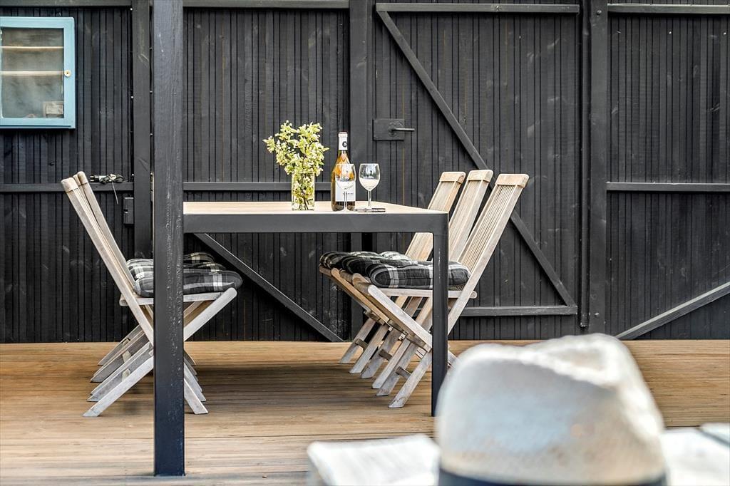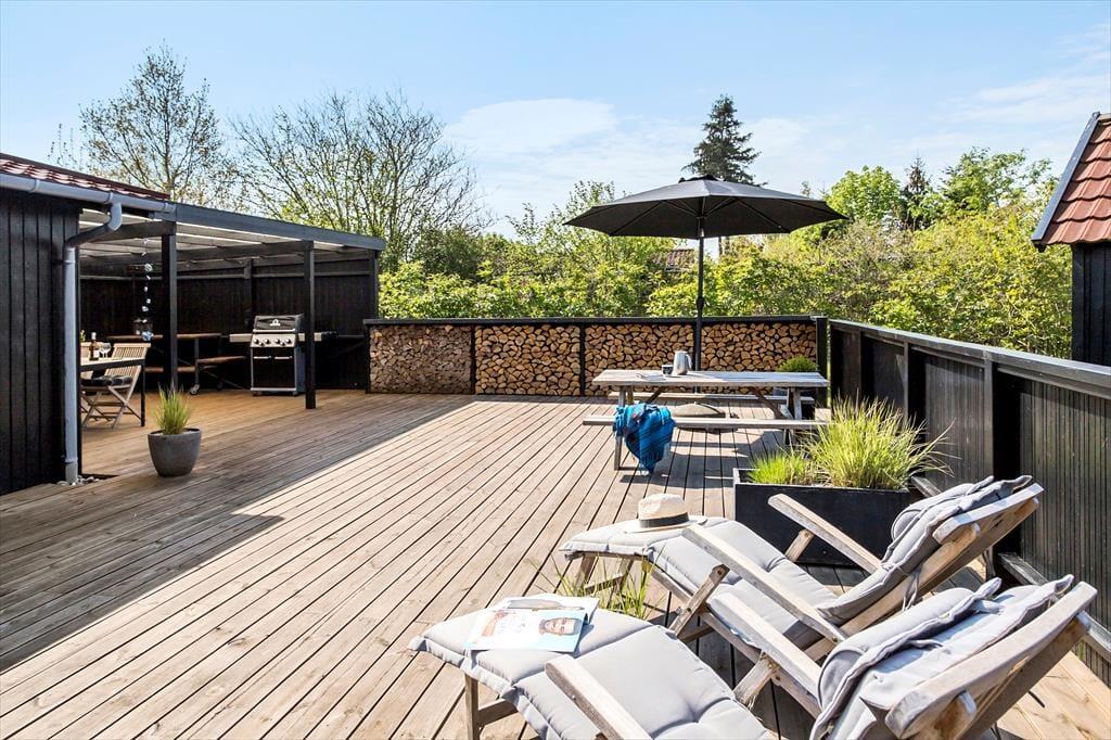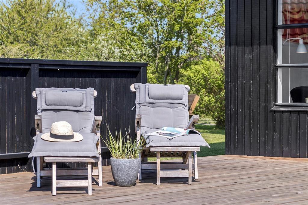 Fra stuen er der direkte udgang til stor ny, solrig og fantastisk terrasse. Den er åben, men skærmet mod indkig, så her kan udelivet nydes i fulde drag. Falder duggen, har terrassen også en stor overdækket del, hvor aftenerne kan nydes. Uanset hvordan sommervejret arter sig, kan man opholde sig på terrassen. Selv forårs- og efterårssolen kan nydes her, og en stor del af jeres ferie vil blive tilbragt her, mens der tilberedes mad på gasgrillen.