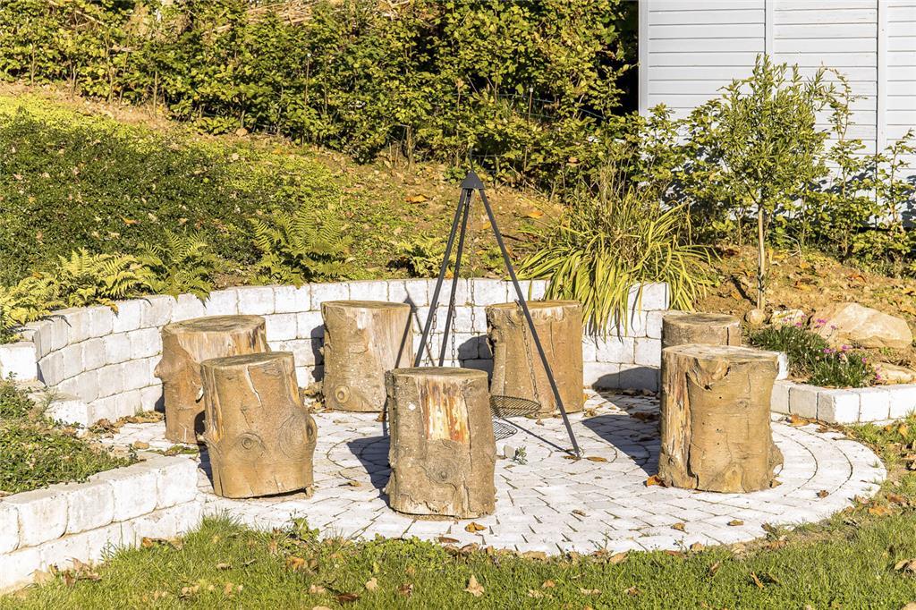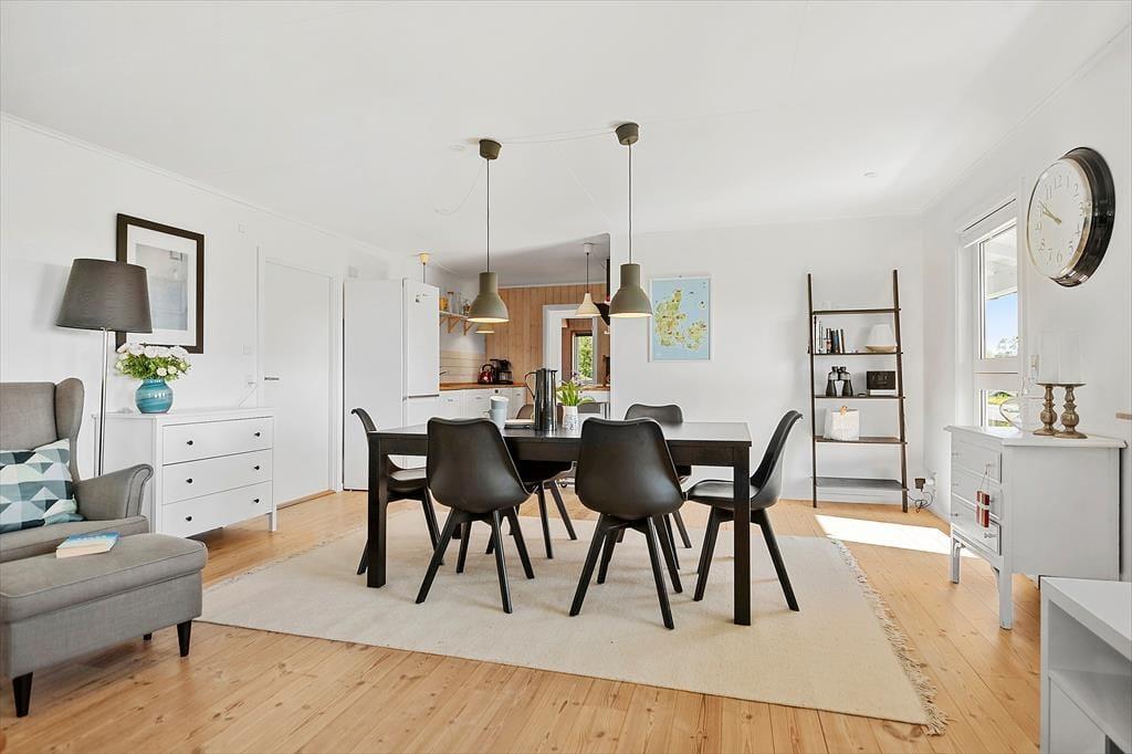Fra køkken/alrummet er der adgang til en stor syd-/østvendt terrasse, hvorfra man kan nyde havudsigten fra østsiden. I opholdsstuen kan man sidde og hygge sig i sofagruppen og nyde brændeovnens behagelige varme på de kølige dage.