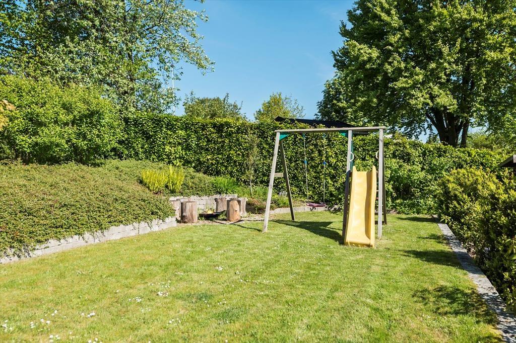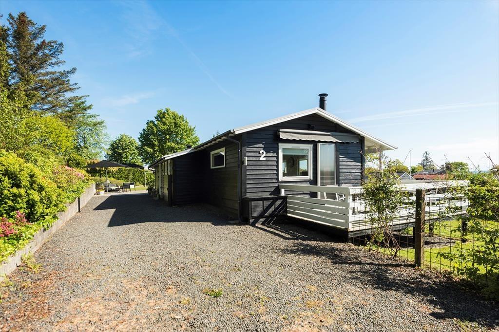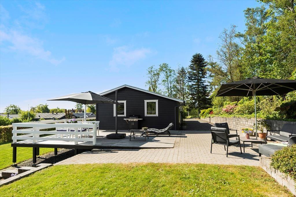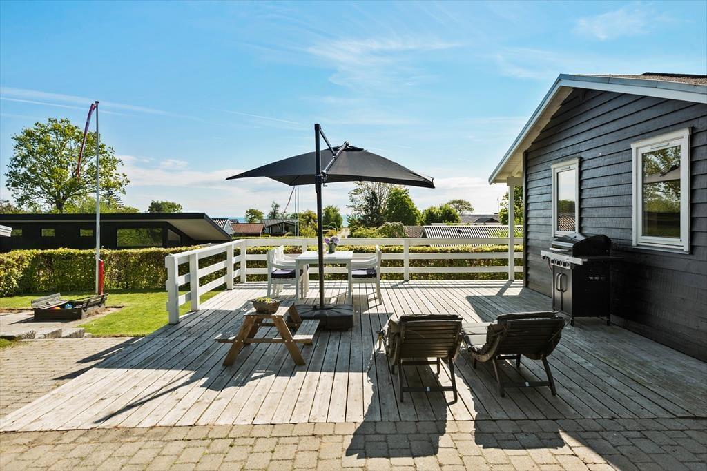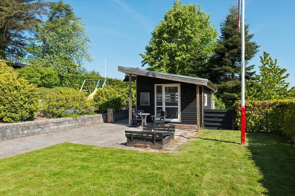 Sommerhuset er højtbeliggende i dette sommerhusområde. Fra terrassen er der udsigt til havet og området. Dejlig have på skrånende grund, hvor der er sandkasse, gynger og rutsjebane til de mindste.