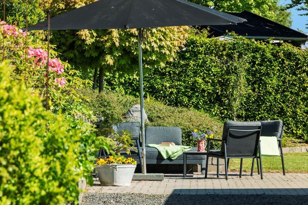 Der er havemøbler, liggestole, parasol og naturligvis en fin gasgril, hvor I kan tilberede dagens måltider og hygge jer på de lune sommeraftener.
