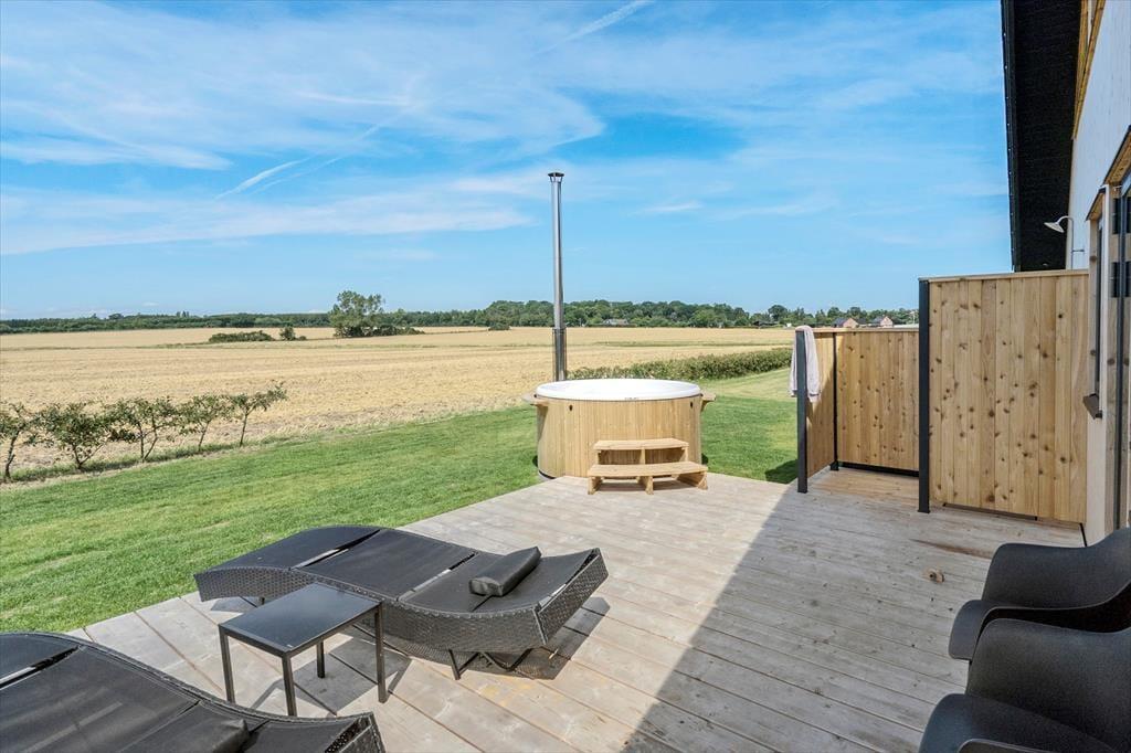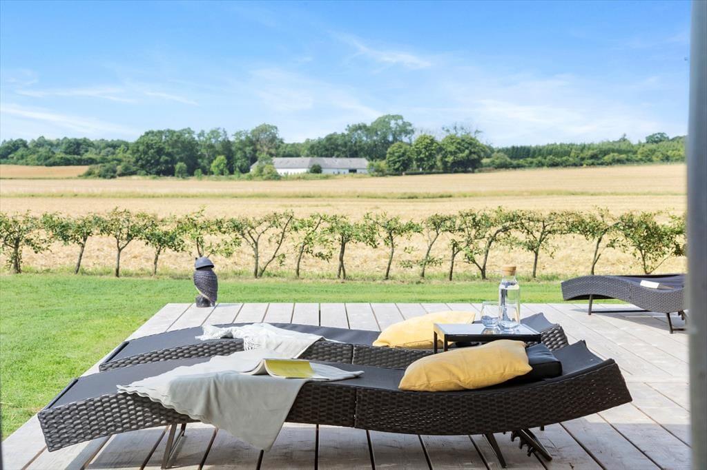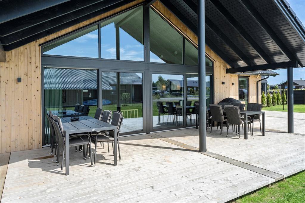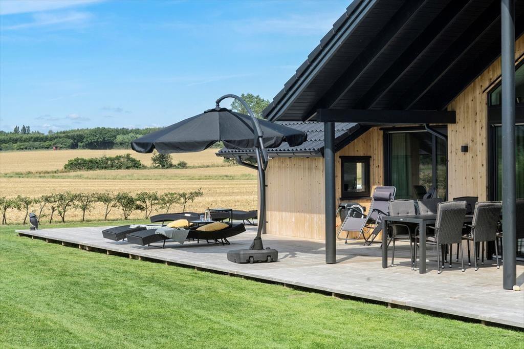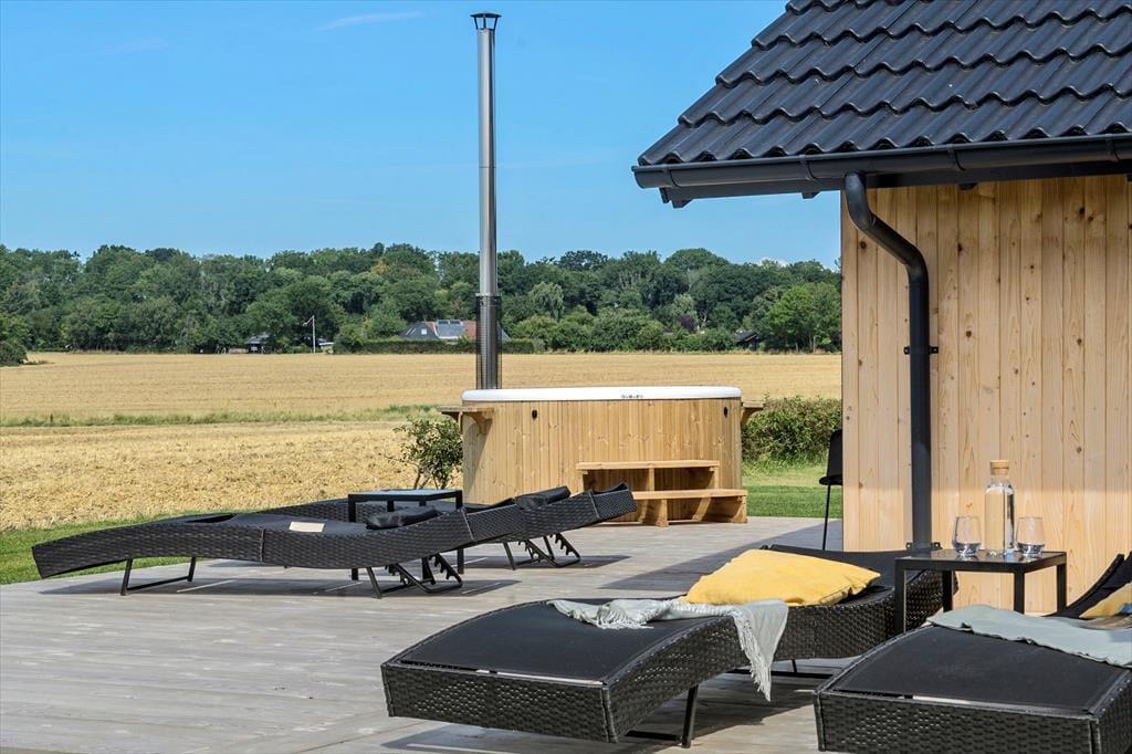 Mulighederne for at opholde sig ude under sit ophold er store. Rundt om huset er der flot træterrasse med fine havemøbler og liggestole. Det vil være oplagt at tilberede flere af dagens måltider ved udekøkkenet og på husets gas eller kul grill og nyde dem på den delvist overdækkede terrasse. Her er der mange muligheder for at finde et spot til afslapning, læsning af en god bog, eller måske bare en ferie-middagslur.