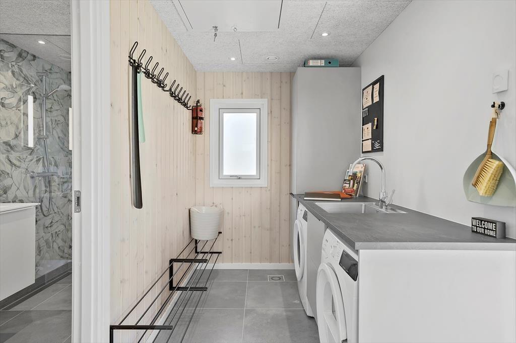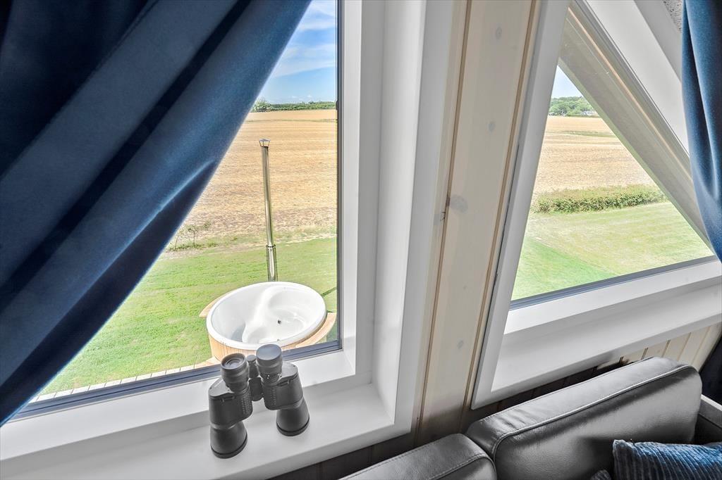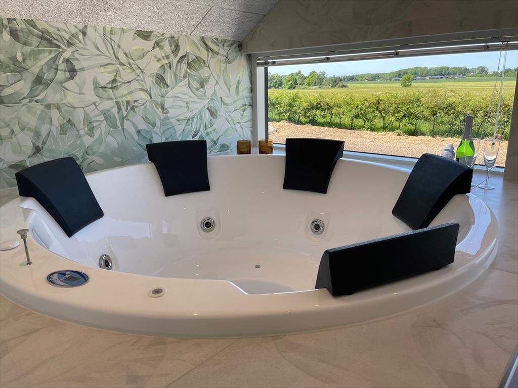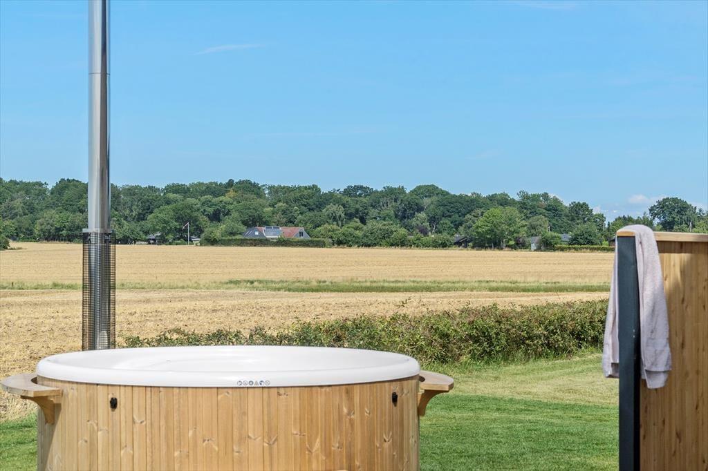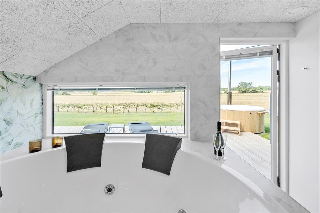 Der er to super flotte badeværelser i huset, begge med toilet og bruser. Det ene er desuden med stort indendørs spabad til 6 personer og med den flotteste udsigt over marker, som kan nydes året rundt. Ved indgangen er der bryggers med god garderobeplads og både vaskemaskine og tørretumbler, så I kan få vasket badehåndklæderne efter en lang dag på stranden.