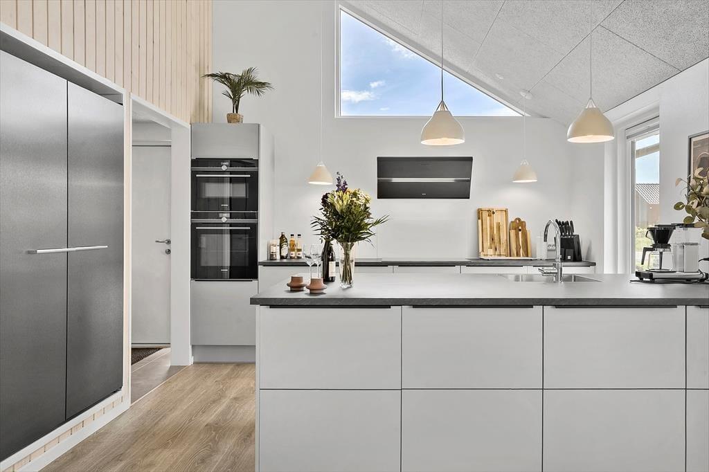 Central placeret i huset er det store køkken/alrum, hvor køkkenet indeholder alt, hvad I har brug for under jeres ophold af moderne faciliteter til lækker madlavning. Her kan I nyde lysindfaldet og den fine udsigt ud over markerne. Her er to store køleskabe og desuden en fryser i skuret.