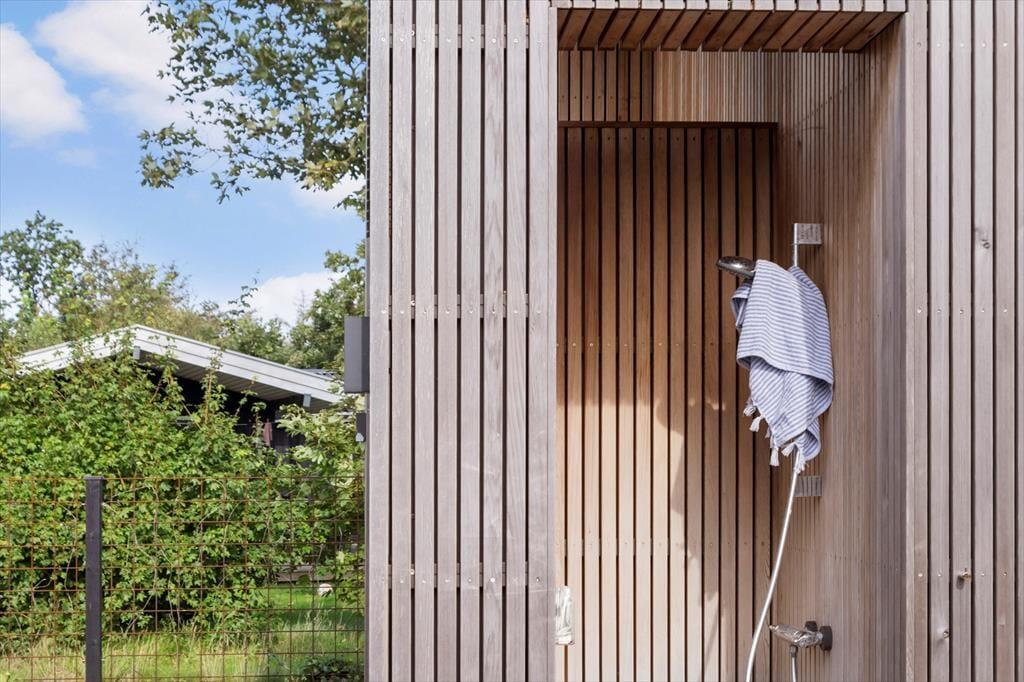 Til de køligere aftener er der rig mulighed for at tænde op i vildmarksbadet og hygge sig. Der er desuden også en udendørs bruser.