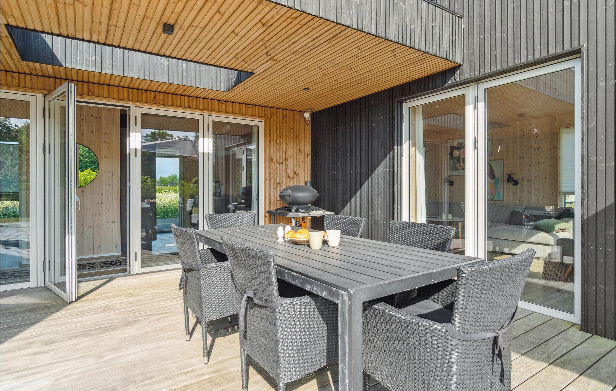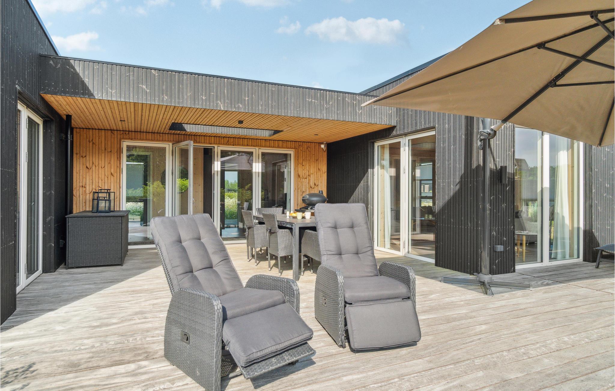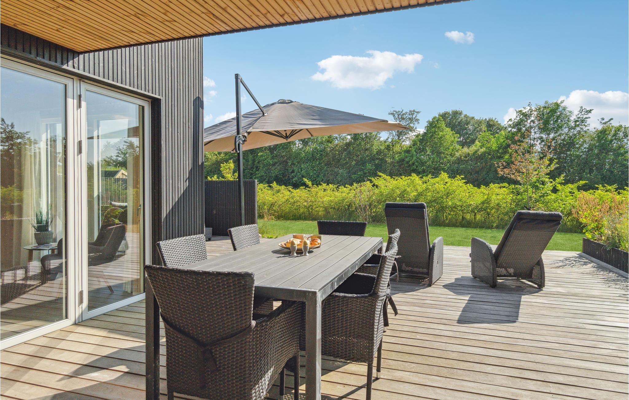 Moderne træhus nær Saksild Strand med stor terrasse og hyggelig atmosfære for familieferie.