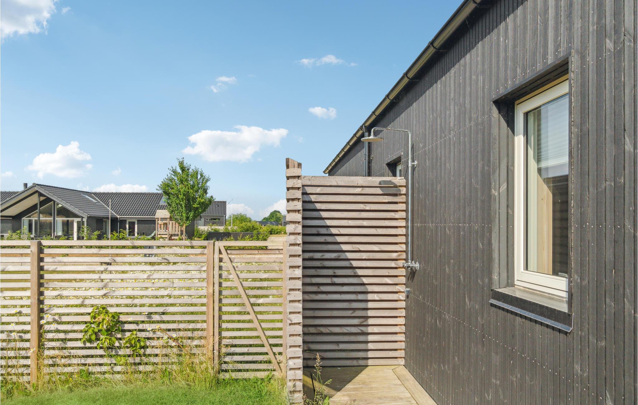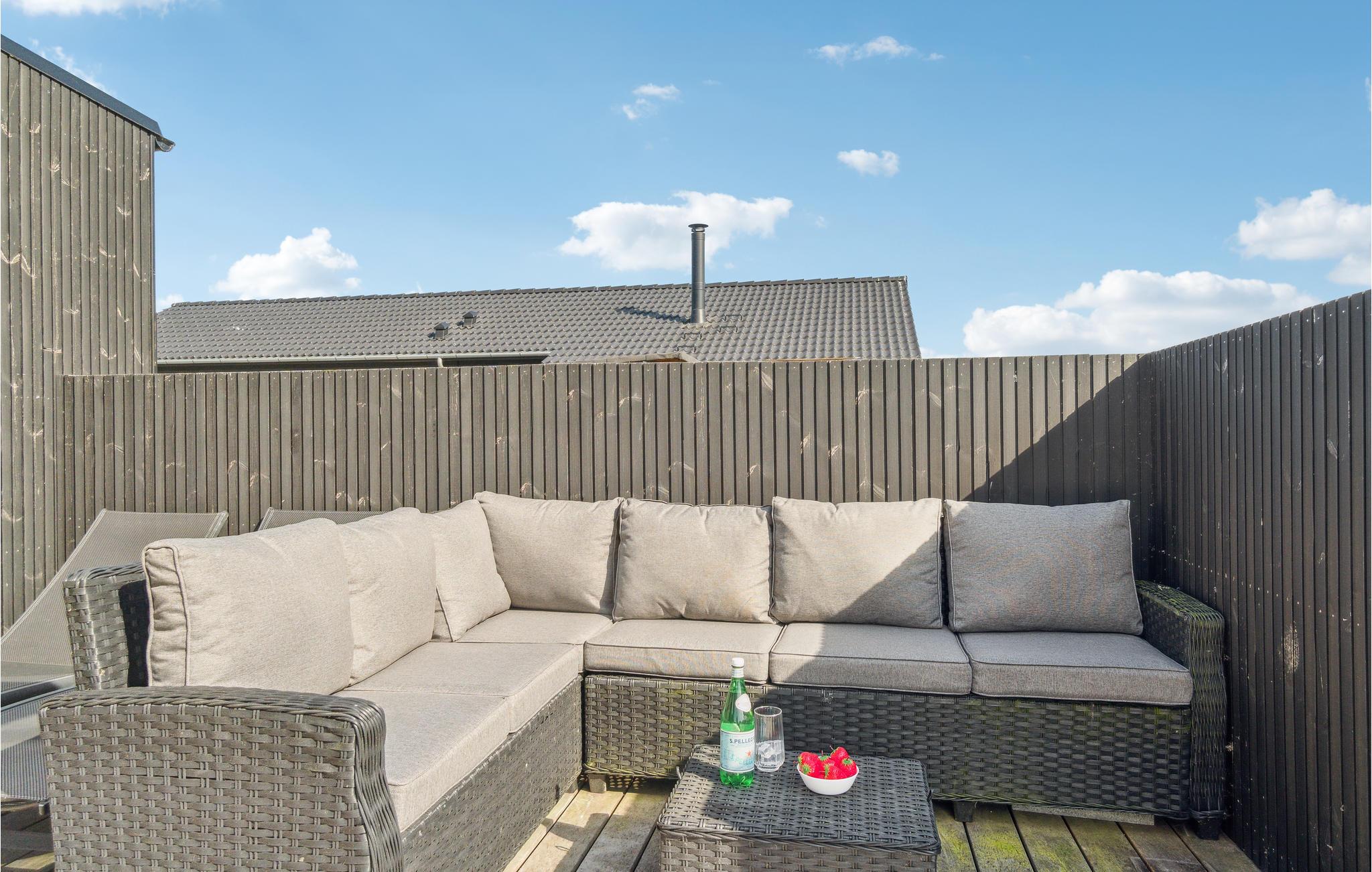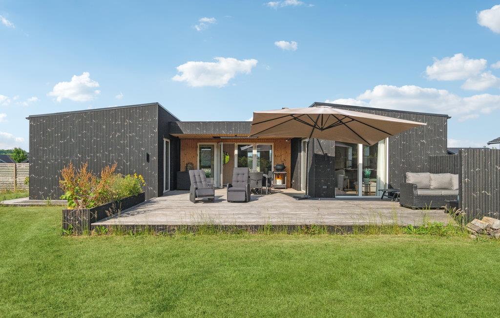 Moderne træhus nær Saksild Strand med stor terrasse og hyggelig atmosfære for familieferie.
