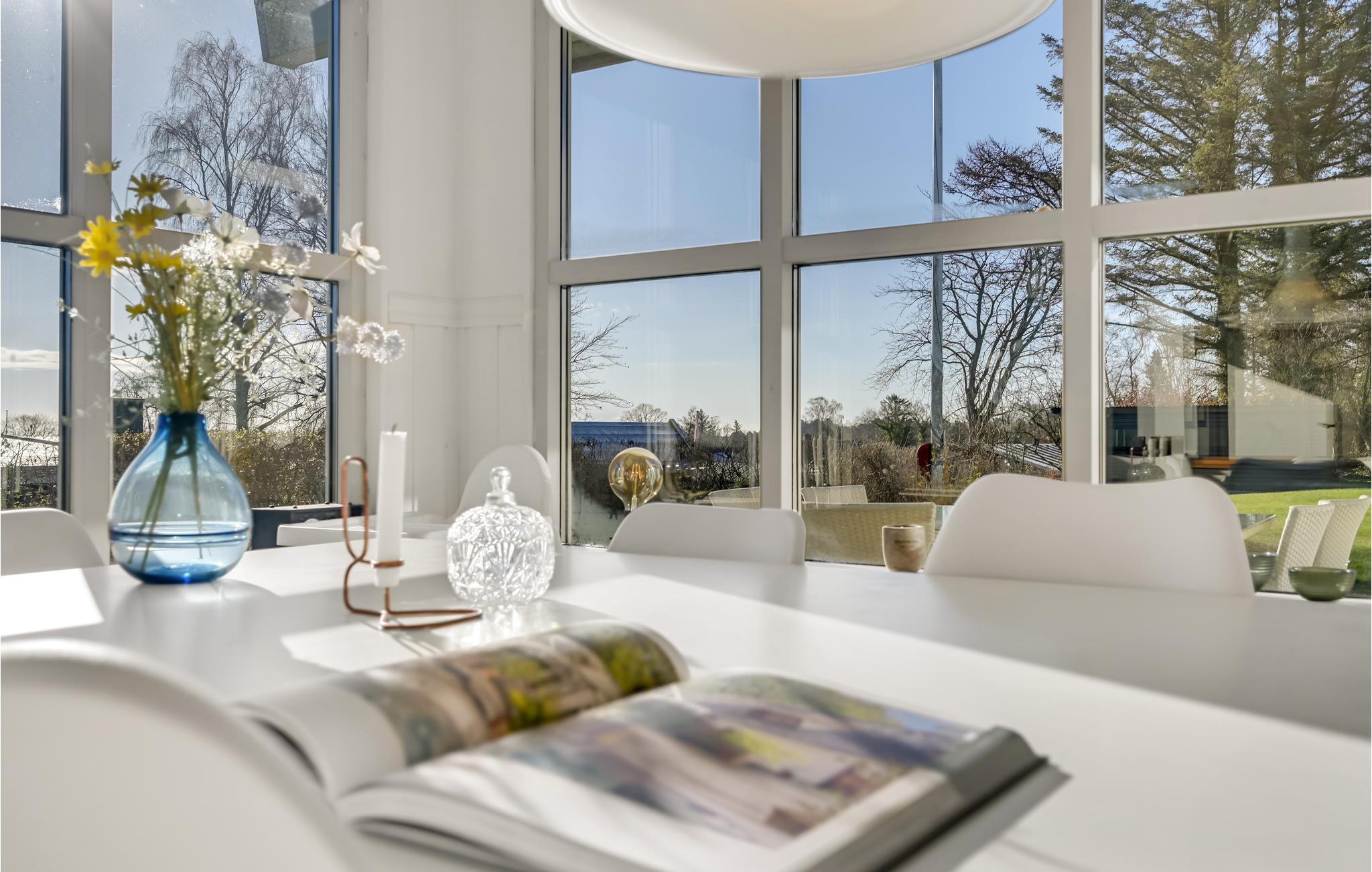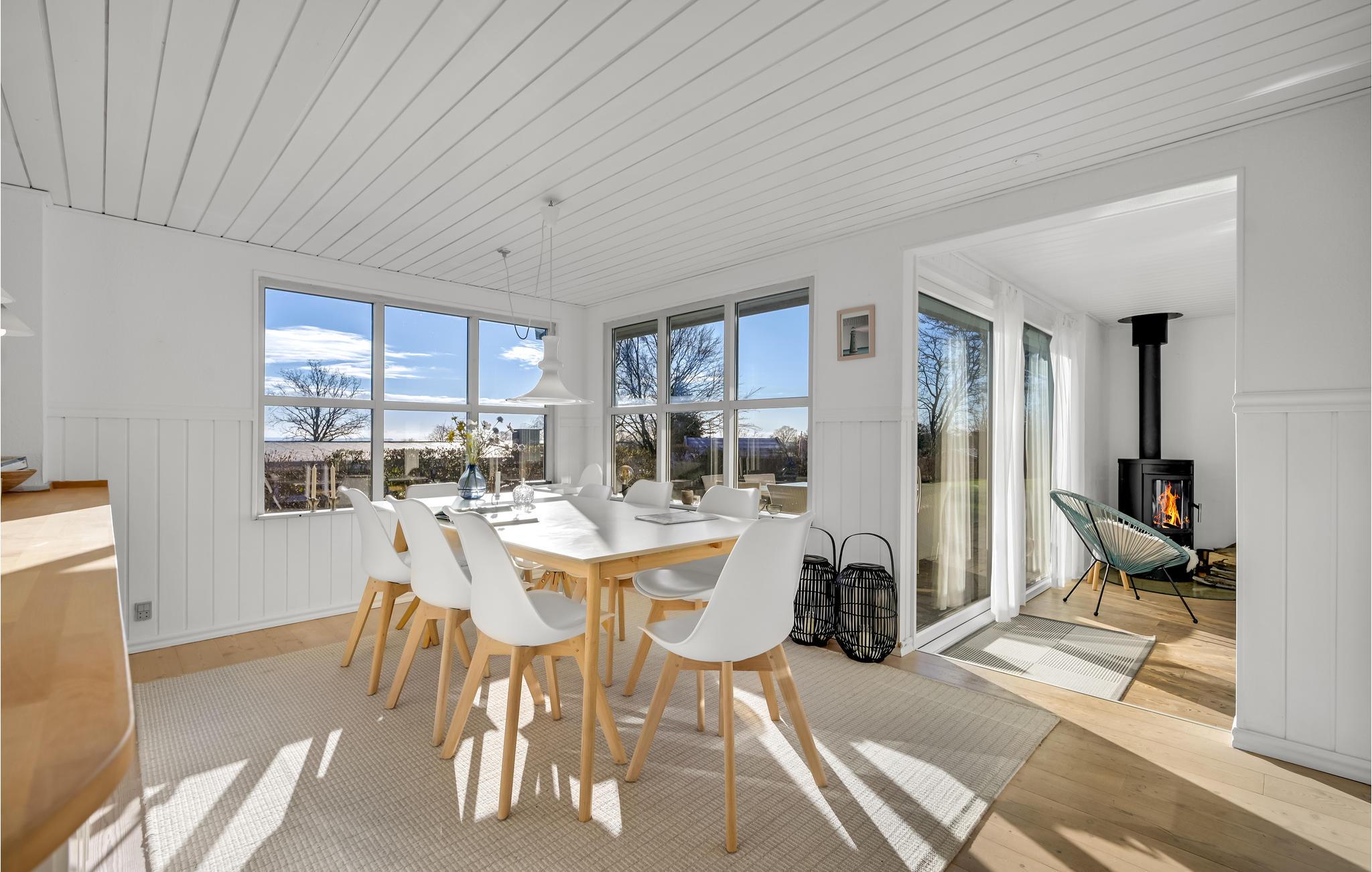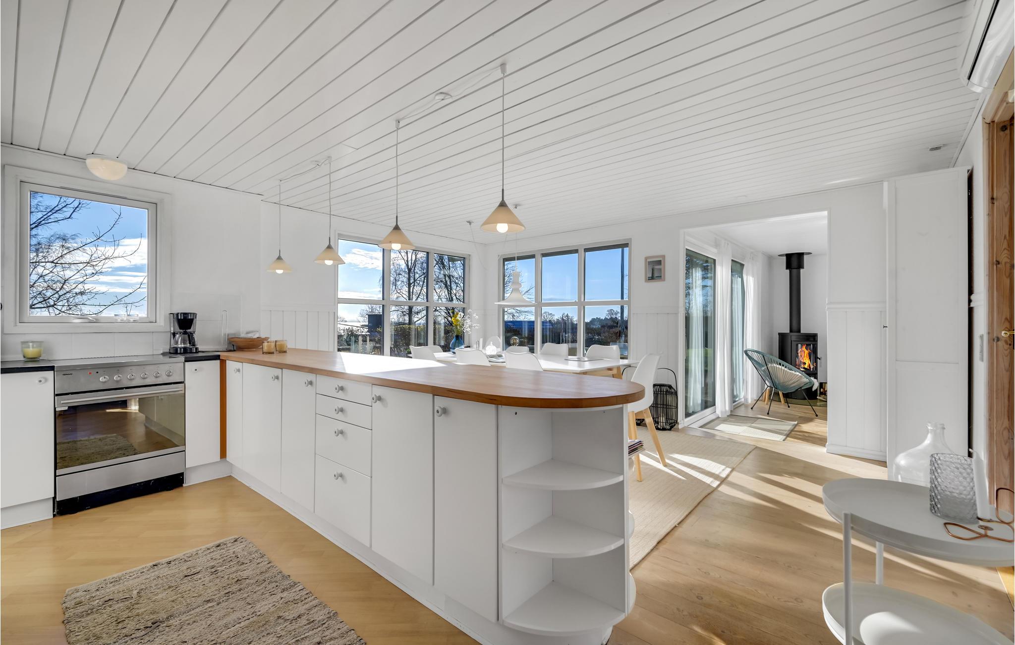 Glæd jer til denne indbydende feriebolig, som er lyst og lækkert indrettet samt med rummelige forhold, der gør den perfekt til en børnefamilie. Både, når I klargør dagens måltider i køkkenet og sætter jer til rette rundt om spisebordet, er der udsigt til vandet gennem de store, sprossede vinduespartier. Om aftenen kan I læne jer godt tilbage i de bløde møbler, snuppe en bog fra hylden, spille spil, se en film eller snakke om dagen, der er gået, mens ilden knitrer i brændeovnen.