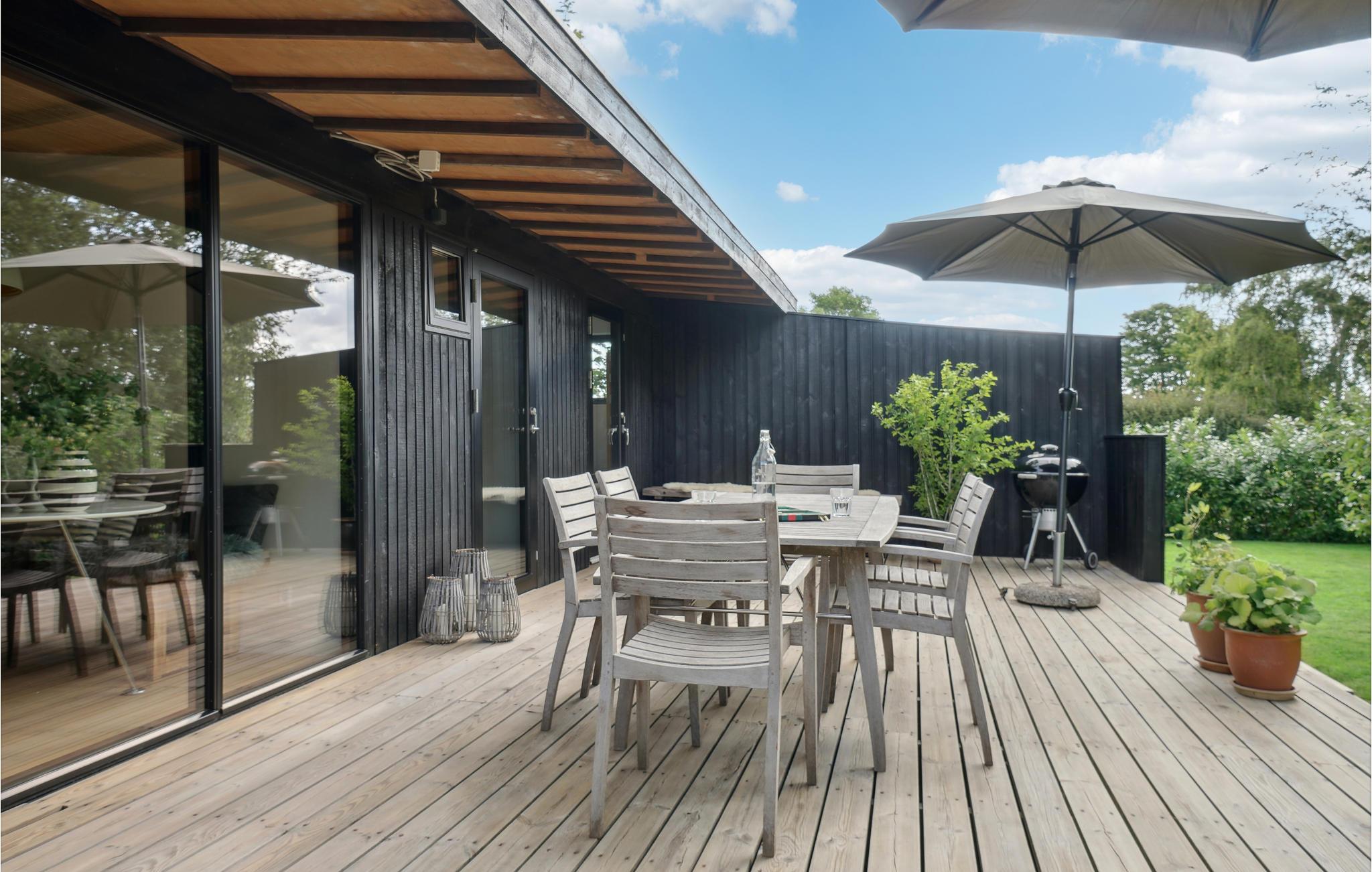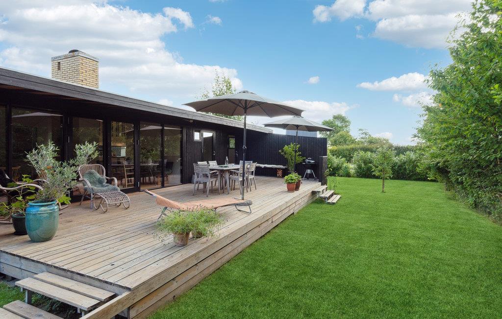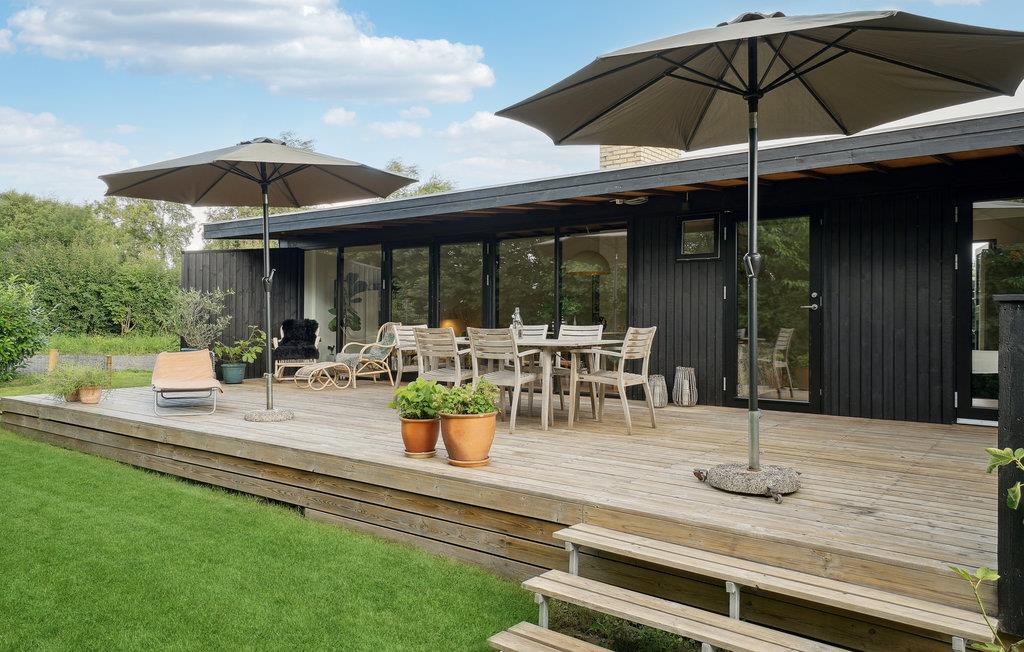 Lyst og stilfuldt feriehus tæt på den børnevenlige Saksild Strand med dejlig træterrasse og privat have.