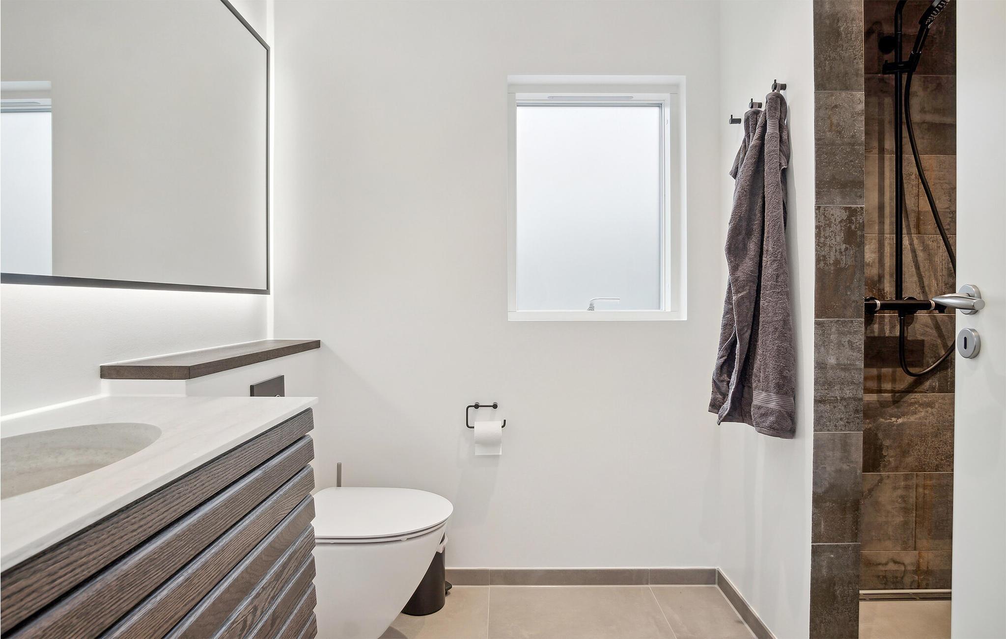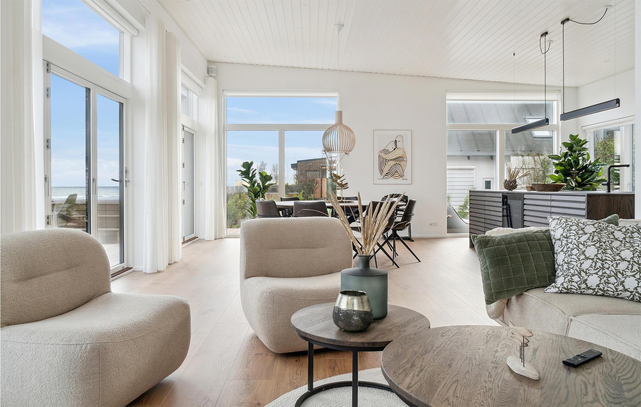 I dette rummelige og smukke hus kan I nyde udsigten til vandet fra den store stue gennem de imponerende glaspartier. Huset er kendetegnet af en enormn komfort, varm belysning og møbler af høj kvalitet. I kan arrangere en kokkekonkurrence i det store køkken med centralt placeret køkkenø, og maden kan I spise ved bordet med udsigt til vandet. I kan også se en film eller betragte havets bølger fra sofaen.