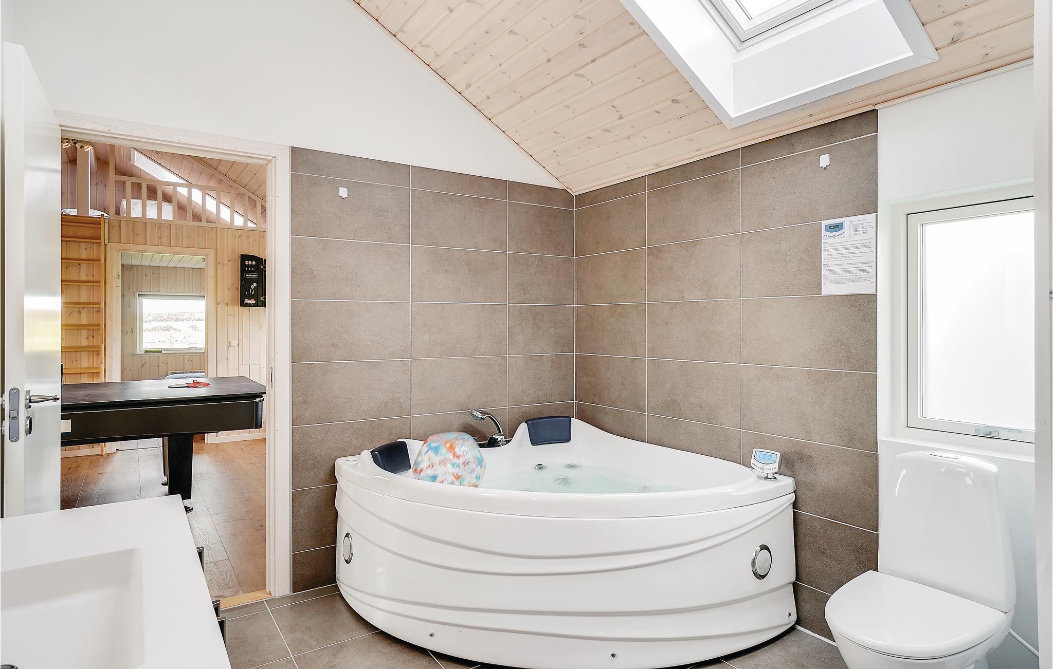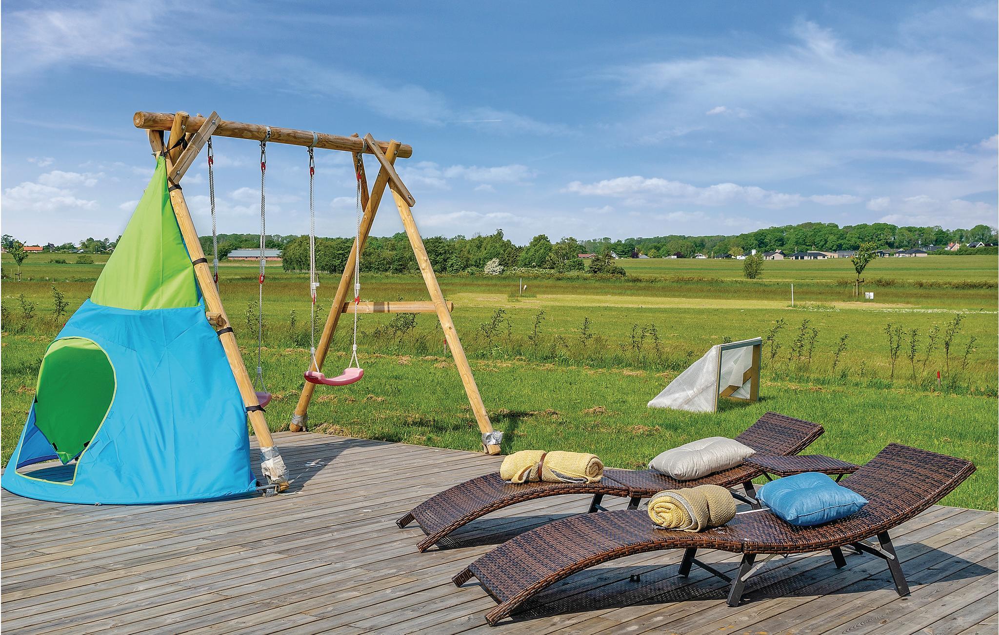 Stort, dejligt sommerhus med plads til to familier, hvis I har lyst til at dele ferien sammen med venner, familie eller bare have god plads til jer selv. Der er flot, stort aktivitetsrum med mulighed for en unik ferie med masser af konkurrencer, sjov og leg. Den gode stue ligger i åben forbindelse med køkkenet, der er hele fire soveværelser - alle med dobbeltsenge samt en hems med to sovepladser på madrasser. I sommerhalvåret er der mulighed for at gøre indkøb på campingpladsen ved siden af huset.