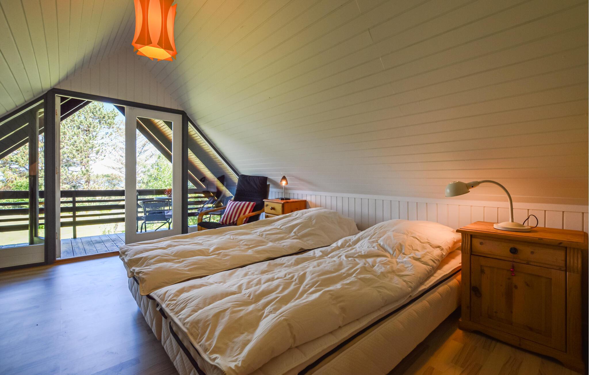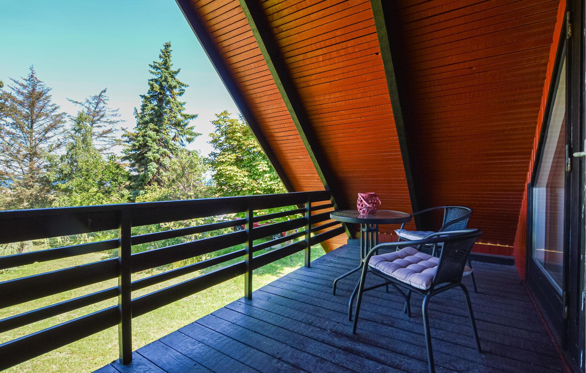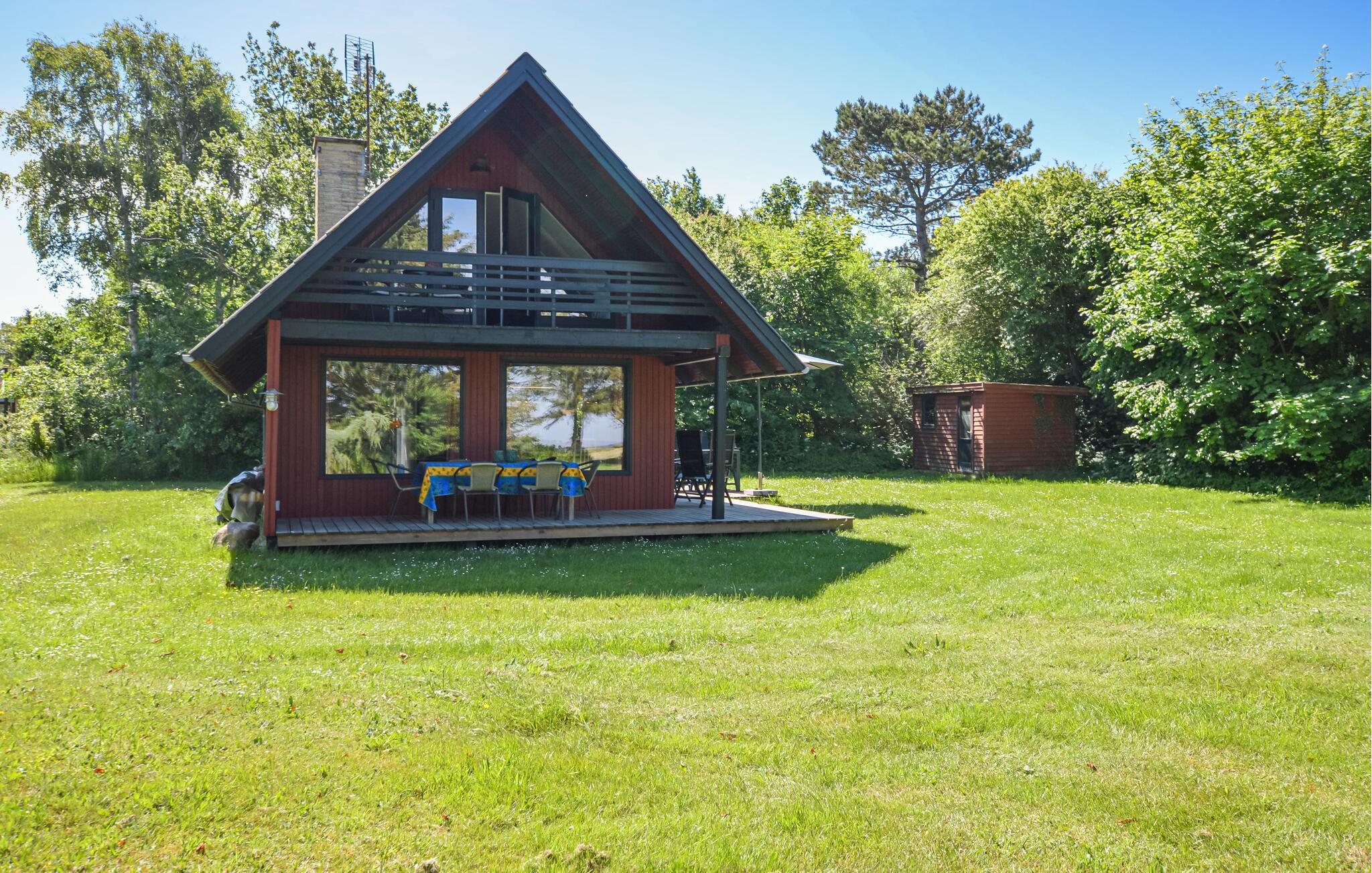 I kan tage håndklædet over armen og gå ned og bade hver morgen, blot 100 m fra huset er der om sommeren opsat badebro. Huset indeholder badeværelse med brus dejligt åben køkken ud mod spisestue/stue, pejsen er kun til pynt hyggen kommer når biopejsen tændes, fra køkkenet udgang til både åben og overdækket terrasse, hvor I kan nyde udsigten til vandet, 1 soveværelse nede, via trappe opgang til 2 soveværelser, det store uden dør med direkte adgang til overdækket altan samt enestående udsigt til vandet. Her er masser af ro til sjælen, træk stikke ud og nyd de smukke omgivelser og roen til sjælen ved at være tæt på vandet.
