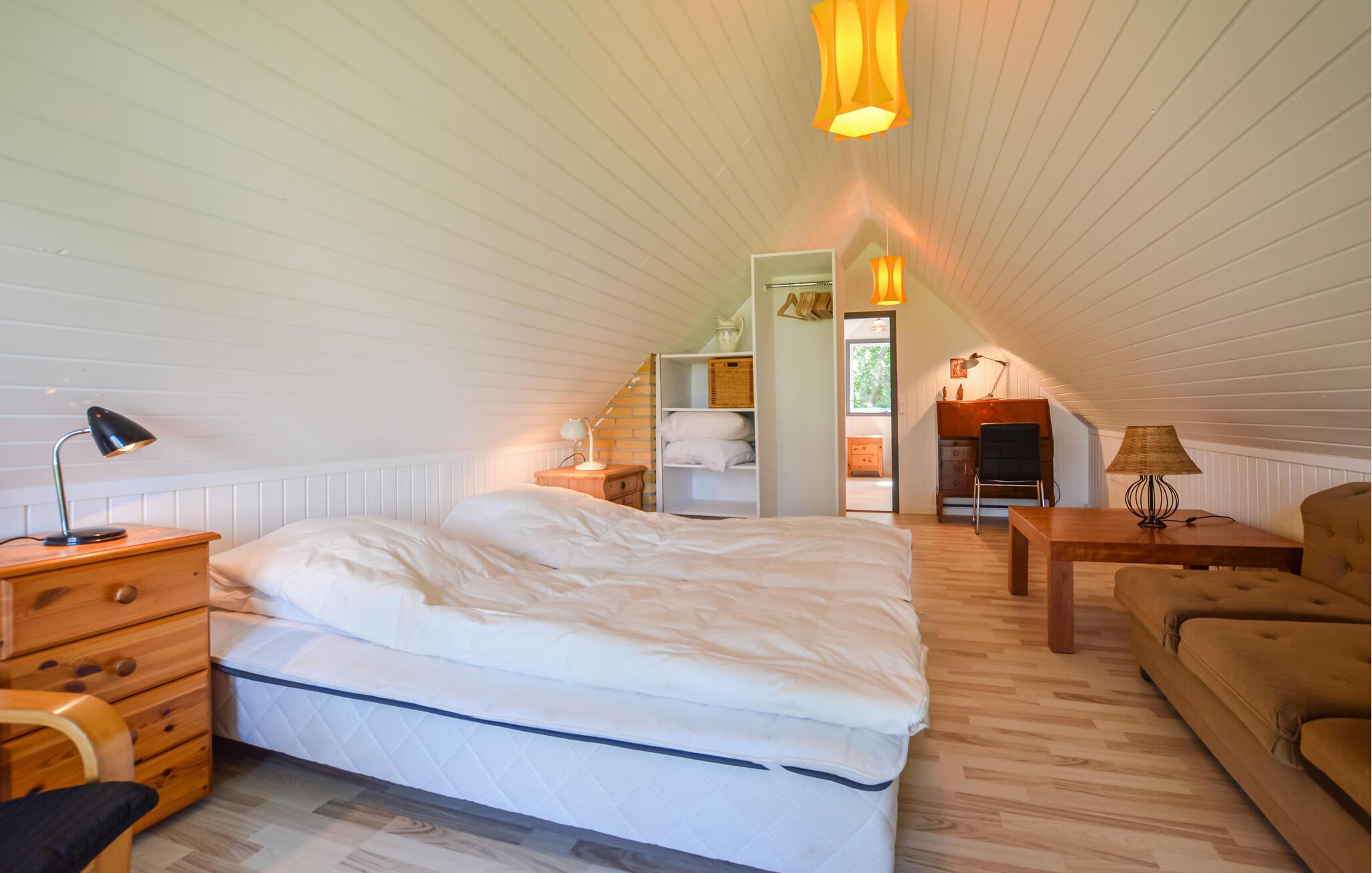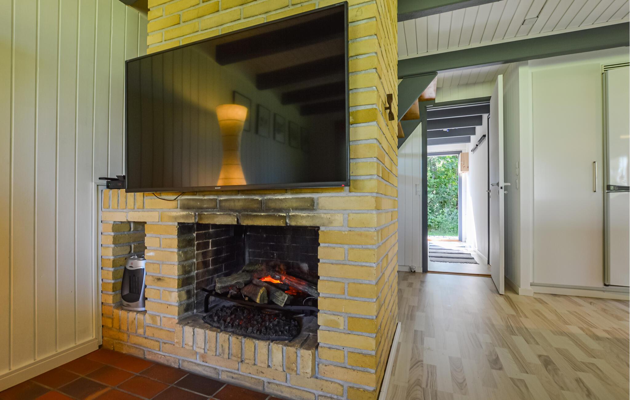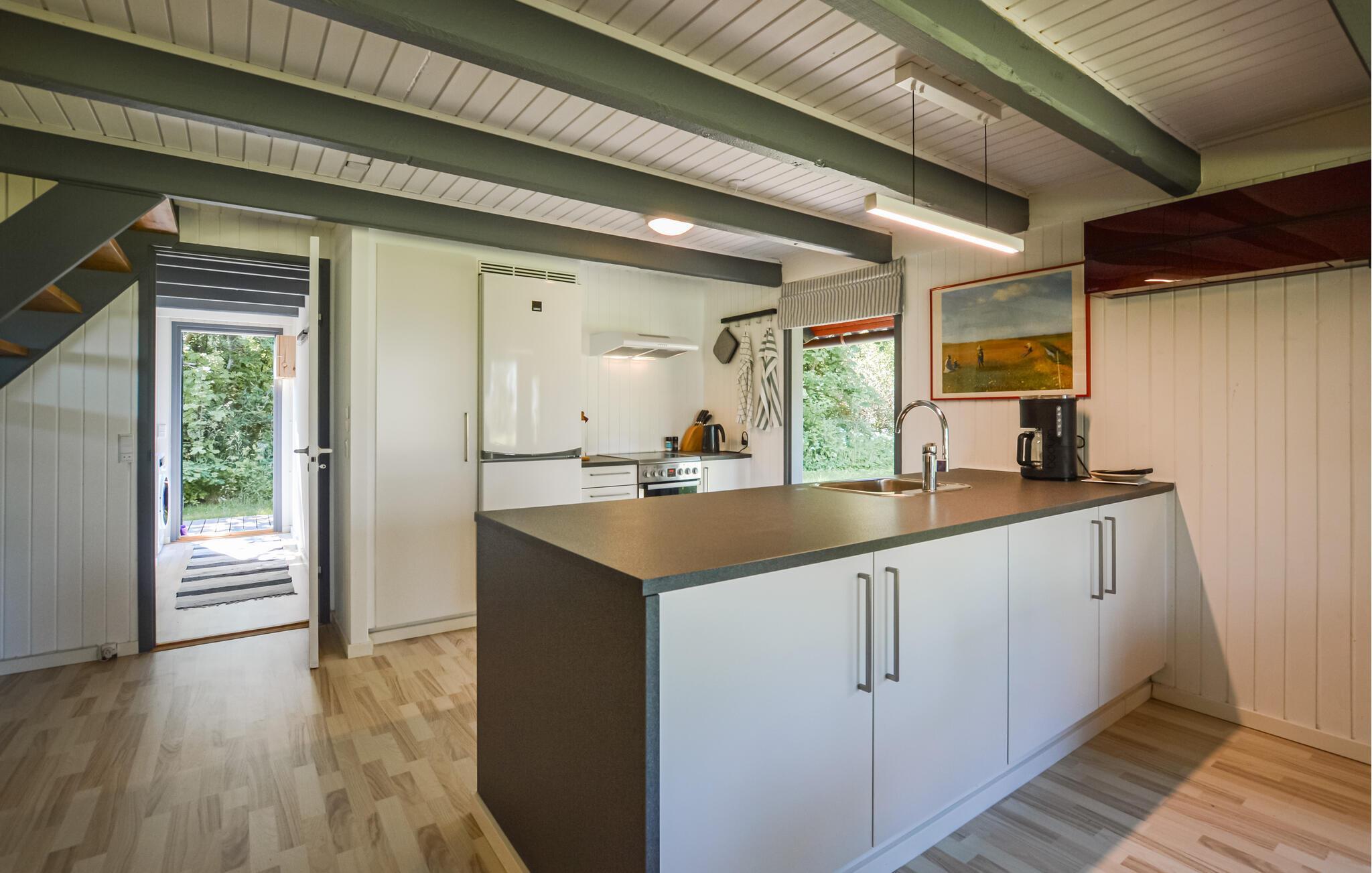 I kan tage håndklædet over armen og gå ned og bade hver morgen, blot 100 m fra huset er der om sommeren opsat badebro. Huset indeholder badeværelse med brus dejligt åben køkken ud mod spisestue/stue, pejsen er kun til pynt hyggen kommer når biopejsen tændes, fra køkkenet udgang til både åben og overdækket terrasse, hvor I kan nyde udsigten til vandet, 1 soveværelse nede, via trappe opgang til 2 soveværelser, det store uden dør med direkte adgang til overdækket altan samt enestående udsigt til vandet. Her er masser af ro til sjælen, træk stikke ud og nyd de smukke omgivelser og roen til sjælen ved at være tæt på vandet.
