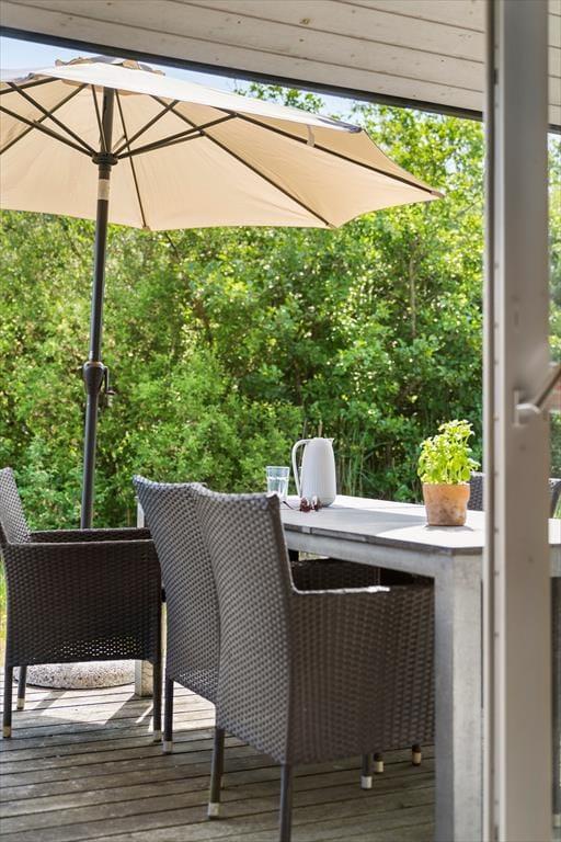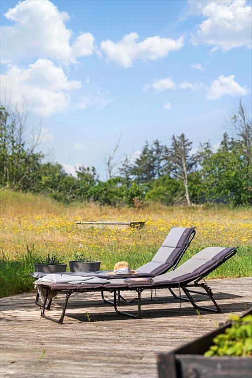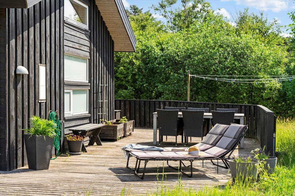 Sommerhuset har også noget at byde på udendørs, hvor du kan nyde den fredelige natur og den friske luft. Fra terrassen kan du tage et hvil i solen, mens du nyder den rolige stemning omkring dig. Den store grund giver masser af plads til både leg og afslapning, og den åbne himmel over dig gør det til en helt speciel oplevelse at sidde ude på de lyse sommeraftener. Den solrige terrasse er perfekt til at samle familien omkring et måltid, mens de lyse sommernætter falder på. Fra sommerhuset er det også nemt at finde skov og strand, så du kan udforske området til fods eller på cykel.
