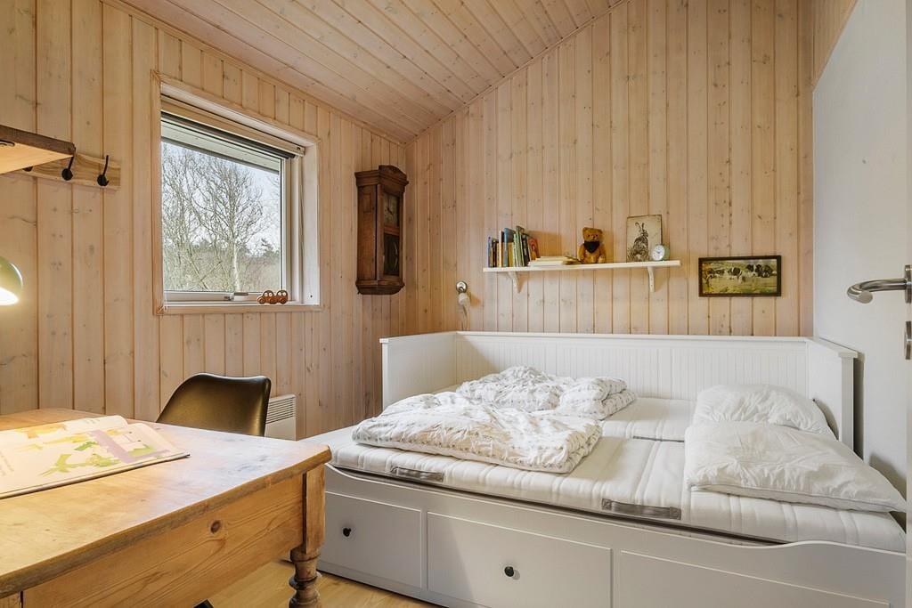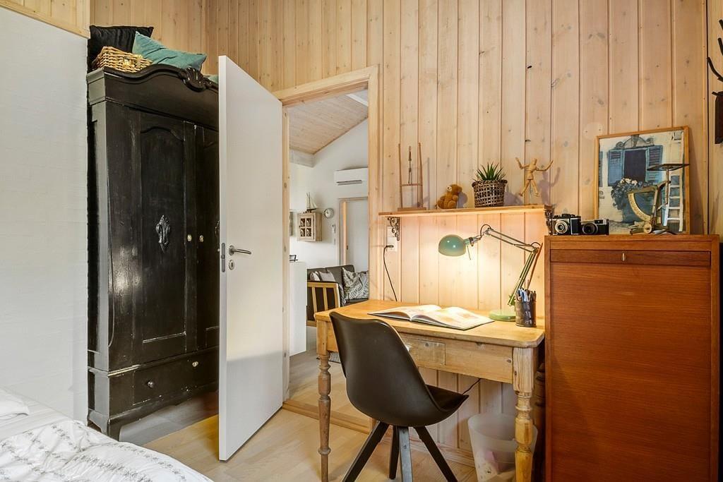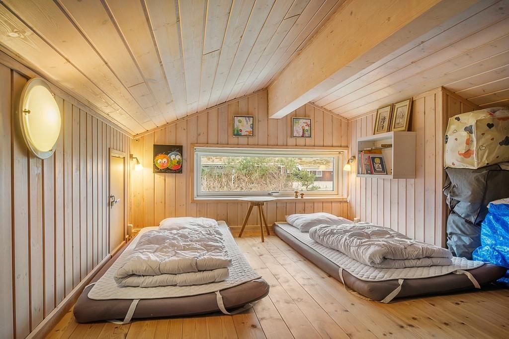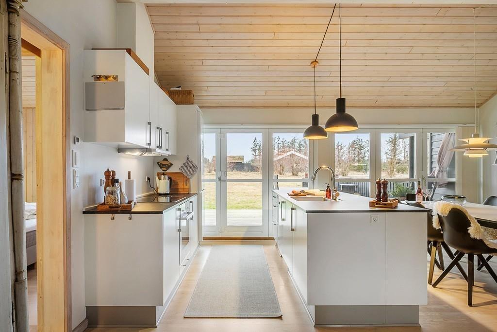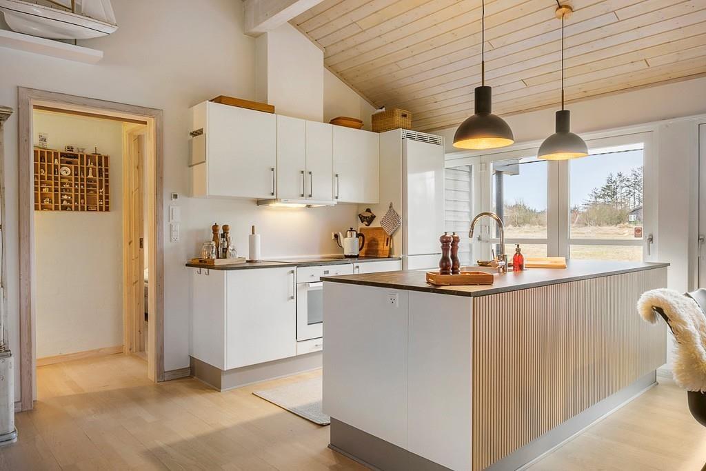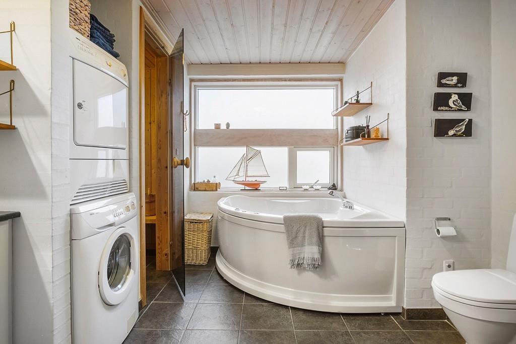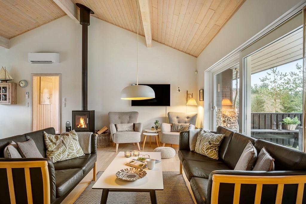 Træd ind i dette lyse og moderne sommerhus, hvor den stilrene indretning skaber en indbydende atmosfære. Store vinduer lukker naturen ind, og de velvalgte materialer giver en følelse af ro og luksus. Det åbne opholdsrum gør det nemt at samles, hvad enten det er til middag ved spisebordet eller til afslapning foran den varme brændeovn. Huset rummer desuden en praktisk hems, som både børn og voksne vil elske som et ekstra hyggeligt opholdssted, om det er til at spille eller slappe af med en god bog. Det moderne køkken er funktionelt og lækkert, og indbyder til både afslappet madlavning og hyggelige stunder sammen omkring måltiderne. Når du har nydt maden, kan du tage et velfortjent spabad eller slappe af i saunaen – den perfekte måde at afslutte en dag i sommerhuset.