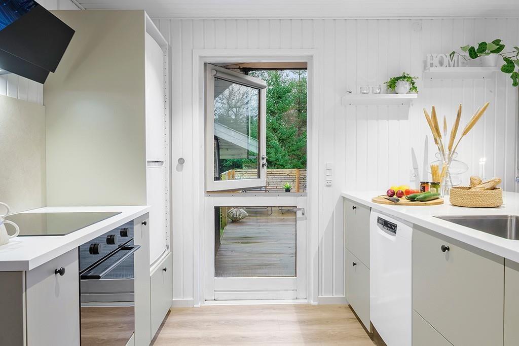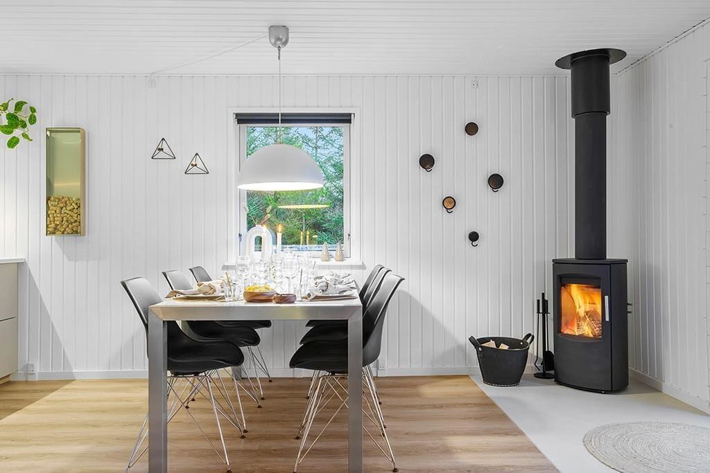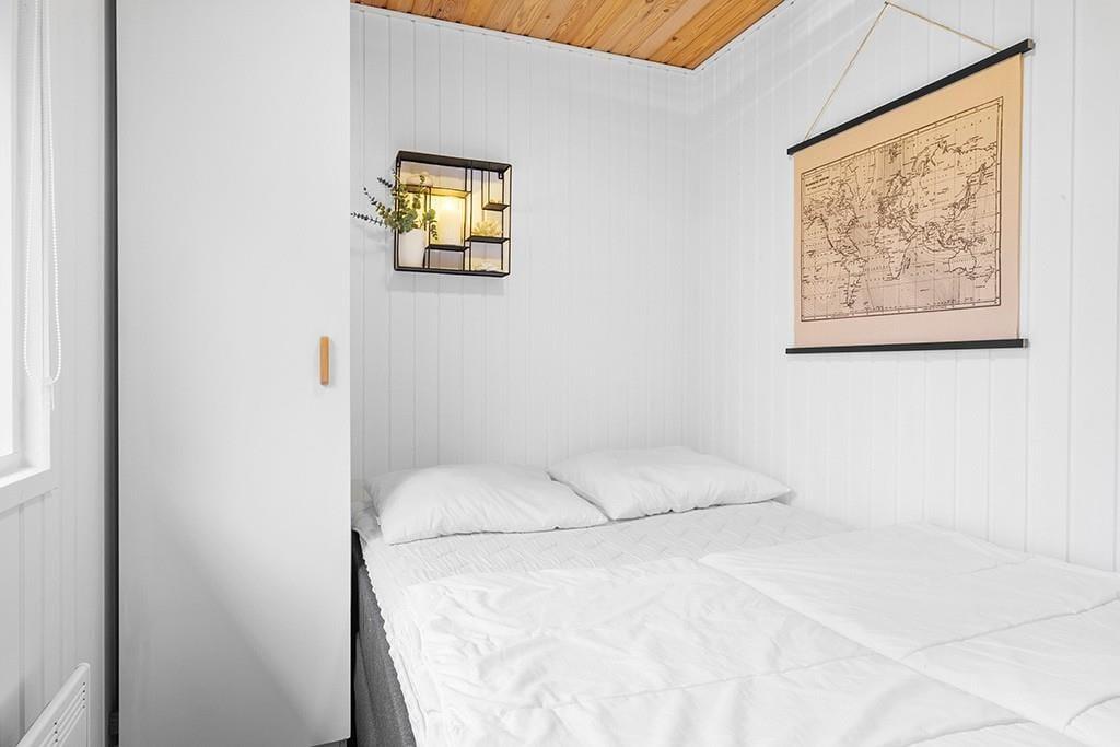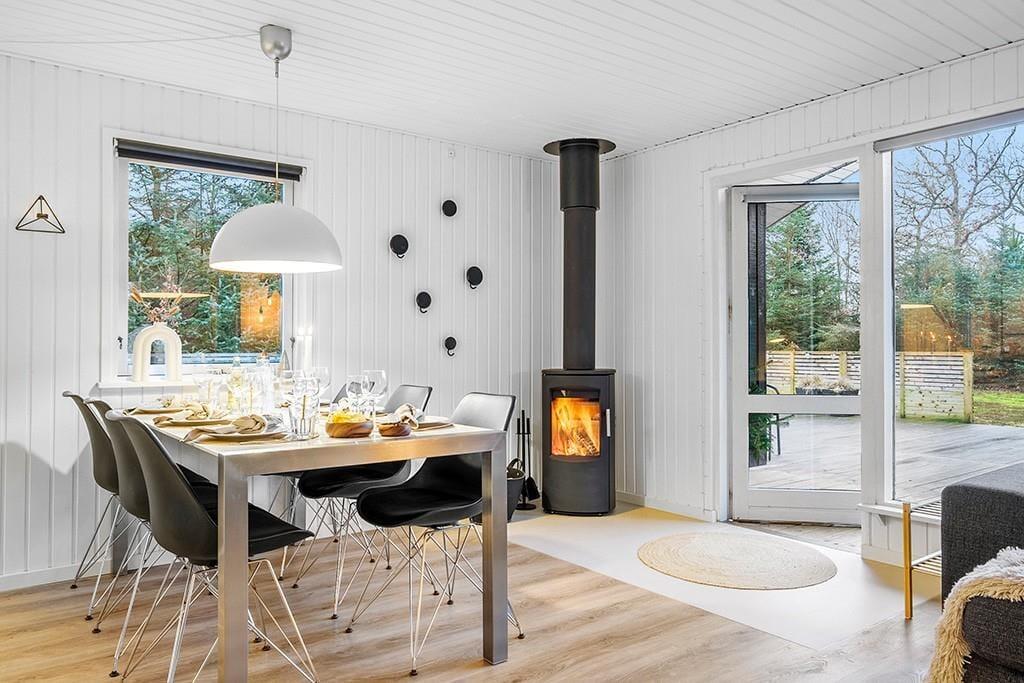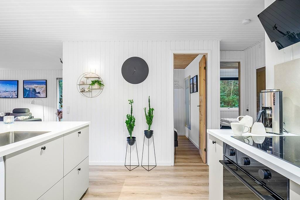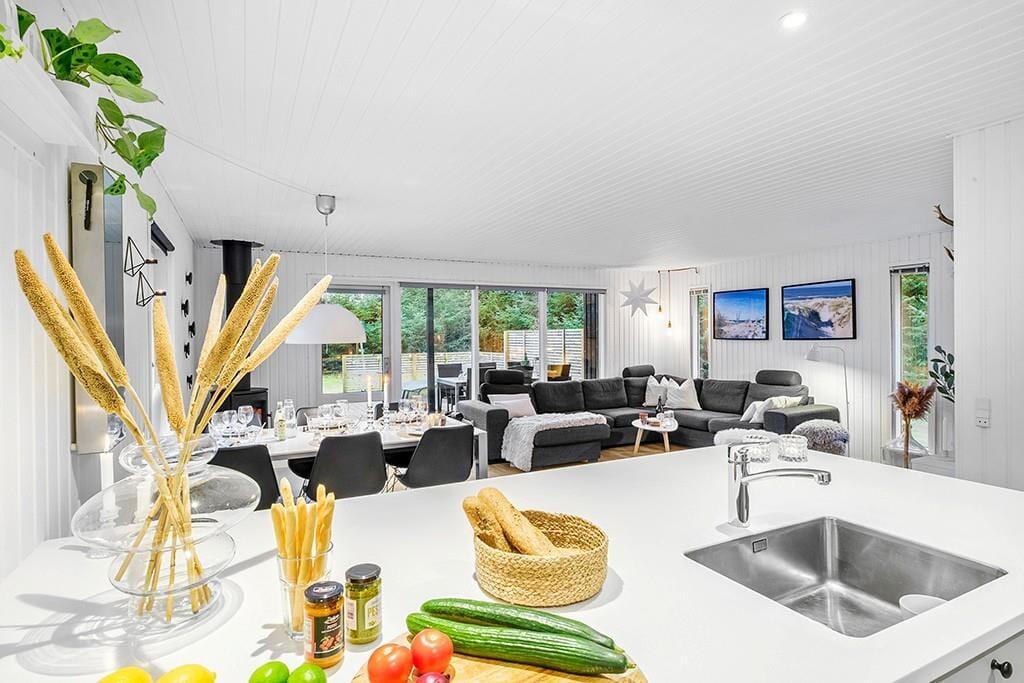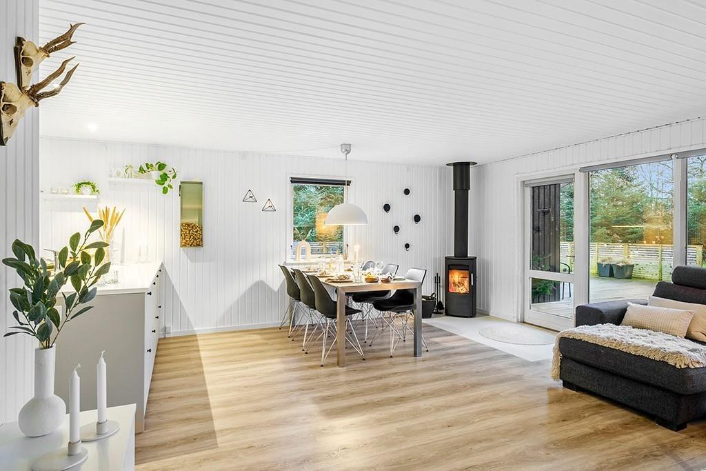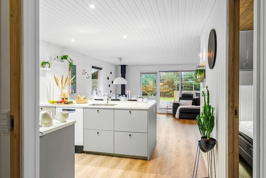 Indenfor mødes du af et smukt renoveret sommerhus med en rolig og eksklusiv atmosfære. De lyse farver og den stilrene indretning går igen i hele huset og skaber en behagelig sammenhæng fra rum til rum. Opholdsrummet samler køkken, spiseplads og stue i ét, så ferien kan leves i fællesskab. Uanset om du står og tryller i køkkenet, dækker op til lange middage eller slapper af i sofaen med en god bog. Køkkenet fremstår moderne og gennemtænkt med blandt andet en elegant indbygningsovn, der passer perfekt ind i det stilrene udtryk. De store vinduespartier lukker dagslyset ind og giver et dejligt kig til den grønne grund udenfor, mens brændeovnen sørger for varme og hygge på køligere dage. Renoveringen fra slutningen af 2025 mærkes tydeligt i både komfort og æstetik, og stemningen er både moderne og hjemlig.