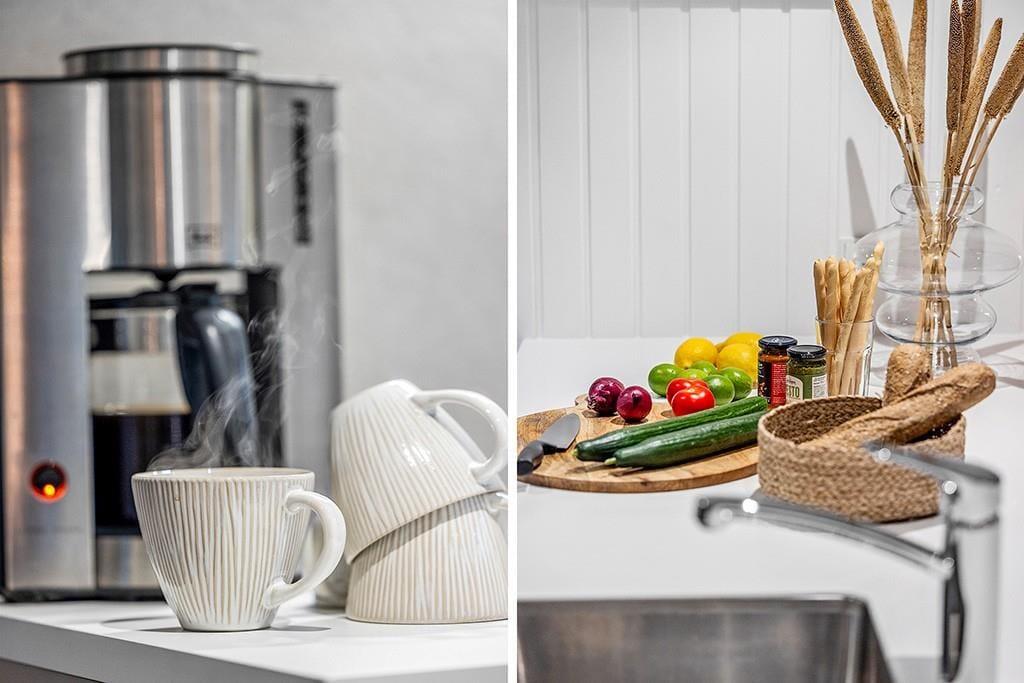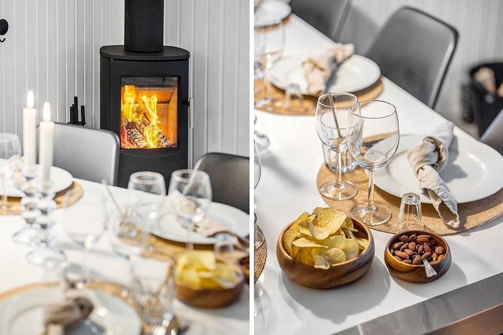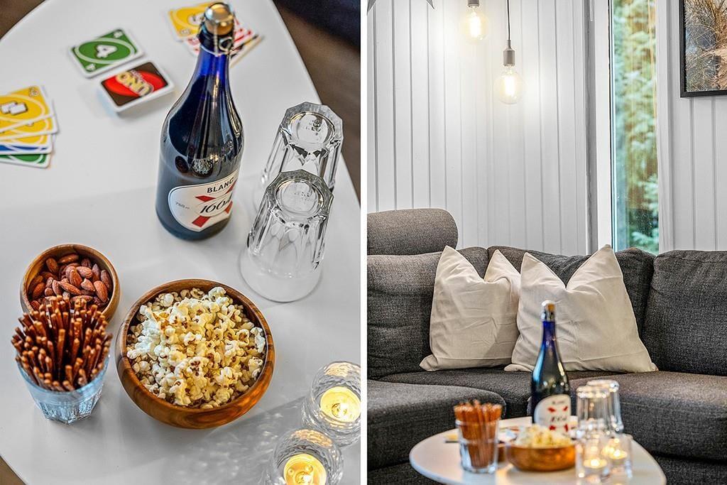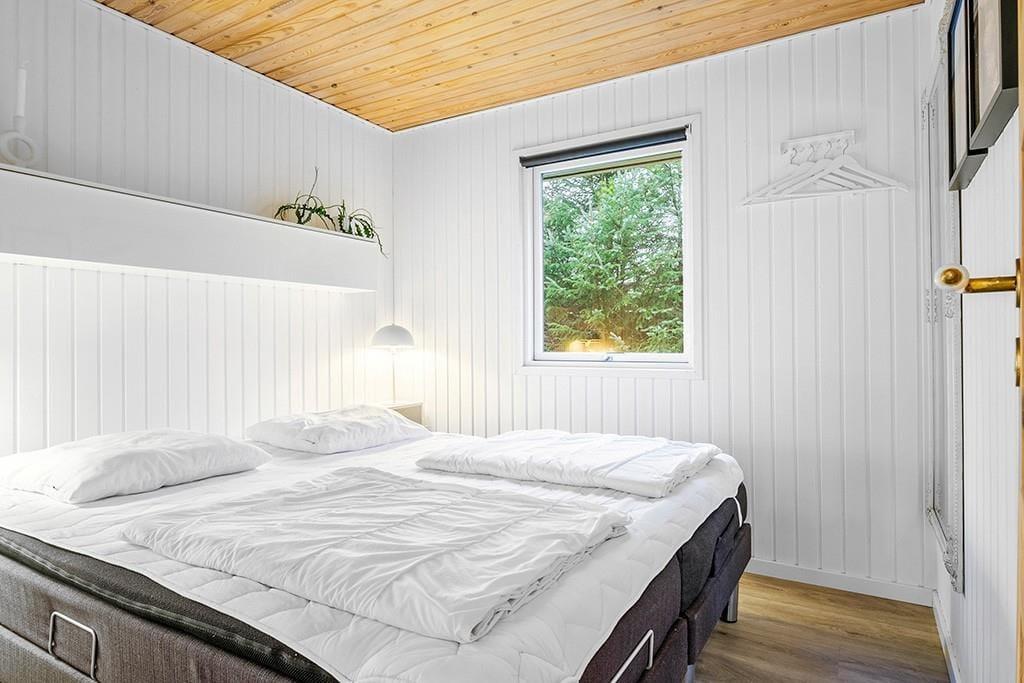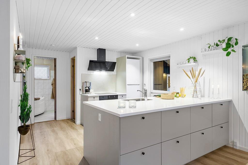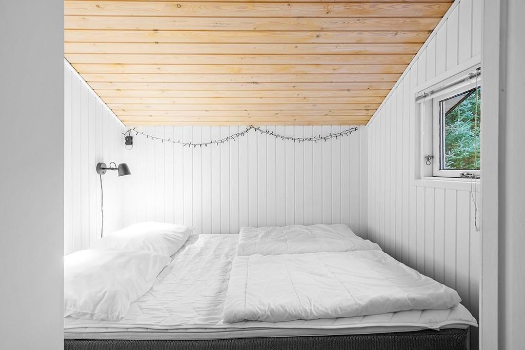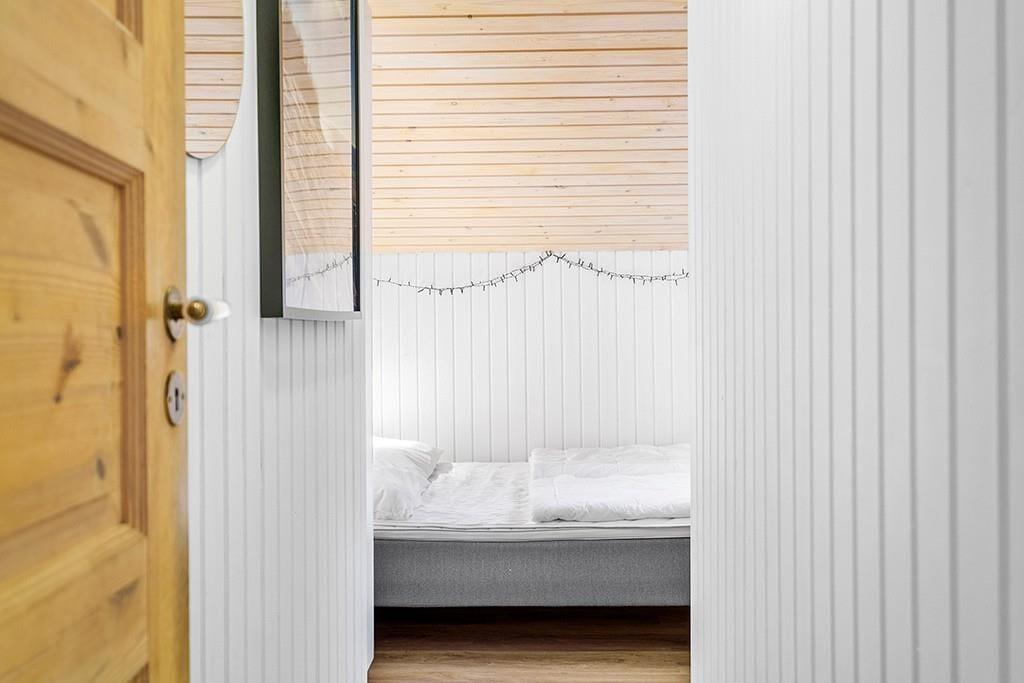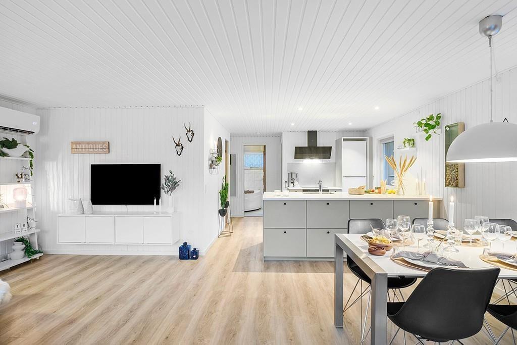 Indenfor mødes du af et smukt renoveret sommerhus med en rolig og eksklusiv atmosfære. De lyse farver og den stilrene indretning går igen i hele huset og skaber en behagelig sammenhæng fra rum til rum. Opholdsrummet samler køkken, spiseplads og stue i ét, så ferien kan leves i fællesskab. Uanset om du står og tryller i køkkenet, dækker op til lange middage eller slapper af i sofaen med en god bog. Køkkenet fremstår moderne og gennemtænkt med blandt andet en elegant indbygningsovn, der passer perfekt ind i det stilrene udtryk. De store vinduespartier lukker dagslyset ind og giver et dejligt kig til den grønne grund udenfor, mens brændeovnen sørger for varme og hygge på køligere dage. Renoveringen fra slutningen af 2025 mærkes tydeligt i både komfort og æstetik, og stemningen er både moderne og hjemlig.