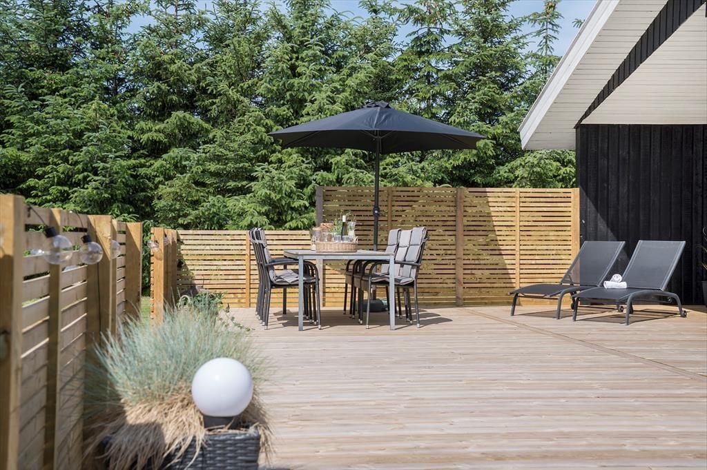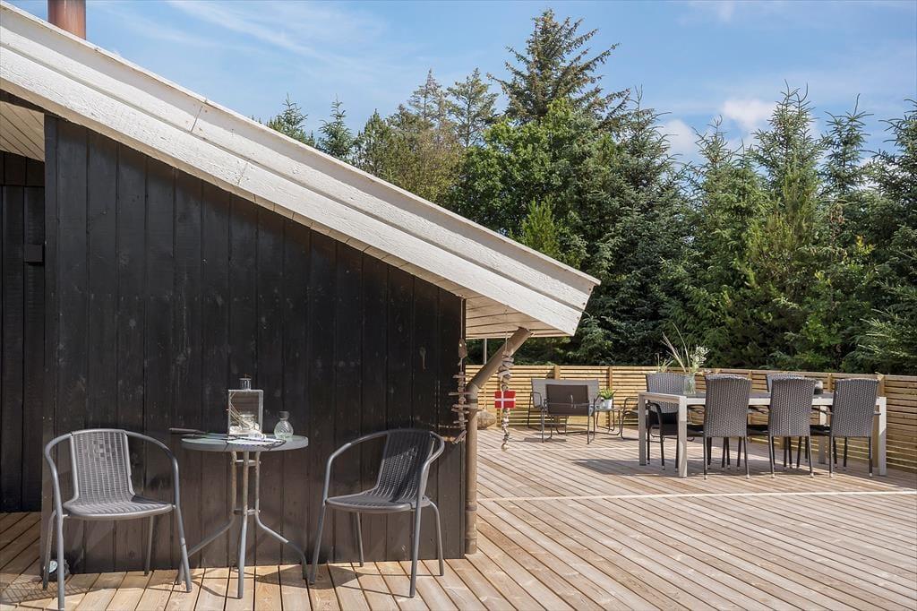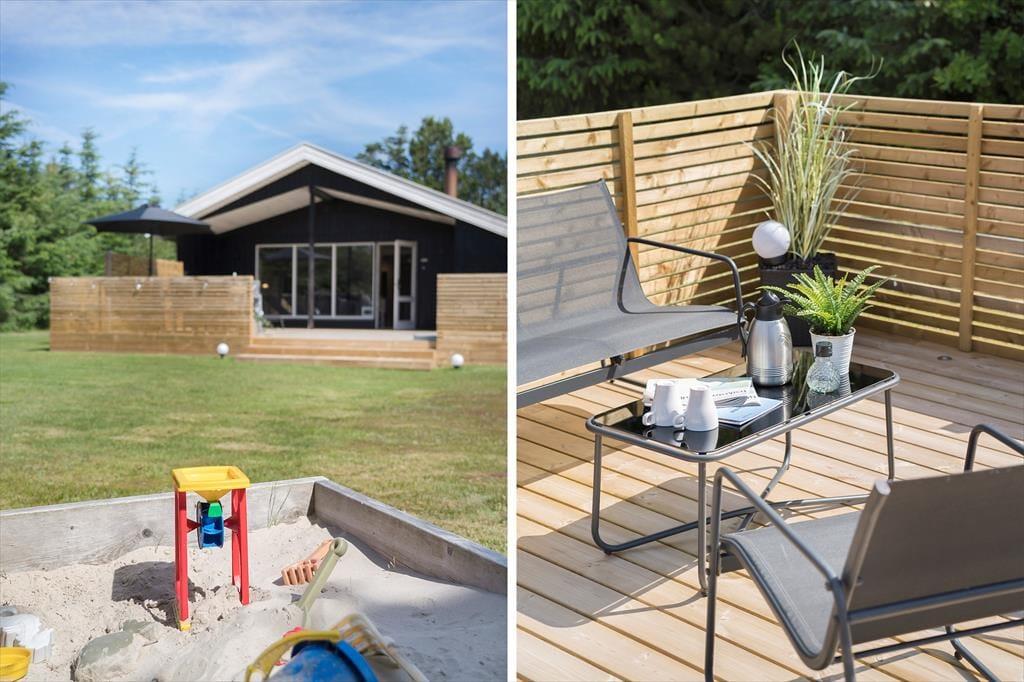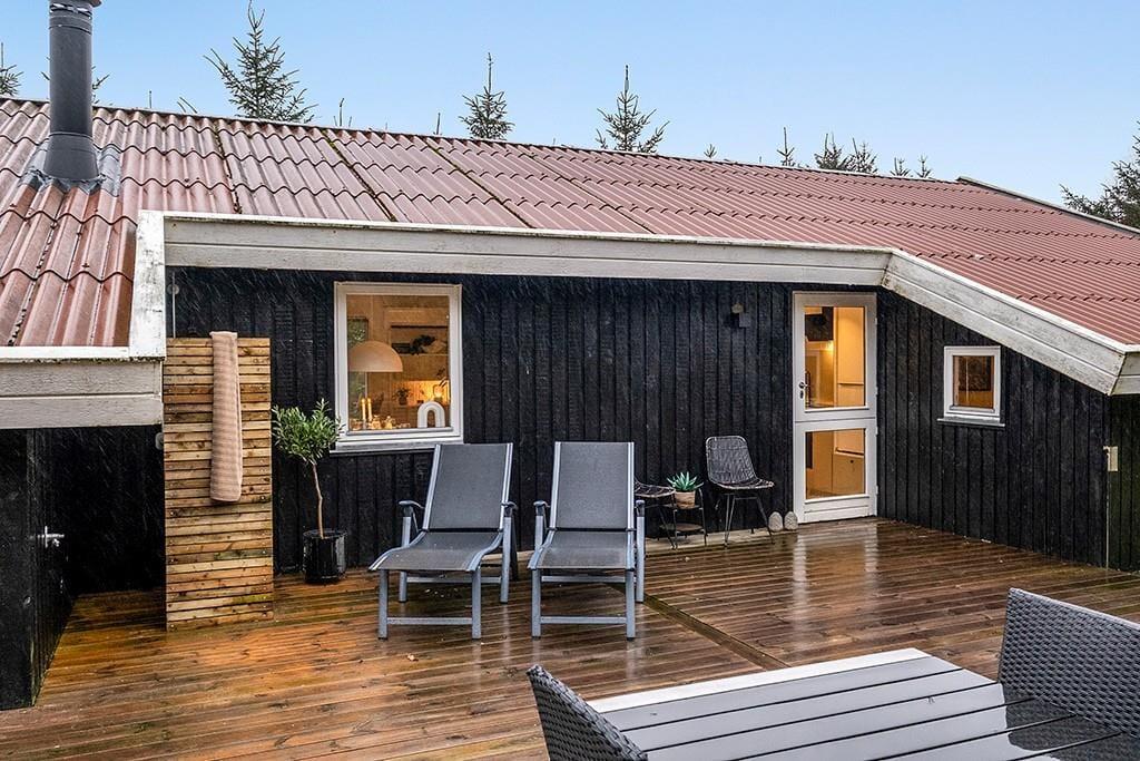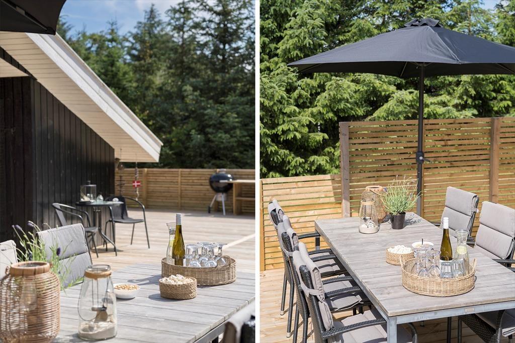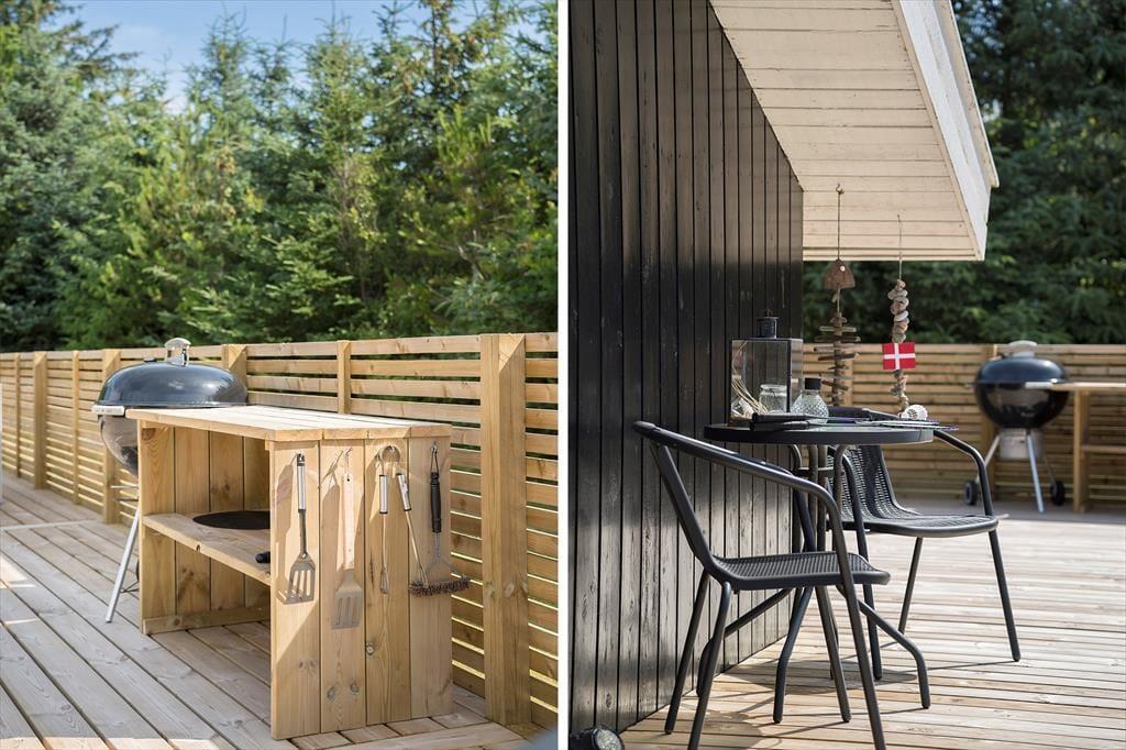 Udelivet får også optimale betingelser på Lille Fiskerbanke 1. Den indbydende terrasse bliver hurtigt feriens naturlige samlingspunkt, hvor du kan nyde solen, roen og de lange sommeraftener. Her er god plads til både afslapning og hyggelige måltider under åben himmel, mens den grønne beplantning omkring grunden skaber læ og privatliv. Efter en tur ved stranden er det ekstra luksuriøst at skylle sand og salt af under sommerhusets udebruser, som har både koldt og varmt vand og kan benyttes året rundt. Uanset årstid er rammerne perfekte til at trække stikket og bare nyde ferien.
