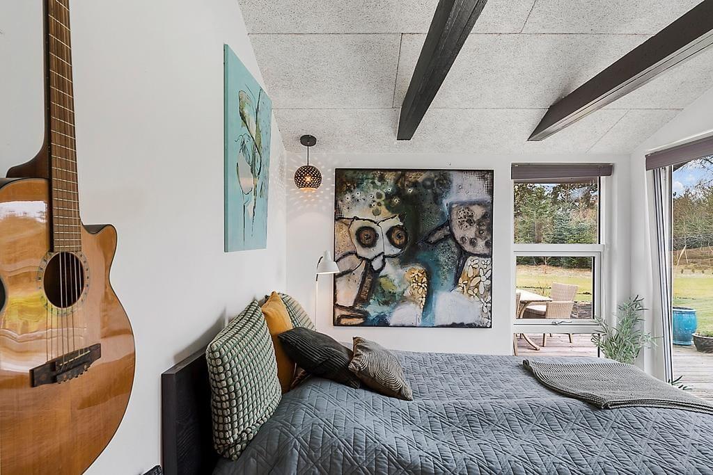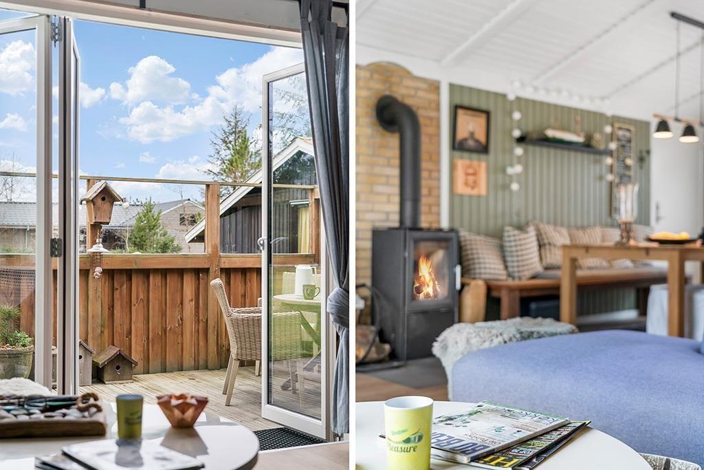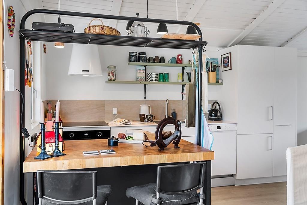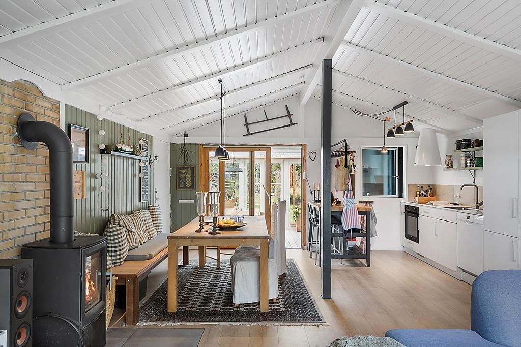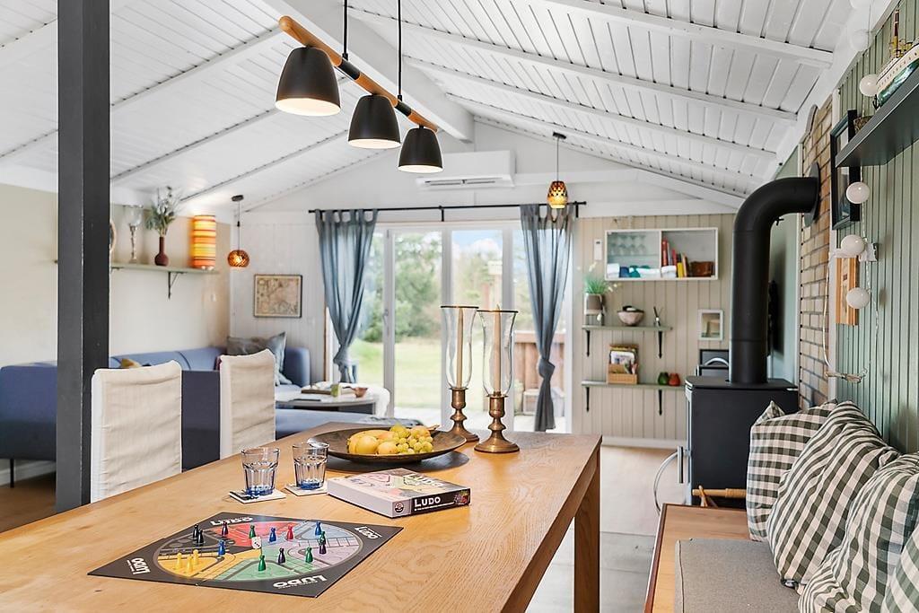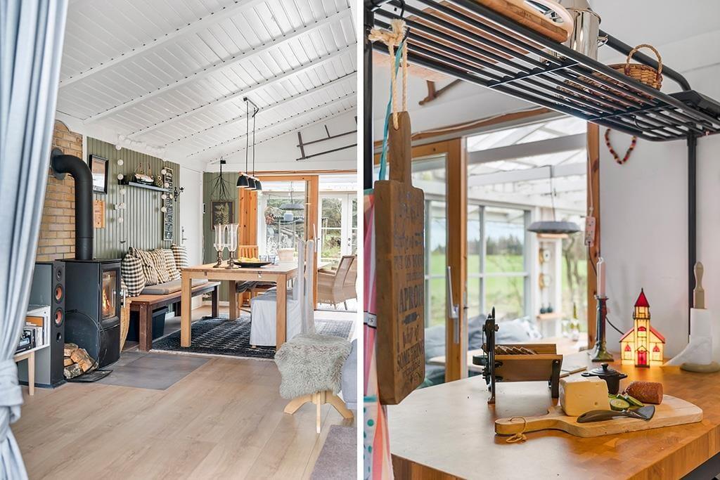Når du træder indenfor i sommerhuset, mødes du af en lys og rummelig indretning, der indbyder til både hygge og samvær. Den åbne stue med brændeovn skaber en varm og hyggelig atmosfære, hvor du kan slappe af med en god bog eller se en film efter en aktiv dag i naturen. Den dejlige udestue fungerer som et ekstra opholdsrum og er perfekt til afslapning, uanset om du vil nyde en morgenkaffe, læse eller blot kigge ud på den store grund. Køkkenet er funktionelt og nemt at arbejde i, så feriemiddage kan tilberedes og nydes i det gode selskab.