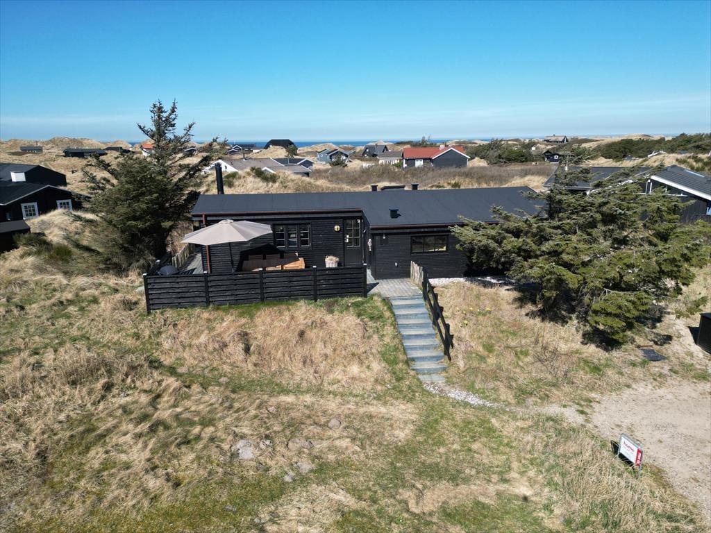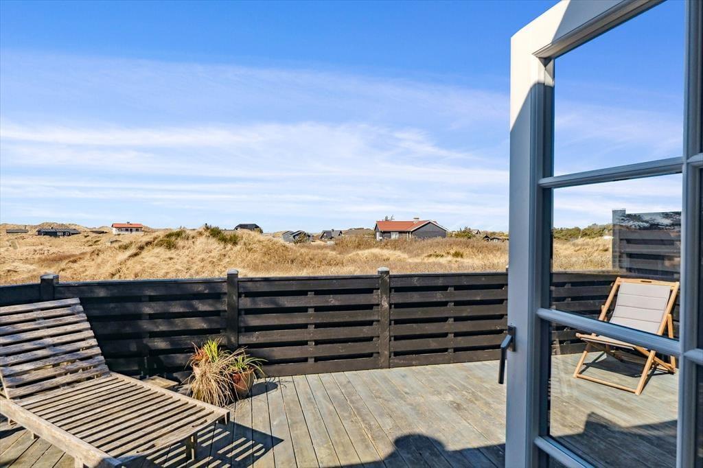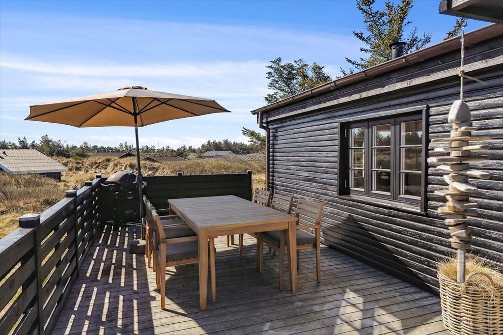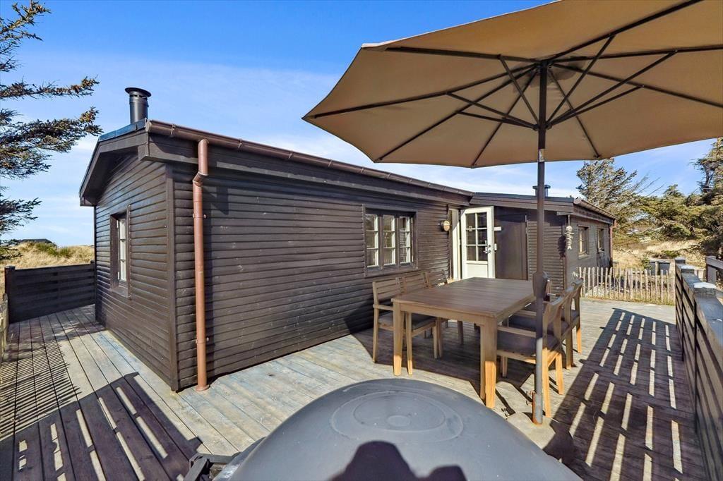 Terrassen er uden tvivl et af sommerhusets højdepunkter. Her kan du starte dagen med en friskbrygget kop kaffe, mens du lader blikket glide ud over Vesterhavet, der ligger blot en kort gåtur væk. Når solen står højt på himlen, er terrassen et dejligt sted at slappe af i havemøblerne, og om aftenen kan du tænde grillen og nyde en middag under åben himmel, mens bølgernes brusen sætter stemningen. Grunden omkring huset er enkel og let at holde, så du kan koncentrere dig om det vigtigste: at nyde roen, udsigten og ferien i fulde drag.