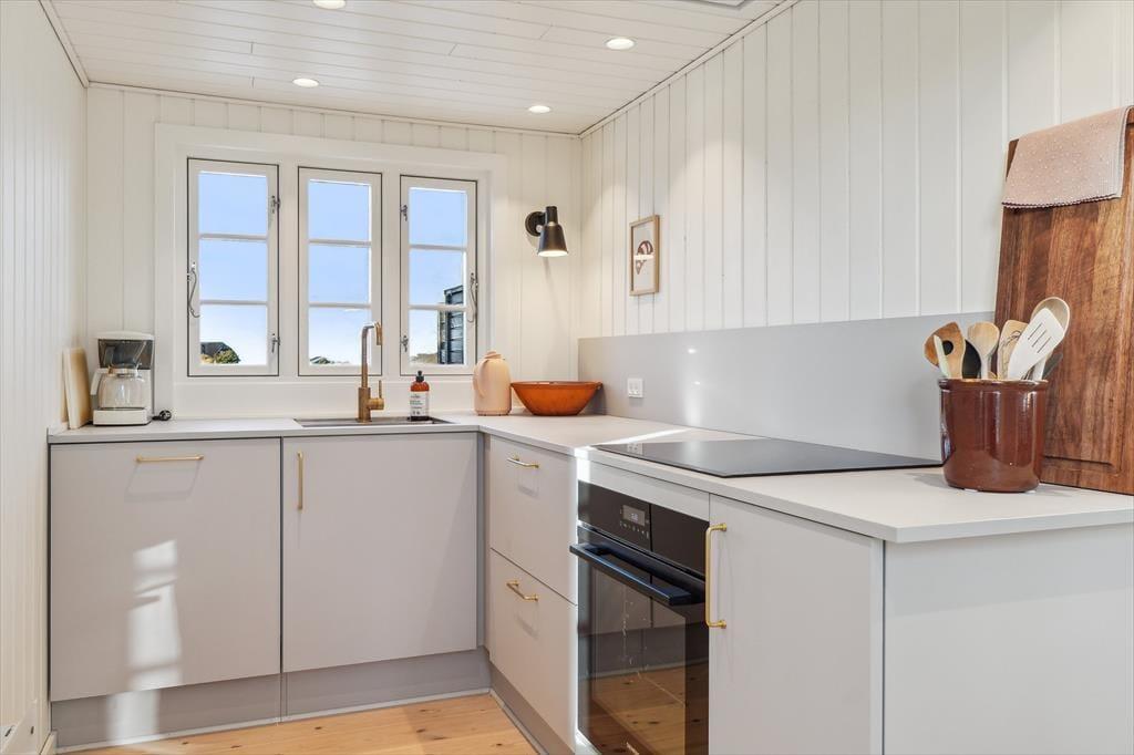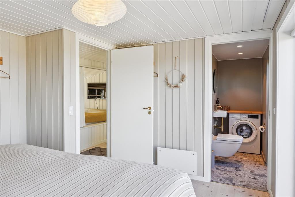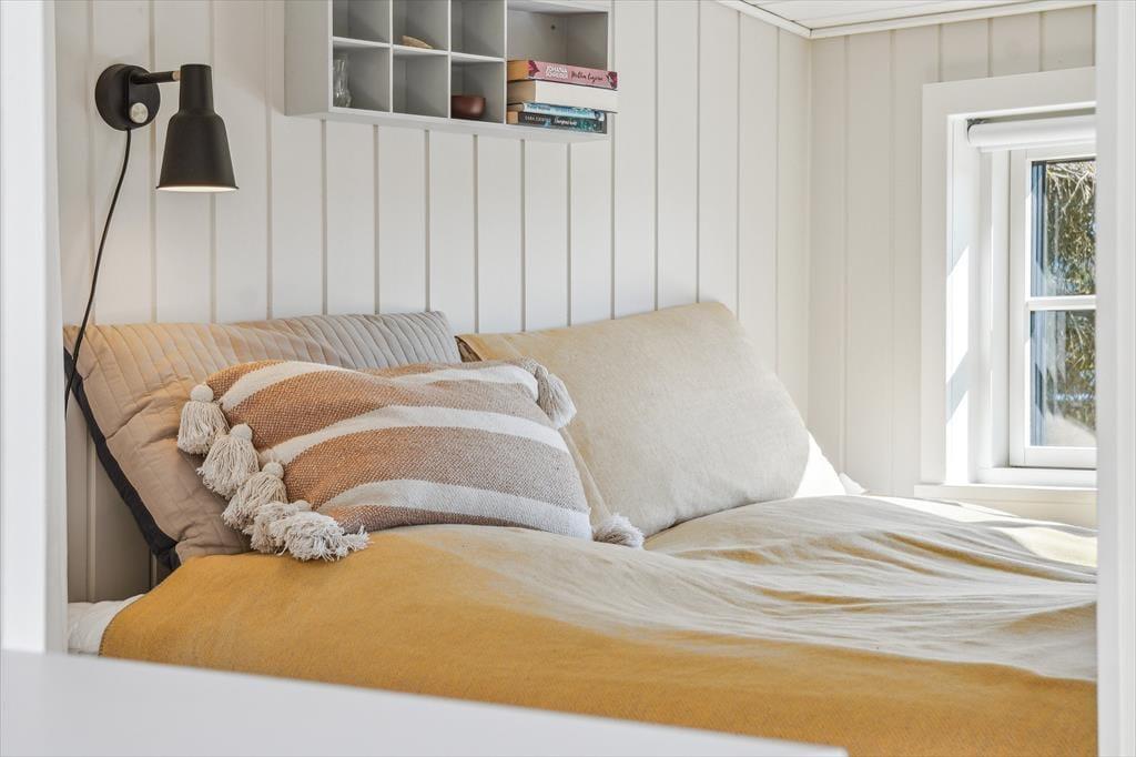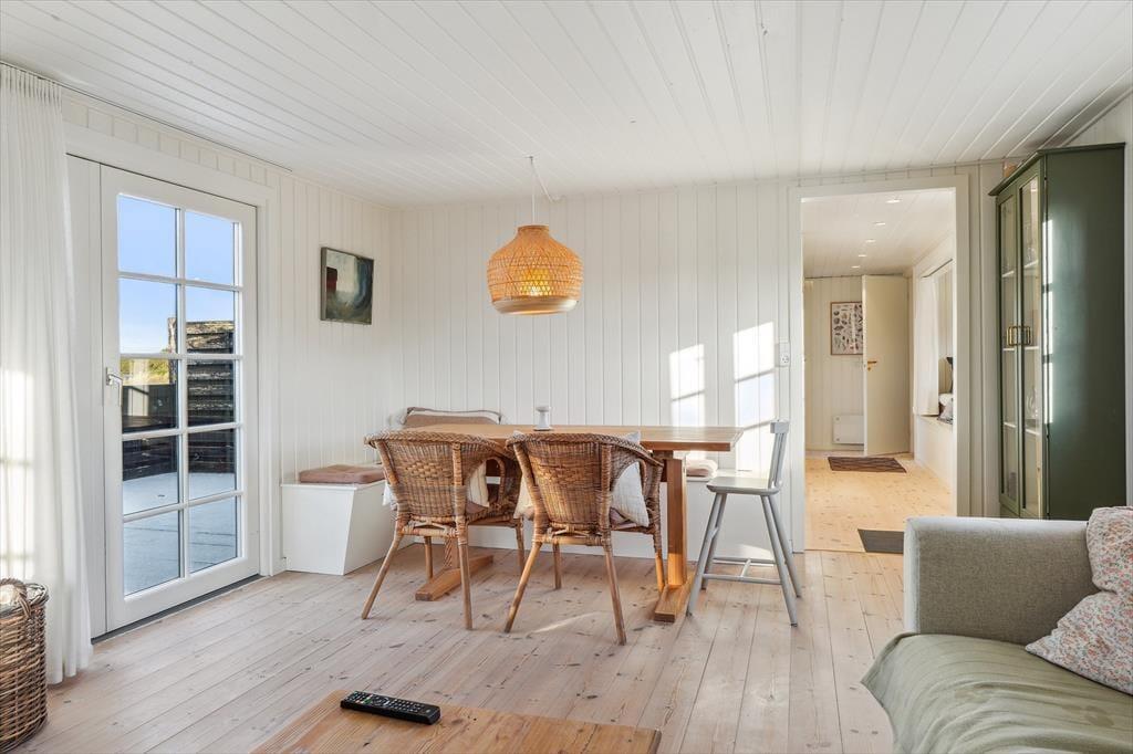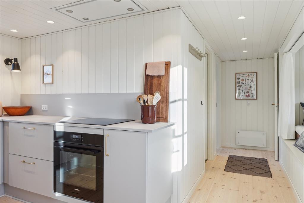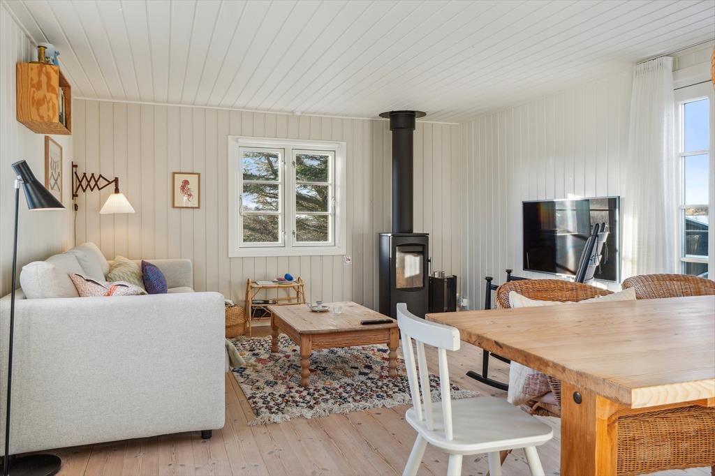 Indenfor mødes du af en varm atmosfære, hvor den moderne renovering smukt spiller sammen med husets sommerhuscharme. Det åbne opholdsrum danner hjertet i huset med en dejlig stueafdeling, hvor du kan finde ro med en god bog, se en film eller hygge foran brændeovnen, når aftenerne bliver kølige. Køkkenet ligger i forlængelse af stuen, så du nemt kan være en del af samværet, mens du tilbereder feriens måltider. Overalt er indretningen præget af lyse materialer og en afslappet stil, der indbyder til ægte feriehygge – uanset om I er to eller har børnene med.