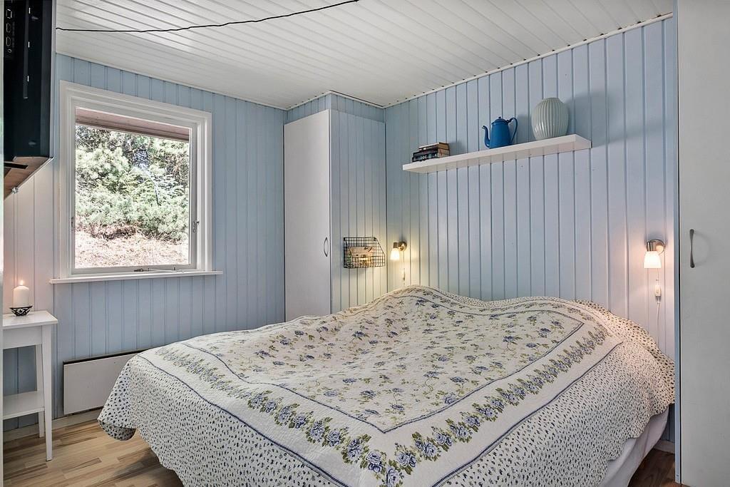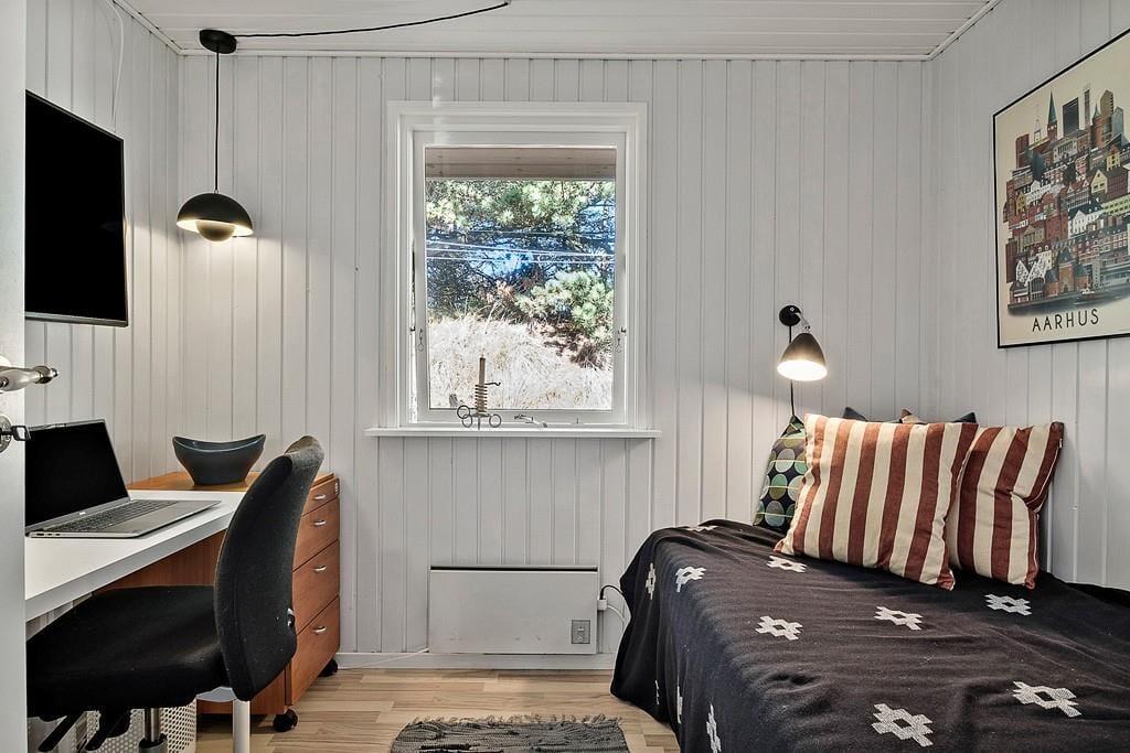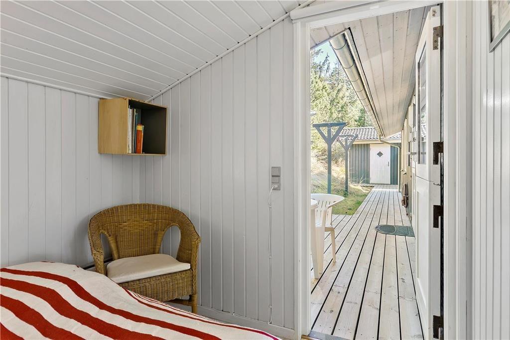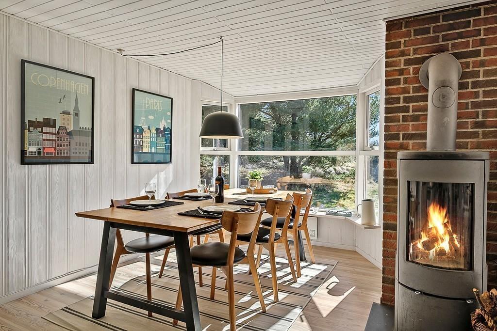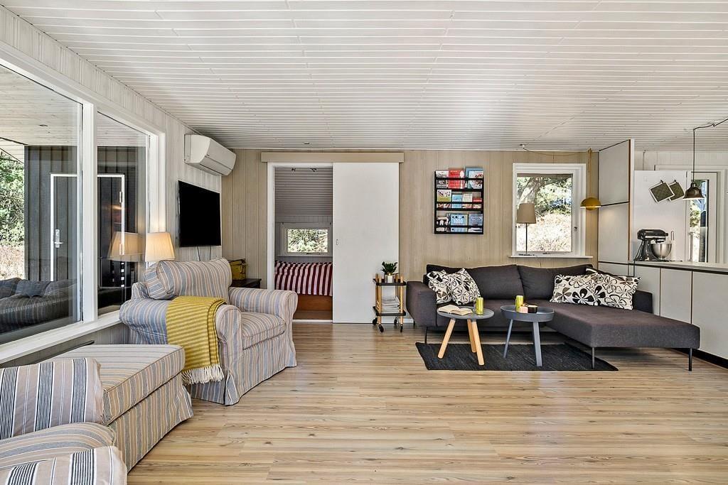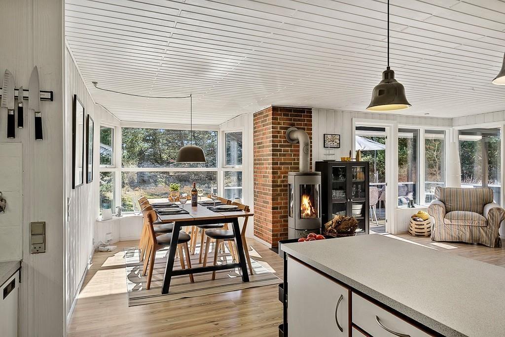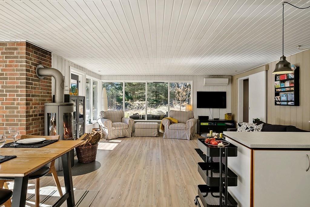 Når du træder indenfor i sommerhuset, vil du straks blive mødt af en hyggelig og lys atmosfære. Stuen er rummelig og har en dejlig brændeovn, som skaber varme og hygge på de køligere dage. Her kan du sidde i den komfortable sofa, nyde varmen fra ilden og måske læse en god bog eller se en film med familien. De store vinduespartier bringer naturen ind i huset, og fra stuen er der direkte adgang til terrassen, hvor du kan sidde og nyde solens stråler. Det åbne køkken giver mulighed for at lave måltider, der kan nydes sammen i den indbydende spisestue. Huset rummer flere hyggelige kroge, hvor man kan slappe af, og den smukke indretning bidrager til den fredelige og rolige atmosfære.