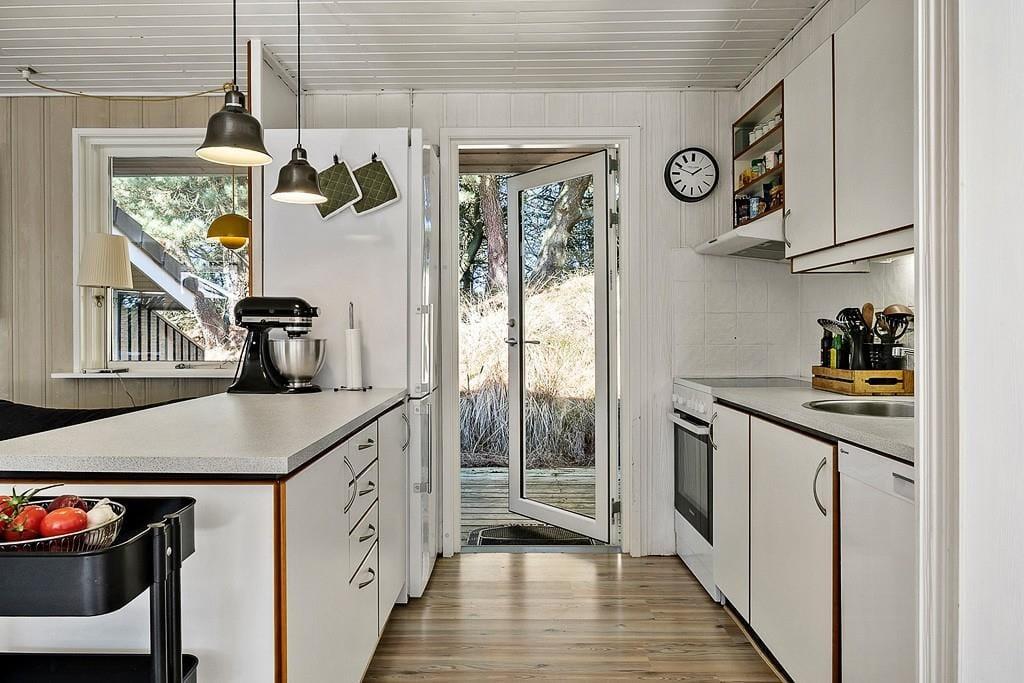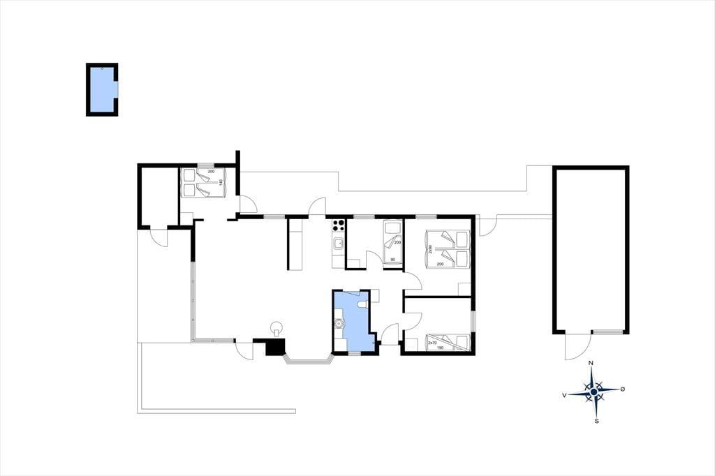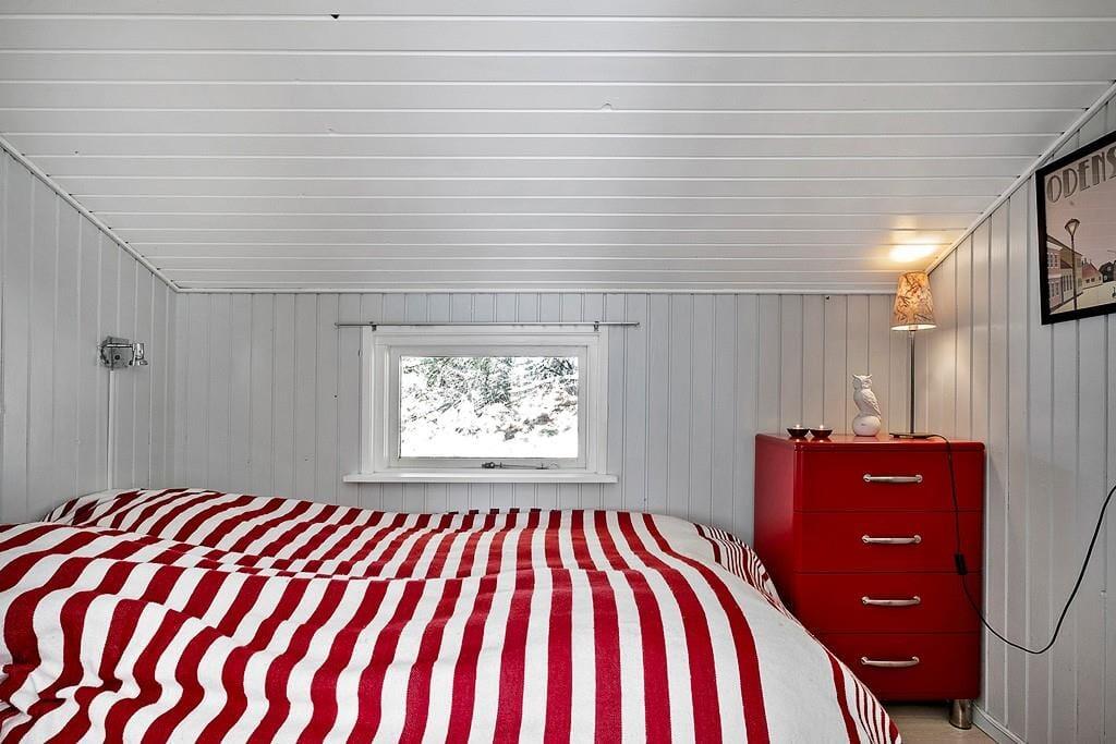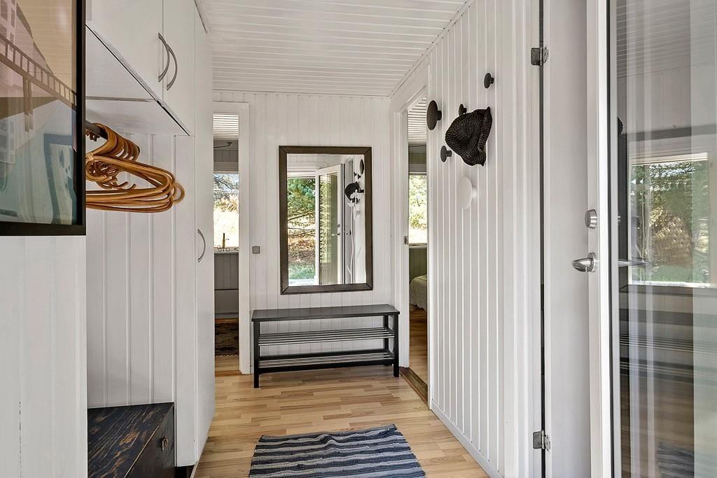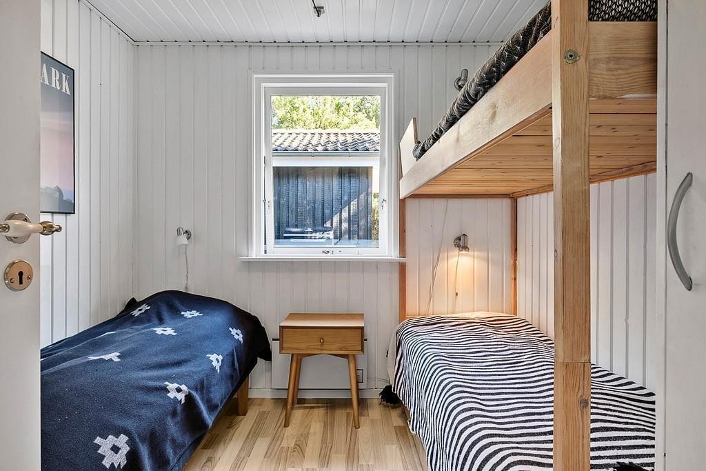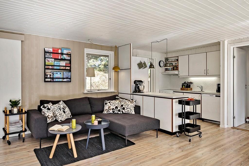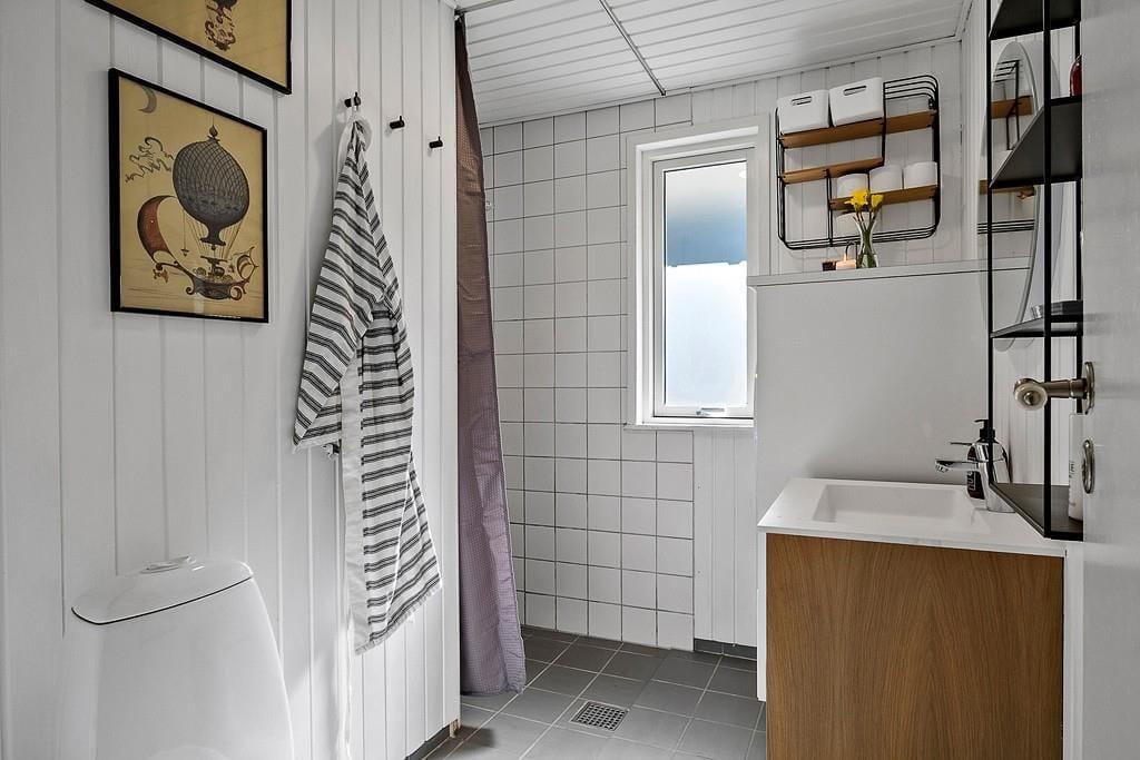Når du træder indenfor i sommerhuset, vil du straks blive mødt af en hyggelig og lys atmosfære. Stuen er rummelig og har en dejlig brændeovn, som skaber varme og hygge på de køligere dage. Her kan du sidde i den komfortable sofa, nyde varmen fra ilden og måske læse en god bog eller se en film med familien. De store vinduespartier bringer naturen ind i huset, og fra stuen er der direkte adgang til terrassen, hvor du kan sidde og nyde solens stråler. Det åbne køkken giver mulighed for at lave måltider, der kan nydes sammen i den indbydende spisestue. Huset rummer flere hyggelige kroge, hvor man kan slappe af, og den smukke indretning bidrager til den fredelige og rolige atmosfære.