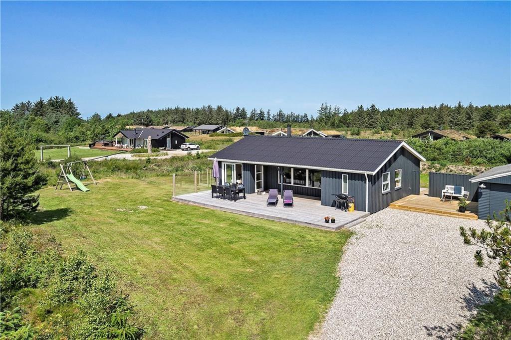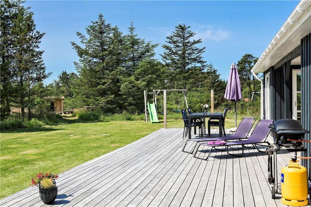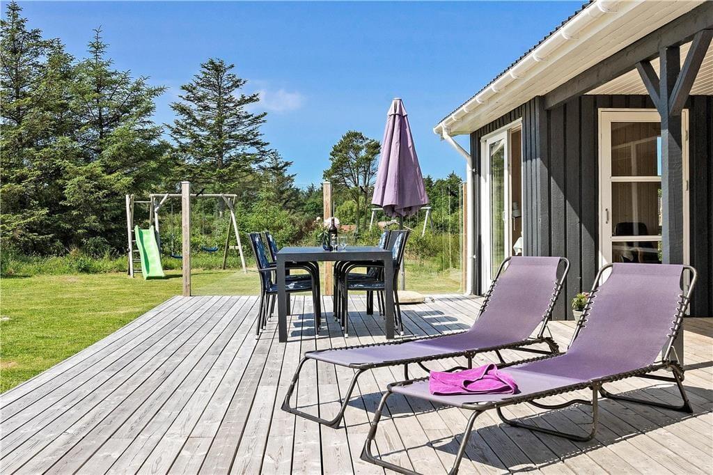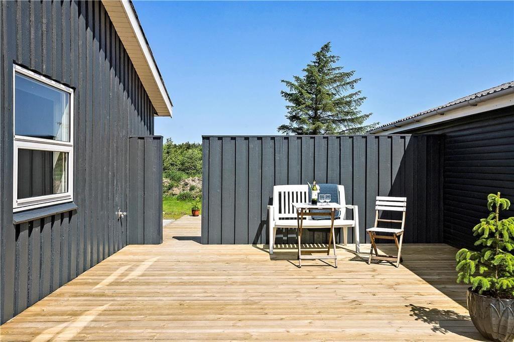 Fra stuen og køkkenet kan man lukke op til terrassen, som er dejlig ugenert og med et godt overblik over plænen med gyngestativ og sandkasse. Sommerhuset er med sin beliggenhed på denne hyggelige sommerhusvej ideel for de, som ønsker lidt ekstra plads at boltre sig på.