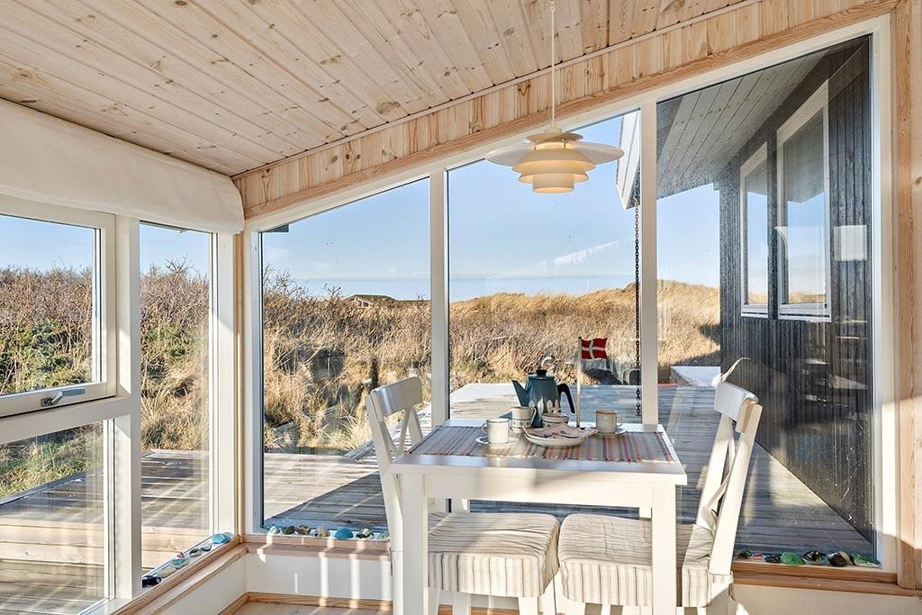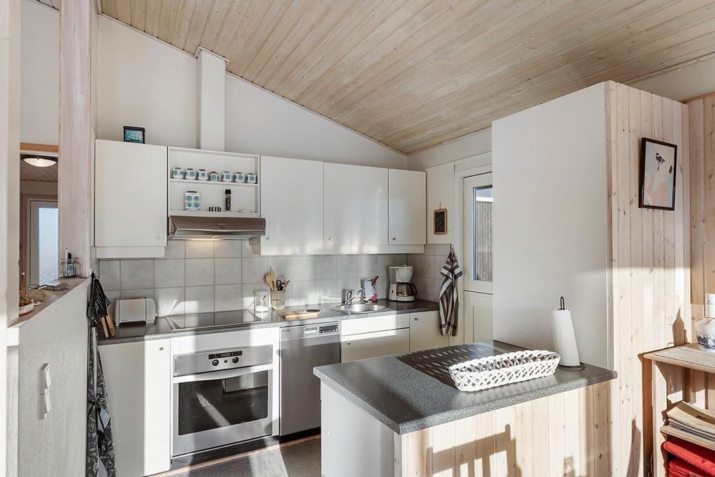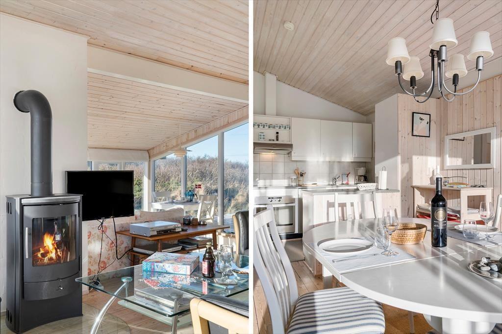 Når du træder indenfor i dette indbydende sommerhus, vil du straks mærke den hjemlige atmosfære, der er skabt med et åbent og lyst opholdsmiljø. De store vinduer, som giver en spektakulær udsigt over det omkringliggende landskab, trækker naturen helt ind i stuen. Her kan du slappe af og nyde livet med udsigt til den vidtstrakte natur, hvor lyden af fuglesang og den friske luft skaber en perfekt ramme for ro og velvære. Det åbne køkken og den rummelige opholdsstue indbyder til fællesskab og hyggelige stunder, hvad enten det er tid til middag, spil eller afslapning foran brændeovnen. Lyset og naturen giver en følelse af at være tættere på naturen, samtidig med at du har alle de moderne bekvemmeligheder lige ved hånden.