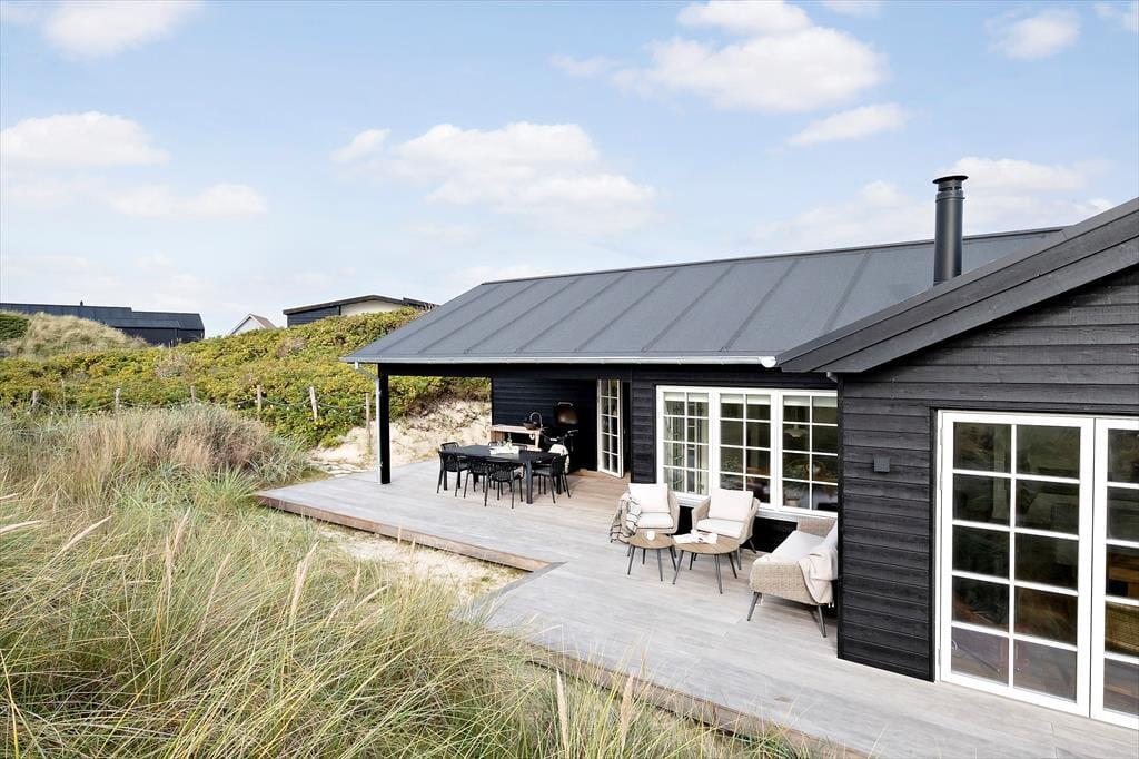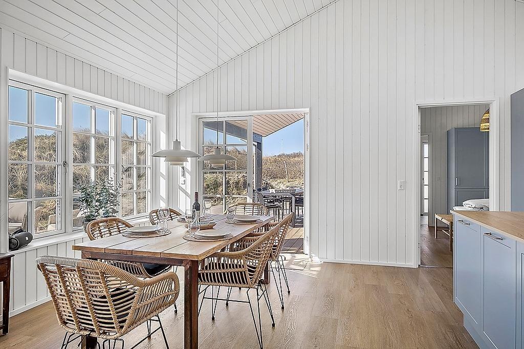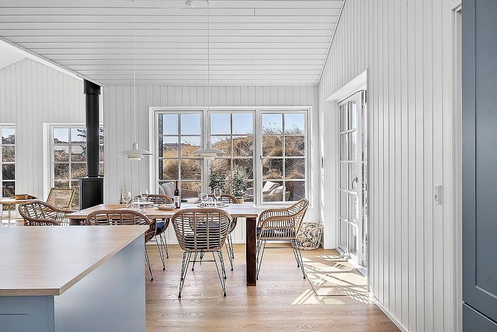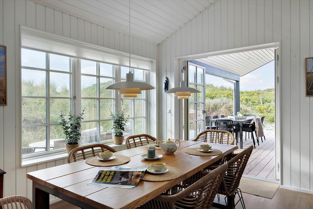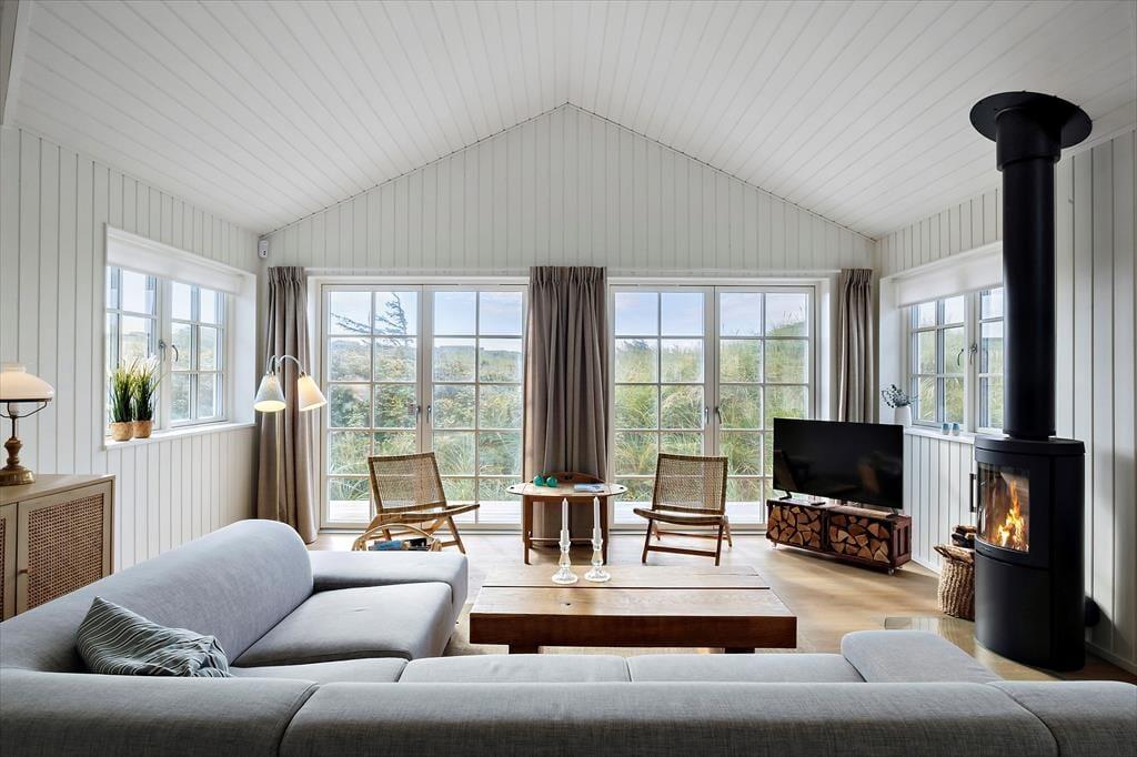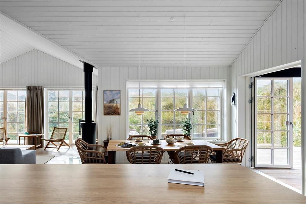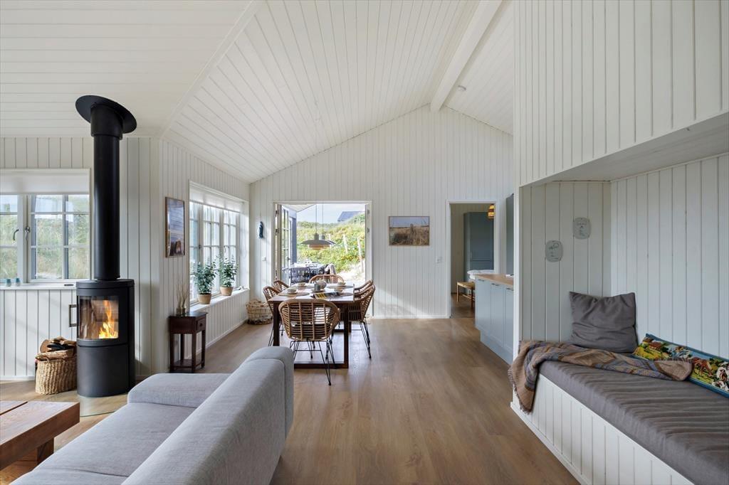 Sommerhuset byder dig velkommen med sin varme atmosfære og hyggelige indretning. De store vinduespartier trækker lyset og naturen helt ind i opholdsrummet, hvor du kan nyde udsigten til de omkringliggende klitter. Her er der god plads til både familiehygge og afslapning, hvad enten du vil sætte dig til rette i sofaen med en god bog eller samles om spisebordet til en lækker middag. Det veludstyrede køkken gør det let at trylle lækre retter frem, og efter en dag fuld af oplevelser kan du forkæle dig selv med en tur i husets sauna, hvor du kan lade varmen omfavne dig, mens du nyder udsigten til naturen.
